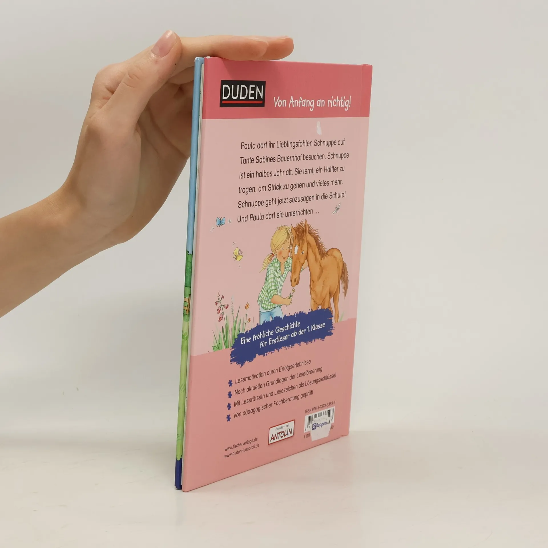 Duden – von Anfang an richtig! Lesenlernen leicht gemacht: Erstlesespaß für Kinder ab der 1. Klasse Paula darf ihr Lieblingsfohlen Schnuppe auf Tante Sabines Bauernhof besuchen! Schnuppe ist schon ein halbes Jahr alt und macht die ersten Schritte in die Selbstständigkeit. Es lernt, ein Halfter zu tragen, am Strick zu gehen und vieles mehr. Schnuppe geht jetzt sozusagen in die Schule! Und Paula darf sie unterrichten … Eine liebevolle Geschichte um eine Freundschaft zwischen Zwei- und Vierbeiner. So geht zeitgemäße Leseförderung: Diese spannende und mit viel Liebe zum Detail illustrierte Erstlesegeschichte aus der Reihe „Leseprofi“ von FISCHER Duden Kinderbuch sorgt garantiert für Lesespaß. Der Text ist genau auf die Bedürfnisse der Jungen und Mädchen zugeschnitten. So erleben sie schnell motivierende Erfolge. Kleine, abwechslungsreiche Rätsel zur Sicherung des Textverständnisses begleiten beim Lesen. Ein interaktives Lesezeichen dient als Lösungsschlüssel. Alle Titel der Reihe werden bei Antolin gelistet und von einer pädagogischen Fachberatung geprüft.