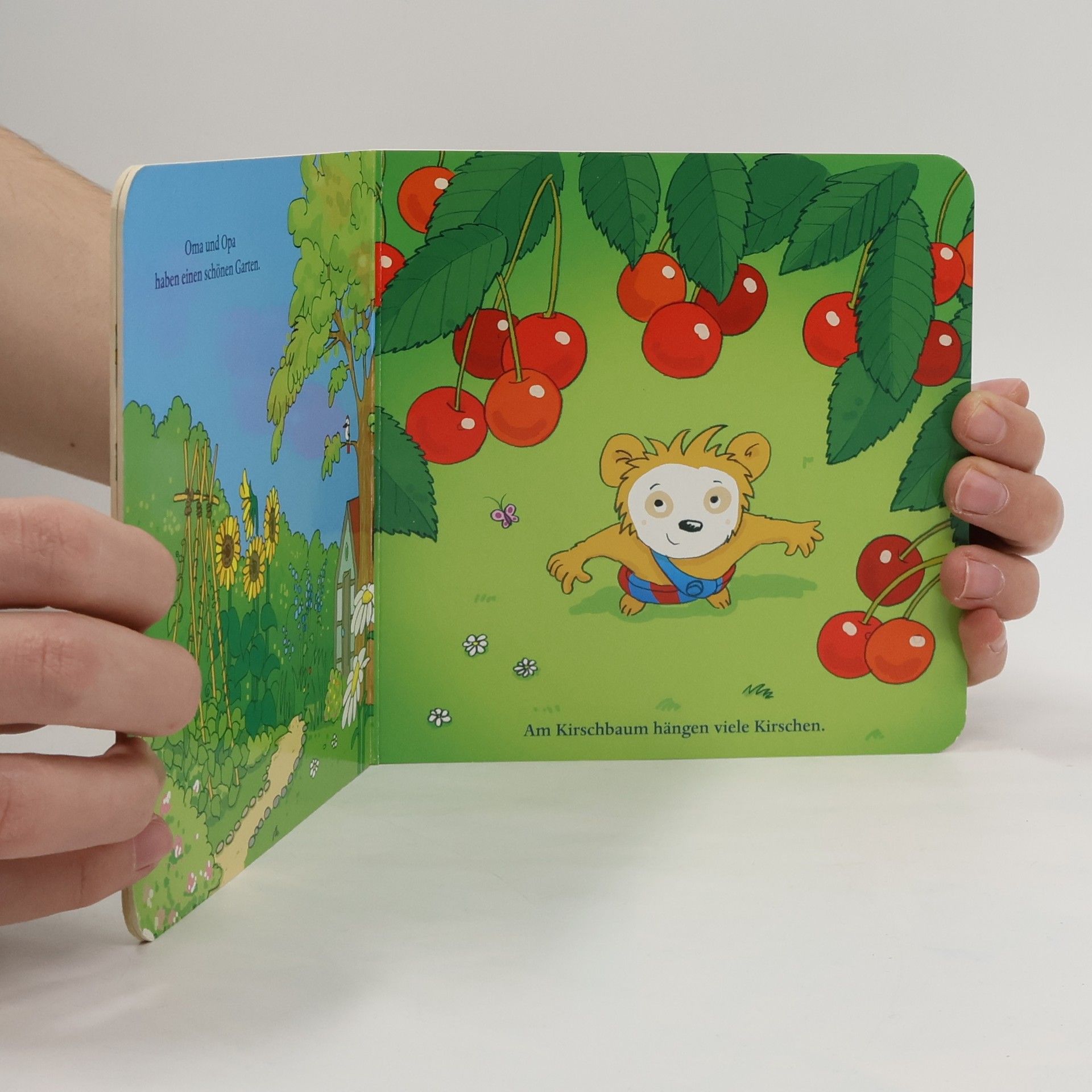 Bobo besucht seine Großeltern in ihrem Garten. Er pflückt Kirschen, hilft beim Blumen gießen, fährt mit dem Dreirad und lässt sich von Opa etwas vorlesen. Im Liegestuhl schläft er ein.