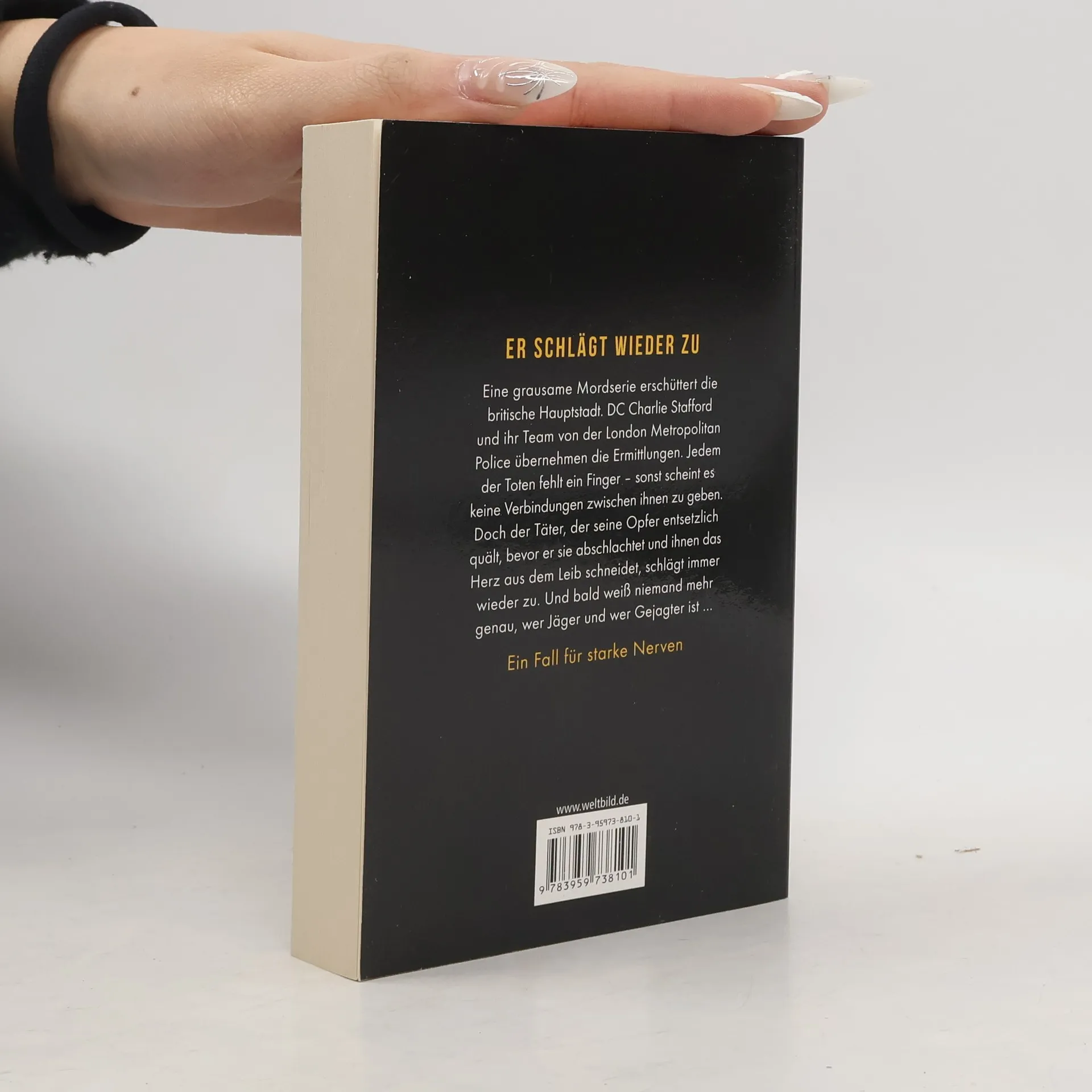 Er schlägt wieder zu Eine grausame Mordserie erschüttert die britische Hauptstadt. DC Charlie Stafford und ihr Team von der London Metropolitan Police übernehmen die Ermittlungen. Jedem der Toten fehlt ein Finger - sonst scheint es keine Verbindungen zwischen ihnen zu geben. Doch der Täter, der seine Opfer entsetzlich quält, bevor er sie abschlachtet und ihnen das Herz aus dem Leib schneidet, schlägt immer wieder zu. Und bald weiß niemand mehr genau, wer Jäger und wer Gejagter ist ... Ein Fall für starke Nerven
