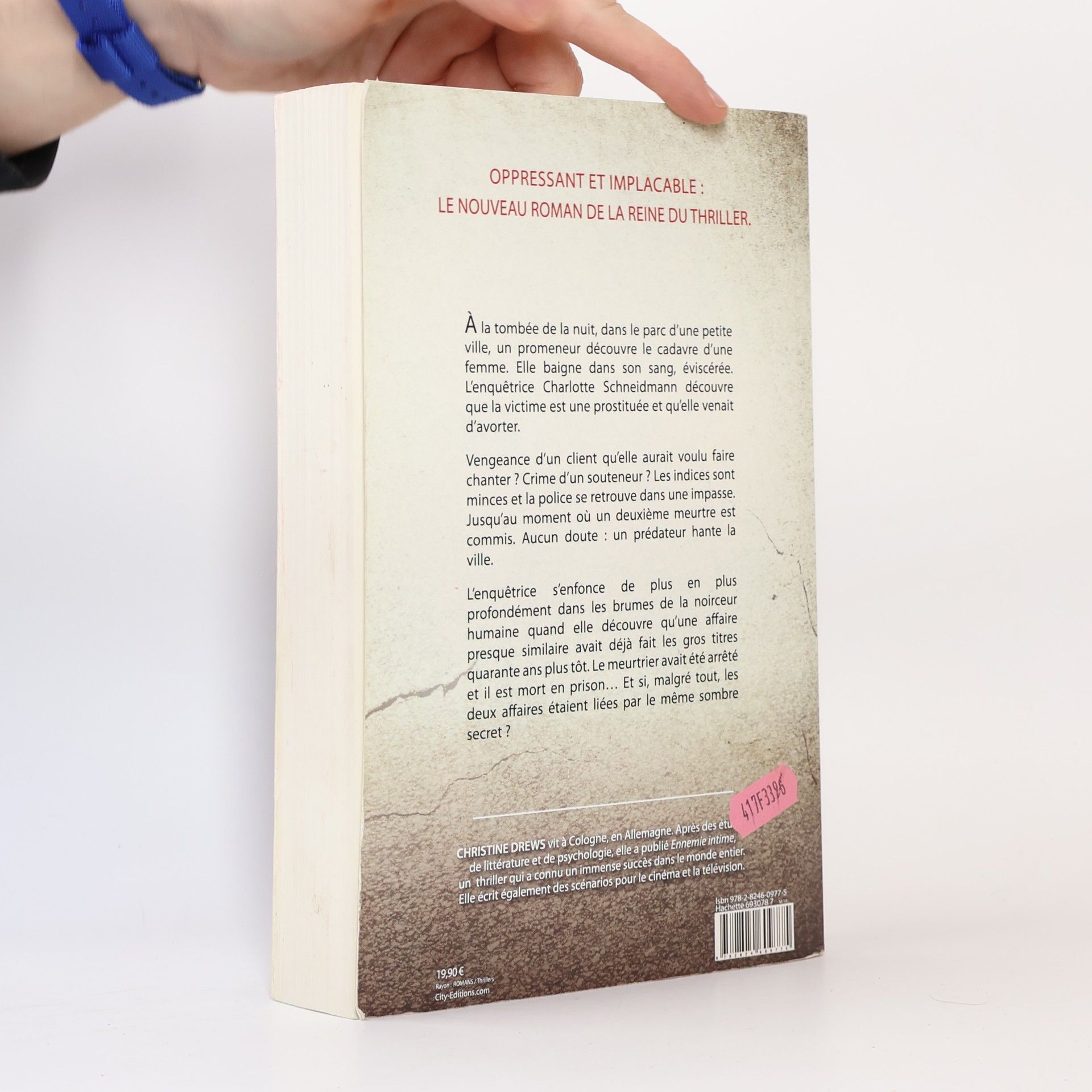 A la tombée de la nuit dans le parc d'une petite ville, un promeneur découvre le cadavre d'une femme. Elle baigne dans son sang, éviscérée. L'enquêtrice Charlotte Schneidmann découvre que la victime est une prostituée et qu'elle venait d'avorter. Vengeance d'un client qu'elle aurait voulu faire chanter ? Crime d'un souteneur ? Les indices sont minces et la police se retrouve dans une impasse. Jusqu'au moment où un deuxième meurtre est commis. Aucun doute : un prédateur hante la ville. L'enquêtrice s'enfonce de plus en plus profondément dans les brumes de la noirceur humaine quand elle découvre qu'une affaire presque similaire avait déjà fait les gros titres quarante ans plus tôt. Le meurtrier avait été arrêté et il est mort en prison... Et si, malgré tout, les deux affaires étaient liées par le même sombre secret ? Oppressant et implacable : le nouveau roman de la reine du thriller.