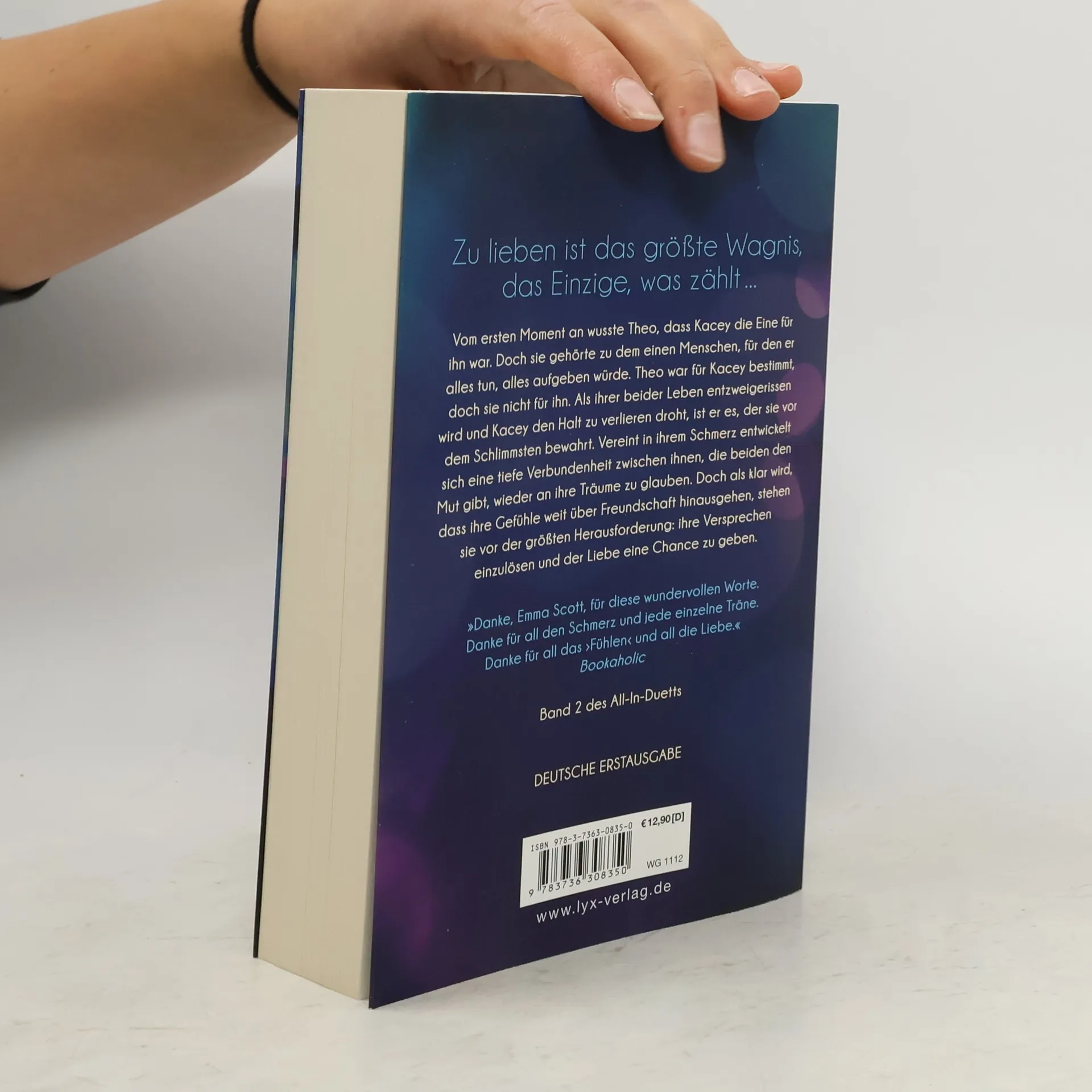 Zu lieben ist das größte Wagnis, das Einzige, was zählt ... Vom ersten Moment an wusste Theo, dass Kacey die Eine für ihn war. Doch sie gehörte zu dem einen Menschen, für den er alles tun, alles aufgeben würde. Theo war für Kacey bestimmt, doch sie nicht für ihn. Als ihrer beider Leben entzweigerissen wird und Kacey den Halt zu verlieren droht, ist er es, der sie vor dem Schlimmsten bewahrt. Vereint in ihrem Schmerz entwickelt sich eine tiefe Verbundenheit zwischen ihnen, die beiden den Mut gibt, wieder an ihre Träume zu glauben. Doch als klar wird, dass ihre Gefühle weit über Freundschaft hinausgehen, stehen sie vor der größten Herausforderung: ihre Versprechen einzulösen und der Liebe eine Chance zu geben. „Danke Emma Scott für diese wundervollen Worte. Danke für all den Schmerz und jede einzelne Träne. Danke für all das “Fühlen„ und all die Liebe.“ Bookaholic Band 2 des All-In-Duetts