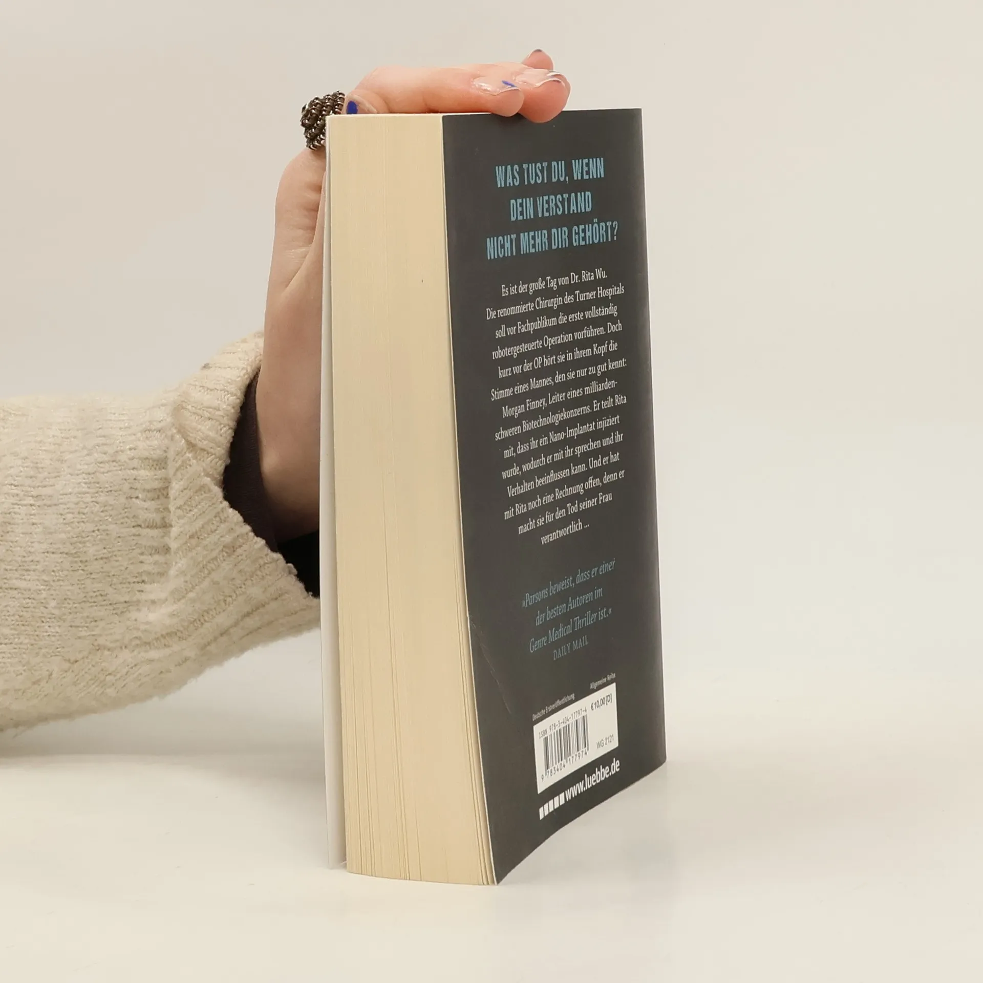Es ist der große Tag von Dr. Rita Wu. Die renommierte Chirurgin des Turner Hospitals soll vor Fachpublikum die erste vollständig robotergesteuerte Operation vorführen. Doch kurz vor der OP hört sie in ihrem Kopf die Stimme eines Mannes, den sie nur zu gut kennt: Morgan Finney, Leiter eines Biotechnologiekonzerns. Er teilt Rita mit, dass ihr ein Nano-Implantat injiziert wurde, wodurch er mit ihr sprechen und ihr Verhalten beeinflussen kann. Und er hat mit Rita noch eine Rechnung offen, denn er macht sie für den Tod seiner Frau verantwortlich ...