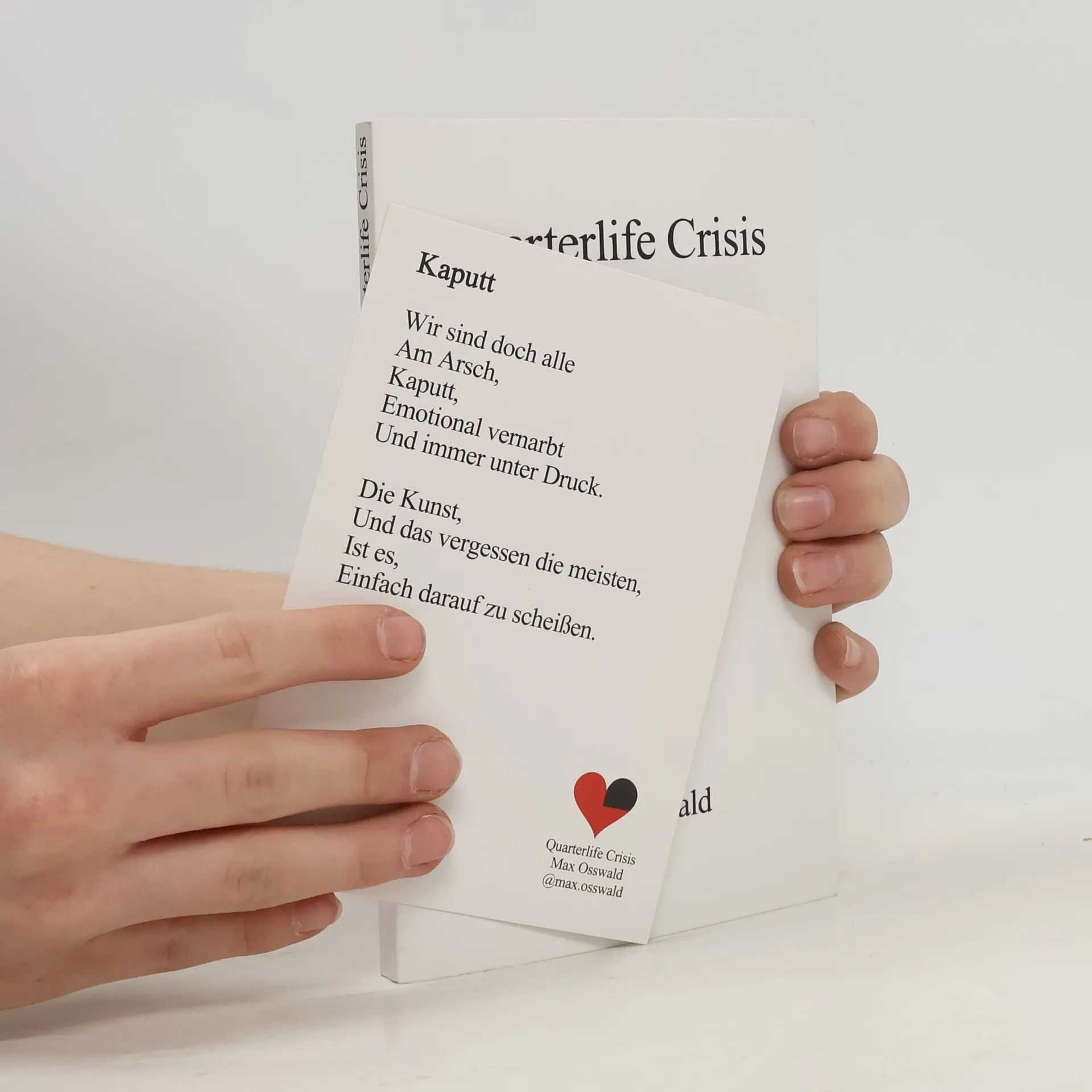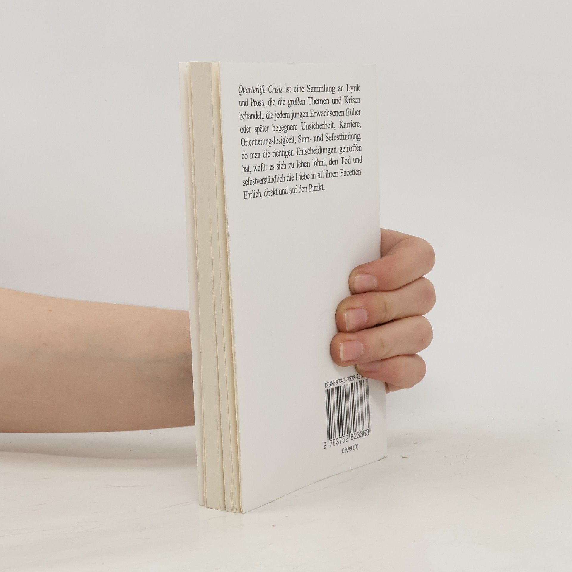 Quarterlife Crisis ist eine Sammlung an Lyrik und Prosa, die die großen Themen und Krisen behandelt, die jedem jungen Erwachsenen früher oder später begegnen: Unsicherheit, Karriere, Orientierungslosigkeit, Sinn- und Selbstfindung, ob man die richtigen Entscheidungen getroffen hat, wofür es sich zu leben lohnt, den Tod und selbstverständlich die Liebe in all ihren Facetten. Ehrlich, direkt und auf den Punkt.