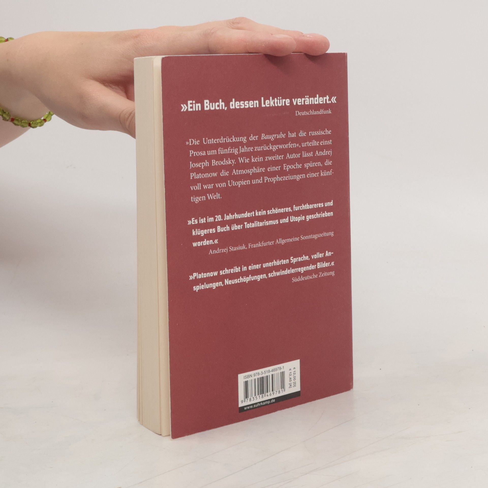 »Die Unterdrückung der Baugrube hat die russische Prosa um fünfzig Jahre zurückgeworfen«, urteilte einst Joseph Brodsky. Wie kein zweiter Autor lässt Andrej Platonow die Atmosphäre einer Epoche spüren, die voll war von Utopien und Prophezeiungen einer künftigen Welt. Am Rande einer Stadt heben Arbeiter eine Grube aus, um ein „gemeinproletarisches Haus“ zu bauen. Vom Kriegsinvaliden über den Handlanger bis zum Ingenieur bildet sich unter den freiwilligen Sklaven eine Hierarchie, die den sozialen Verhältnissen in Stalins Sowjetunion entspricht. Sie setzen alle ihre Kräfte ein, die glückliche Zukunft der Menschheit durch ihrer Hände Arbeit herbeizuführen – und werden doch von der Wucht dieser Aufgabe erdrückt.