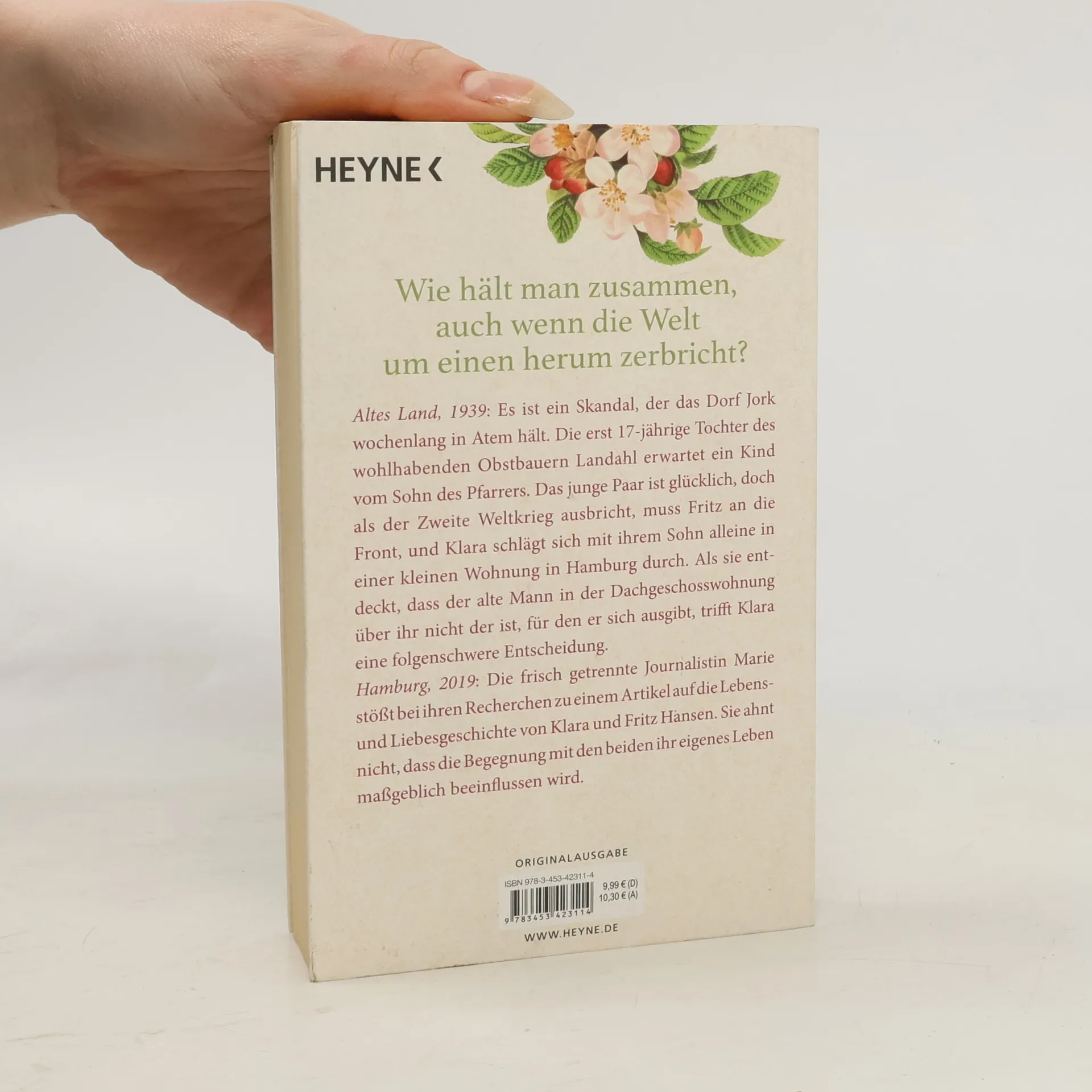 Wie hält man zusammen, wenn die Welt um einen herum zerbricht? Altes Land, 1939: Es ist ein Skandal, der das Dorf Jork wochenlang in Atem hält. Die erst 17-jährige Tochter des wohlhabenden Obstbauern Landahl erwartet ein Kind vom Sohn des Pfarrers. Trotz überstürzter Hochzeit und angekratztem Ruf ist das junge Paar glücklich. Doch als der Zweite Weltkrieg ausbricht, muss Fritz an die Front, und Klara schlägt sich mit ihrem Sohn alleine in einer kleinen Wohnung in Hamburg durch. Als sie entdeckt, dass der alte Mann in der Dachgeschosswohnung nicht der ist, für den er sich ausgibt, trifft Klara eine folgenschwere Entscheidung. Hamburg, 2019: Die frisch getrennte Journalistin Marie stößt bei Recherchen zu einem Artikel auf die Lebens- und Liebesgeschichte von Klara und Fritz Hansen. Sie ahnt nicht, dass die Begegnung mit den beiden ihr eigenes Leben maßgeblich beeinflussen wird.