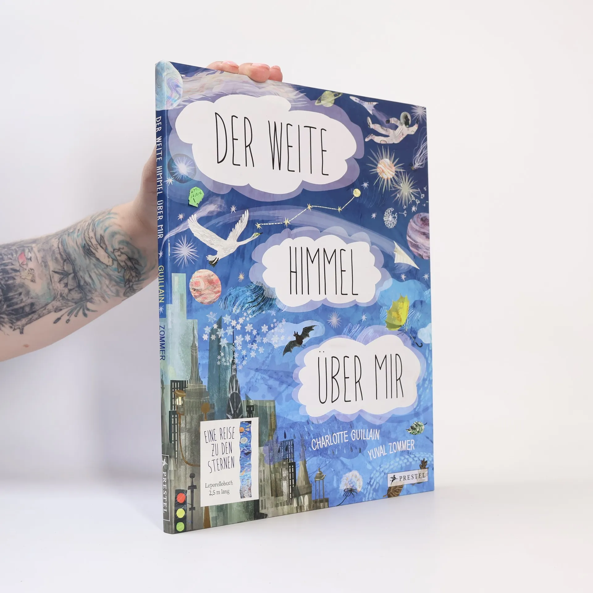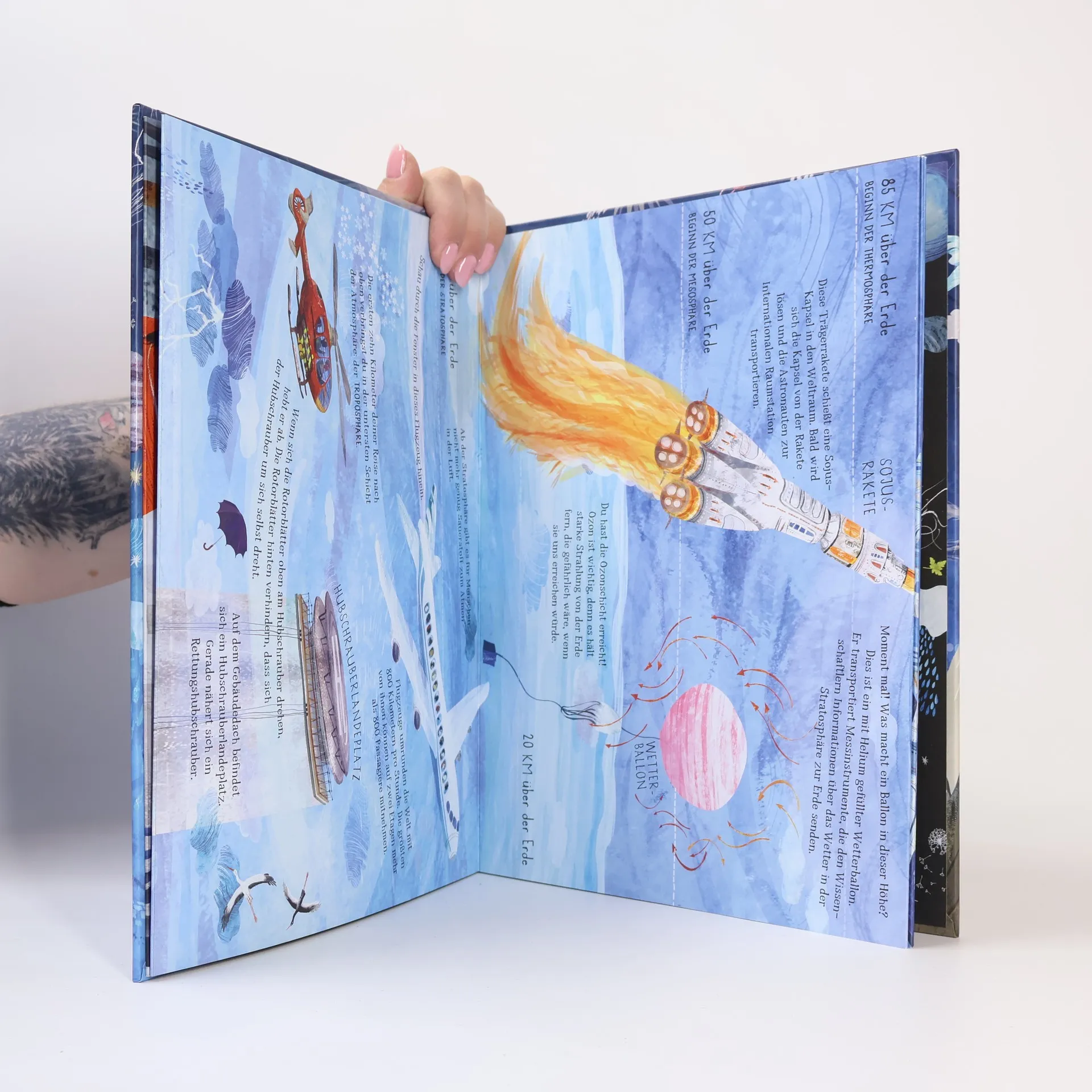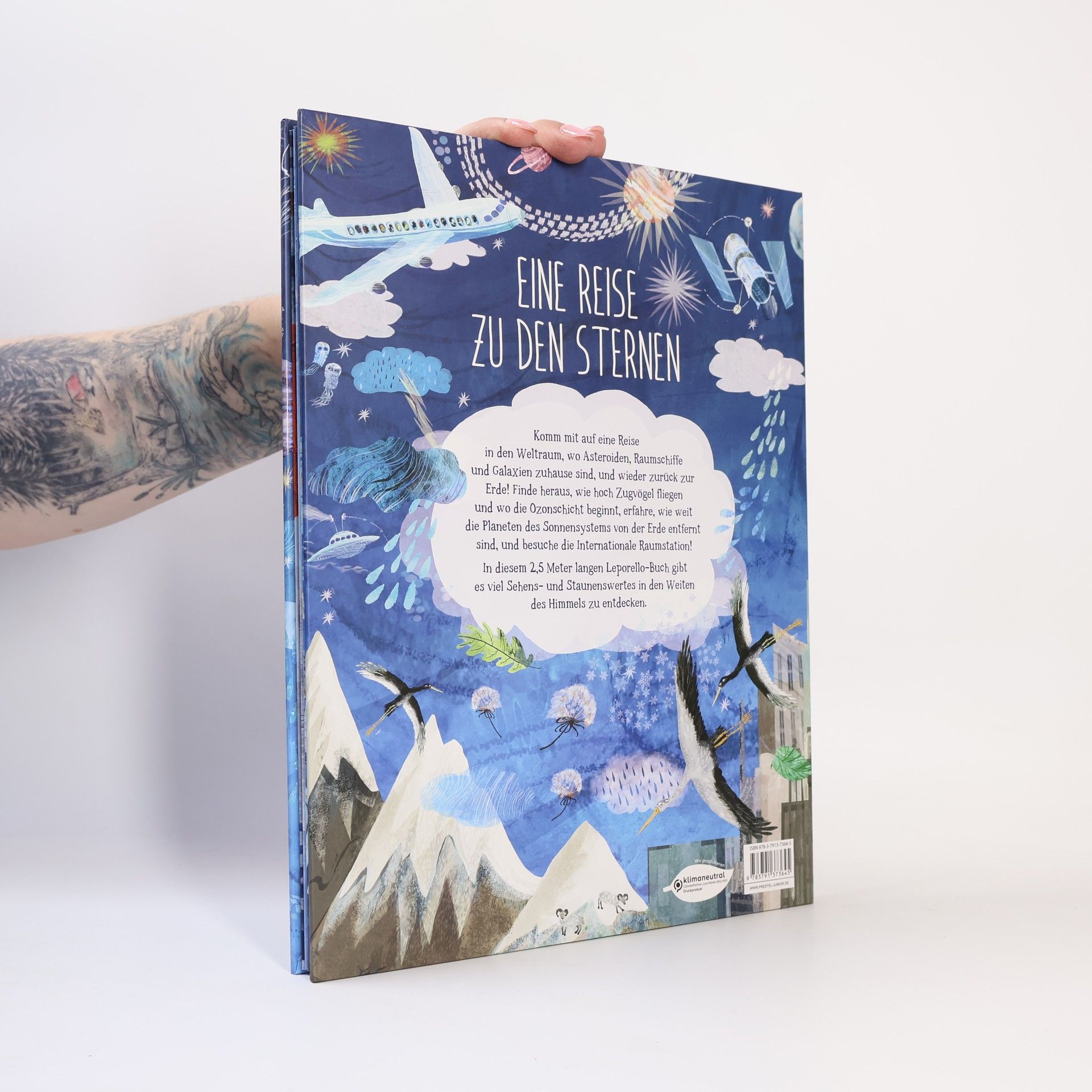 Flieger, Mond und Sterne: Entdecke den Himmel und das Weltall! Ein einzigartiges räumliches Lese-Erlebnis im 2,5 Meter Leporello-Format. Komm mit auf eine Reise in den Himmel über dir, durch die Luft und die Erdatmosphäre in die unendlichen Weiten des Universums und wieder zurück! Du wirst unterwegs die erstaunlichsten und interessantesten Dinge sehen! Dieses fast endlose Leporello-Bilderbuch lenkt den Blick auf den blauen Himmel über uns. Was passiert eigentlich dort oben? Schmetterlinge flattern durch die Luft, Vögel ziehen ihre Kreise. Fensterputzer machen ihre Arbeit in schwindeligen Höhen, Flugzeuge und Heißluftballons trotzen der Schwerkraft. Höher und höher geht die Reise, durch Wolken und Gewitter hindurch, hinaus in die Stratosphäre, wo Menschen nicht mehr atmen können, bis zum Mond, zur Sonne, zu Zwergsternen, Supernovas und dem Ende unseres Sonnensystems. Was für ein Abenteuer! Ebenfalls in der Reihe lieferbar: Unter meinen Füßen: Eine Reise zum Mittelpunkt der Erde (ISBN 978-3-7913-7340-9) Unter mir das Meer (ISBN 978-3-7913-7542-7) Ausstattung: durchgehend illustriert; Leporello