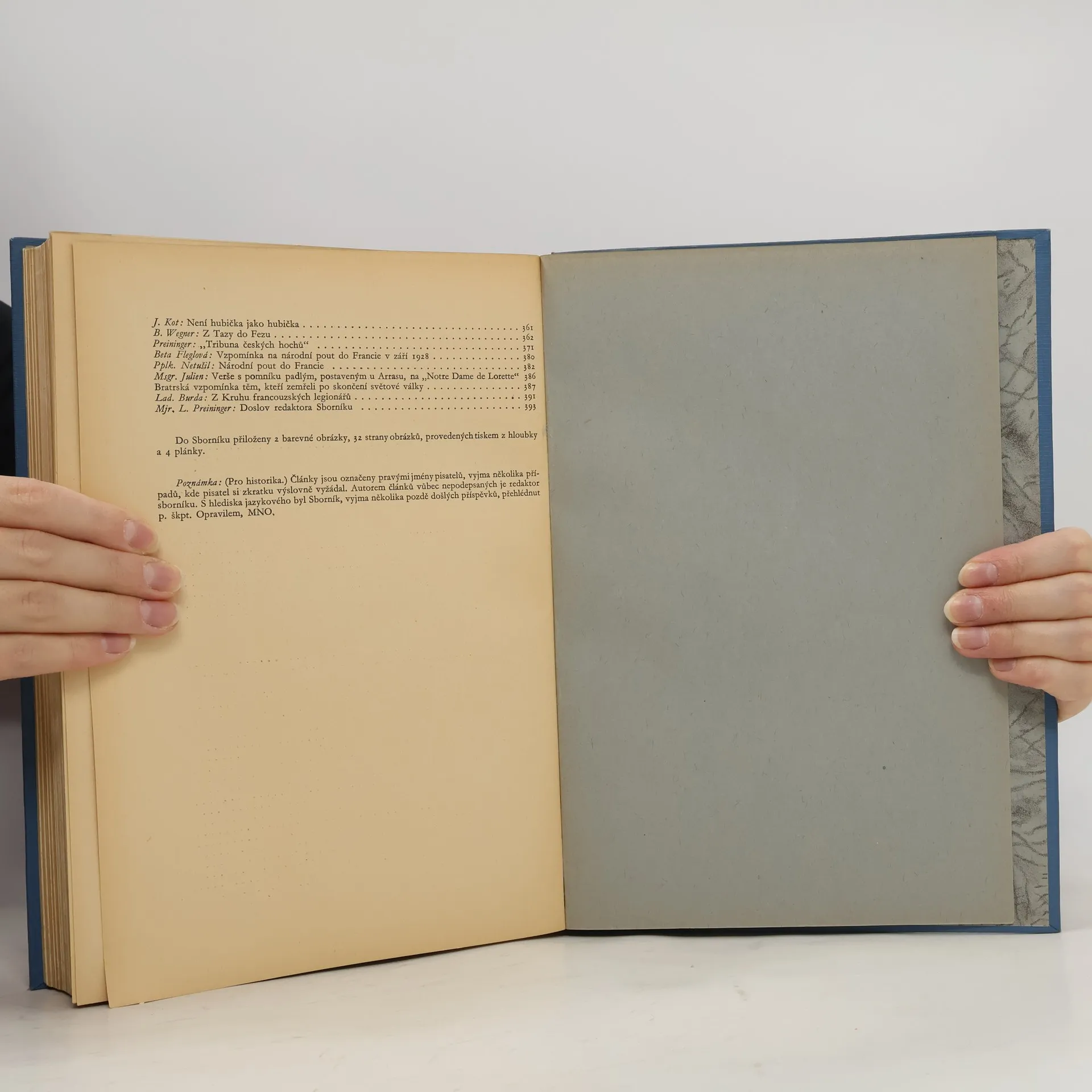 Obsahuje: První sborník francouzských legionářů k 10. výročí samostatnosti Československé republiky; Druhý sborník francouzských legionářů, vydaný v 80. roce života prvního presidenta Československé republiky, T.G. Masaryka. Obsahuje dva svazky.