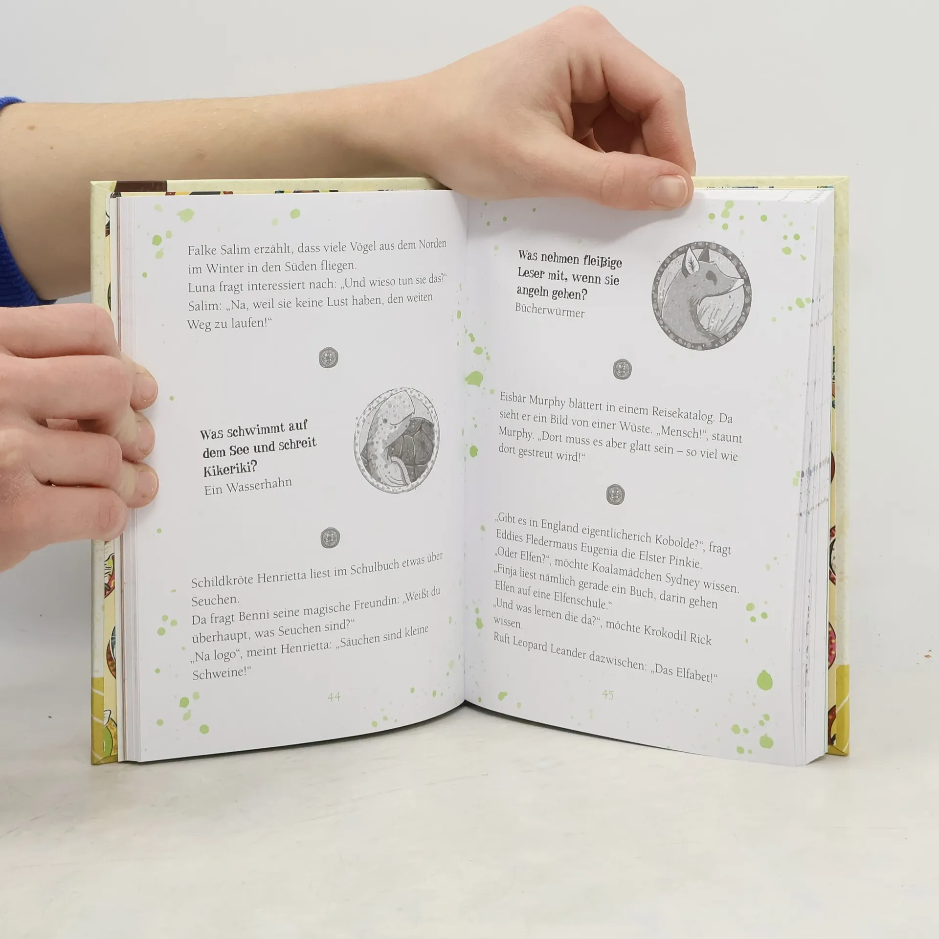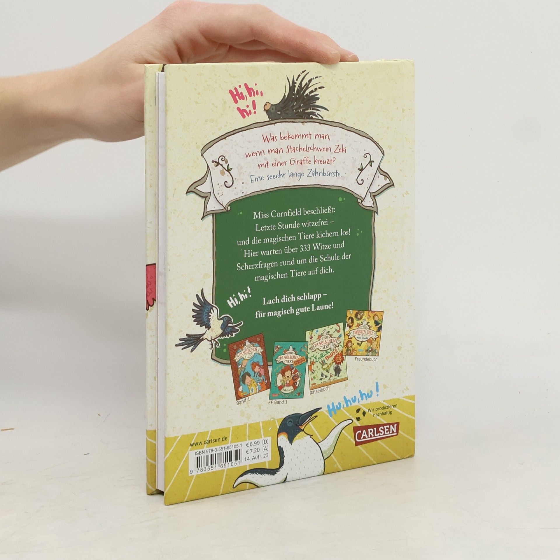 *** Was bekommt man, wenn man Stachelschwein Zeki mit einer Giraffe kreuzt? Eine seeehr lange Zahnbürste! *** Miss Cornfield beschließt: Letzte Stunde witzefrei – und die magischen Tiere kichern los! In diesem Witzebuch warten über 333 Witze und Scherzfragen rund um die Schule der magischen Tiere auf dich. Lach dich schlapp – für zauberhaft gute Laune! *** DIE SCHULE DER MAGISCHEN TIERE: Diese Schule birgt ein Geheimnis! Wer Glück hat, findet hier den besten Freund, den es auf der Welt gibt. Ein magisches Tier. Ein Tier, das sprechen kann. Wenn es zu dir gehört ... *** Endlich auf dem Stundenplan: magische Tierwitze, fröhliche Schülerwitze, tolle Lieblingswitze und coole Ferienwitze. *** Für echte Fans der Schule der magischen Tiere – von Mister Morrison empfohlen! *** So kommt zu Hause oder unterwegs garantiert keine Langeweile auf! ***