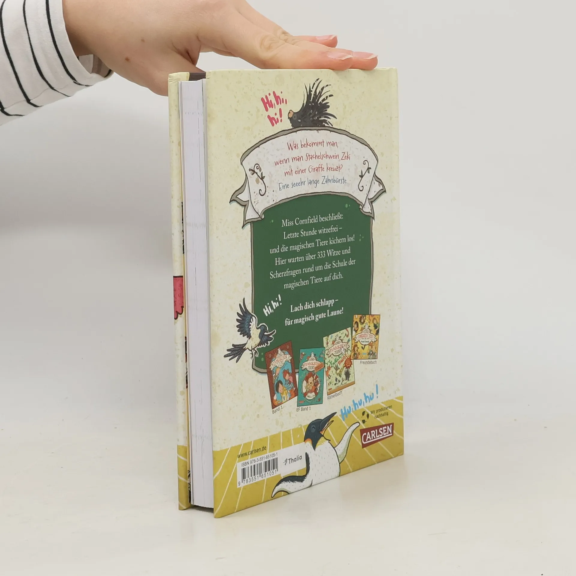 *** Was bekommt man, wenn man Stachelschwein Zeki mit einer Giraffe kreuzt? Eine seeehr lange Zahnbürste! *** Miss Cornfield beschließt: Letzte Stunde witzefrei – und die magischen Tiere kichern los! In diesem Witzebuch warten über 333 Witze und Scherzfragen rund um die Schule der magischen Tiere auf dich. Lach dich schlapp – für zauberhaft gute Laune! *** DIE SCHULE DER MAGISCHEN TIERE: Diese Schule birgt ein Geheimnis! Wer Glück hat, findet hier den besten Freund, den es auf der Welt gibt. Ein magisches Tier. Ein Tier, das sprechen kann. Wenn es zu dir gehört ... *** Endlich auf dem Stundenplan: magische Tierwitze, fröhliche Schülerwitze, tolle Lieblingswitze und coole Ferienwitze. *** Für echte Fans der Schule der magischen Tiere – von Mister Morrison empfohlen! *** So kommt zu Hause oder unterwegs garantiert keine Langeweile auf! ***