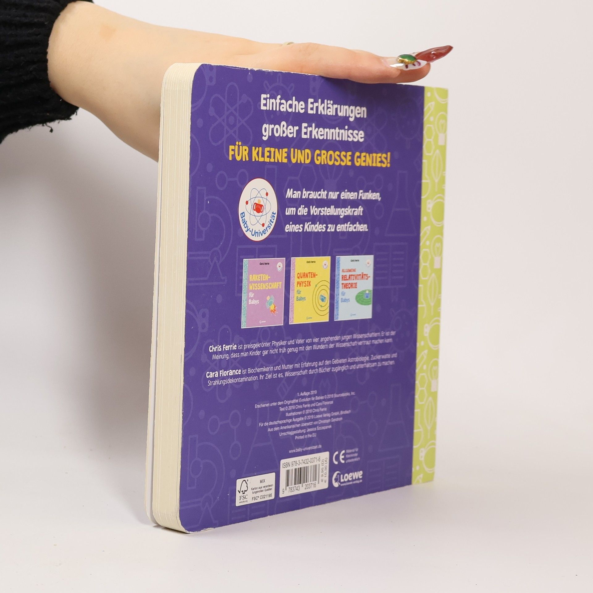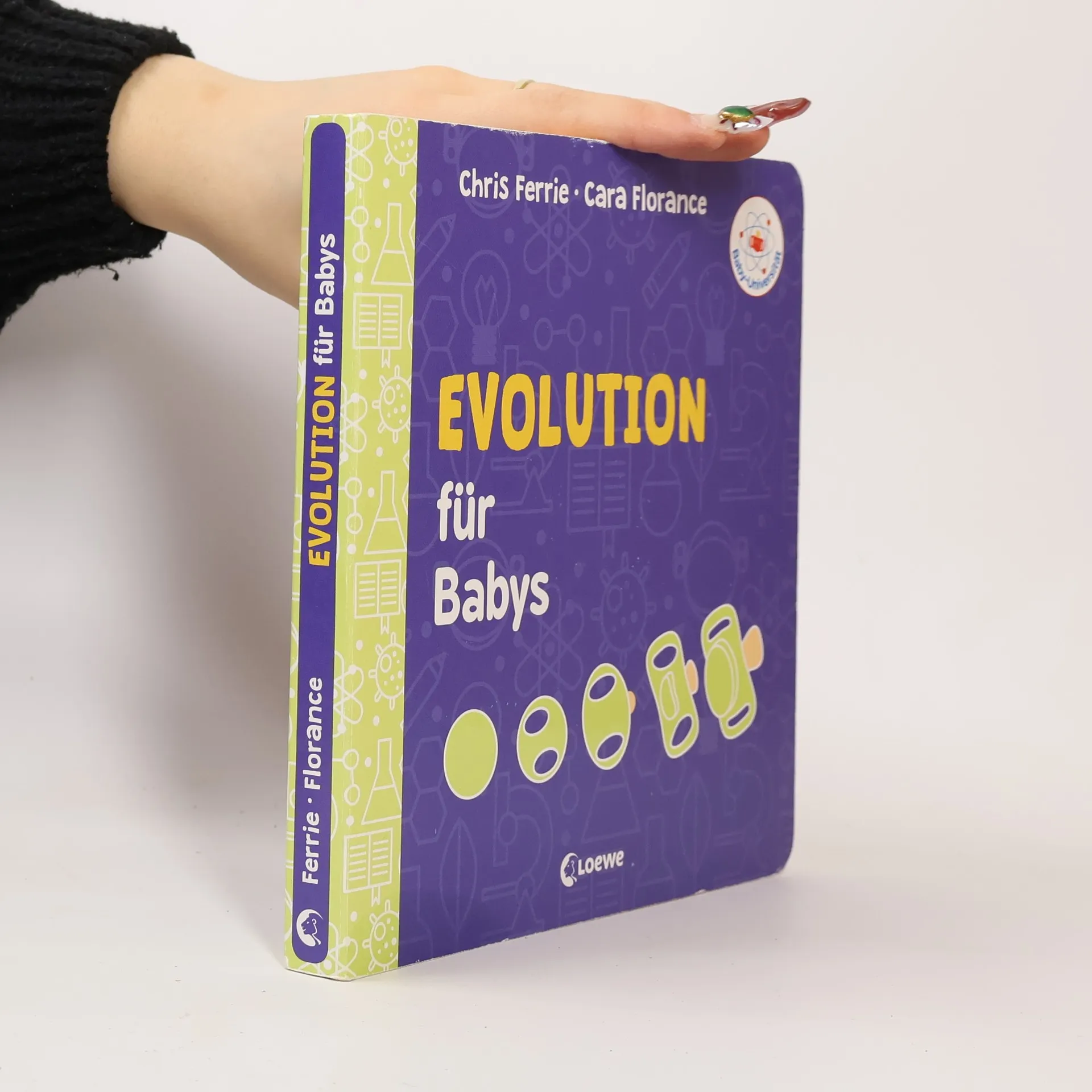 Einfache Erklärungen großer Erkenntnisse für kleine und große Genie! Evolution für Babys ist eine heitere und verständliche Hinführung zur evolutionären Biologie. Kleinkinder (und Erwachsene!) lernen, wie Lebewesen mutieren, sich weiterentwickeln und überleben. Auf unnachahmlich leichte Weise und stets mit einem Augenzwinkern schaffen es der Physiker Chris Ferrie und die Biochemikerin Clara Florance, Kinder und Erwachsene gleichermaßen zu inspirieren. Die Bücher der Baby-Universität sind der einfachste Weg, um schon unsere Jüngsten für die Wunder der Wissenschaft zu begeistern. Es ist niemals zu früh, ein Evolutionsbiologe zu werden! Baby-Universität: Man braucht nur einen Funken, um die Vorstellungskraft eines Kindes zu entfachen.