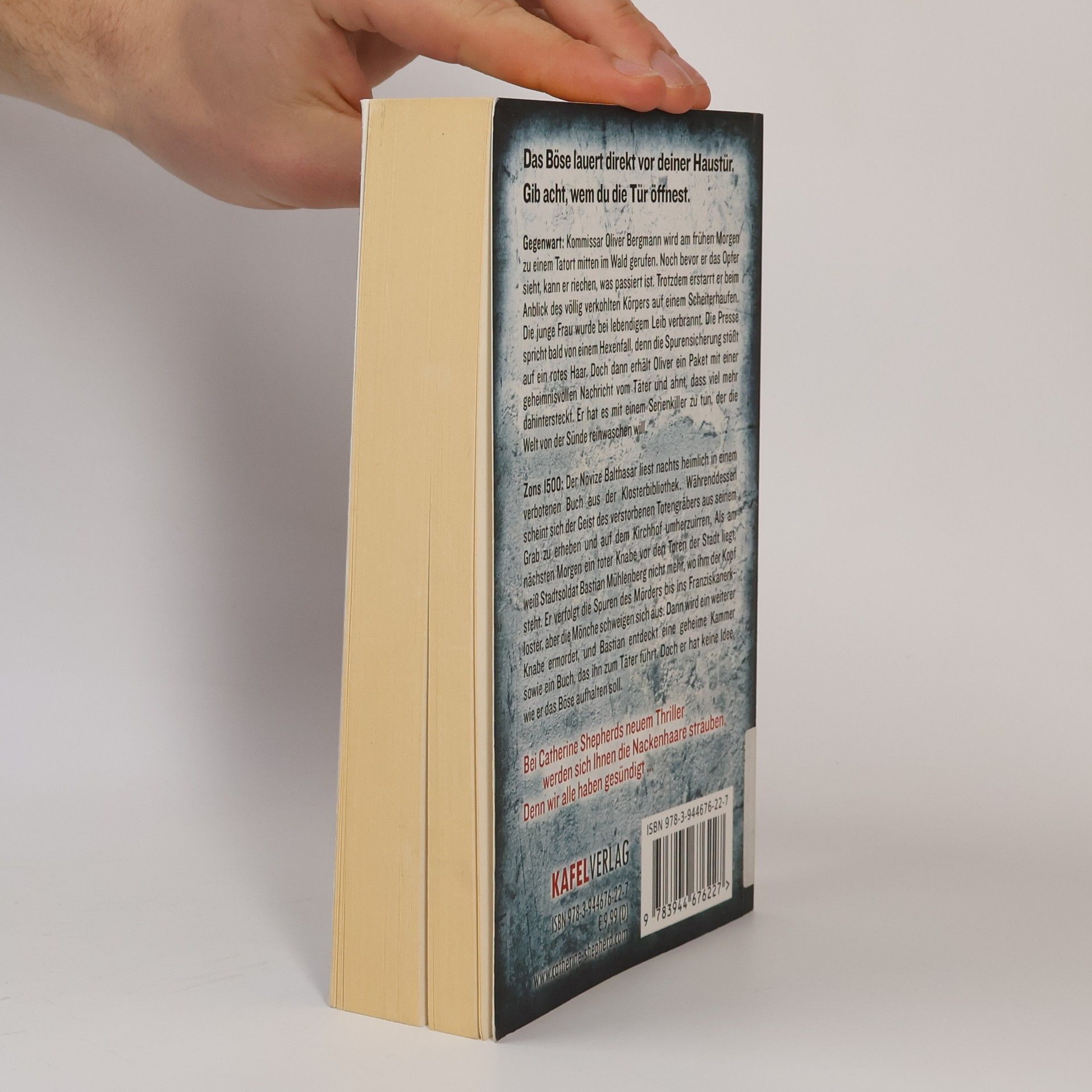Das Böse lauert direkt vor deiner Haustür. Gib acht, wem du die Tür öffnest. Gegenwart: Kommissar Oliver Bergmann wird am frühen Morgen zu einem Tatort mitten im Wald gerufen. Noch bevor er das Opfer sieht, kann er riechen, was passiert ist. Trotzdem erstarrt er beim Anblick des völlig verkohlten Körpers auf einem Scheiterhaufen. Die junge Frau wurde bei lebendigem Leib verbrannt. Die Presse spricht bald von einem Hexenfall, denn die Spurensicherung stößt auf ein rotes Haar. Doch dann erhält Oliver ein Paket mit einer geheimnisvollen Nachricht vom Täter und ahnt, dass viel mehr dahintersteckt. Er hat es mit einem Serienkiller zu tun, der die Welt von der Sünde reinwaschen will. Zons 1500: Der Novize Balthasar liest nachts heimlich in einem verbotenen Buch aus der Klosterbibliothek. Währenddessen scheint sich der Geist des verstorbenen Totengräbers aus seinem Grab zu erheben und auf dem Kirchhof umherzuirren. Als am nächsten Morgen ein toter Knabe vor den Toren der Stadt liegt, weiß Stadtsoldat Bastian Mühlenberg nicht mehr, wo ihm der Kopf steht. Er verfolgt die Spuren des Mörders bis ins Franziskanerkloster, aber die Mönche schweigen sich aus. Dann wird ein weiterer Knabe ermordet, und Bastian entdeckt eine geheime Kammer sowie ein Buch, das ihn zum Täter führt. Doch er hat keine Idee, wie er das Böse aufhalten soll.
