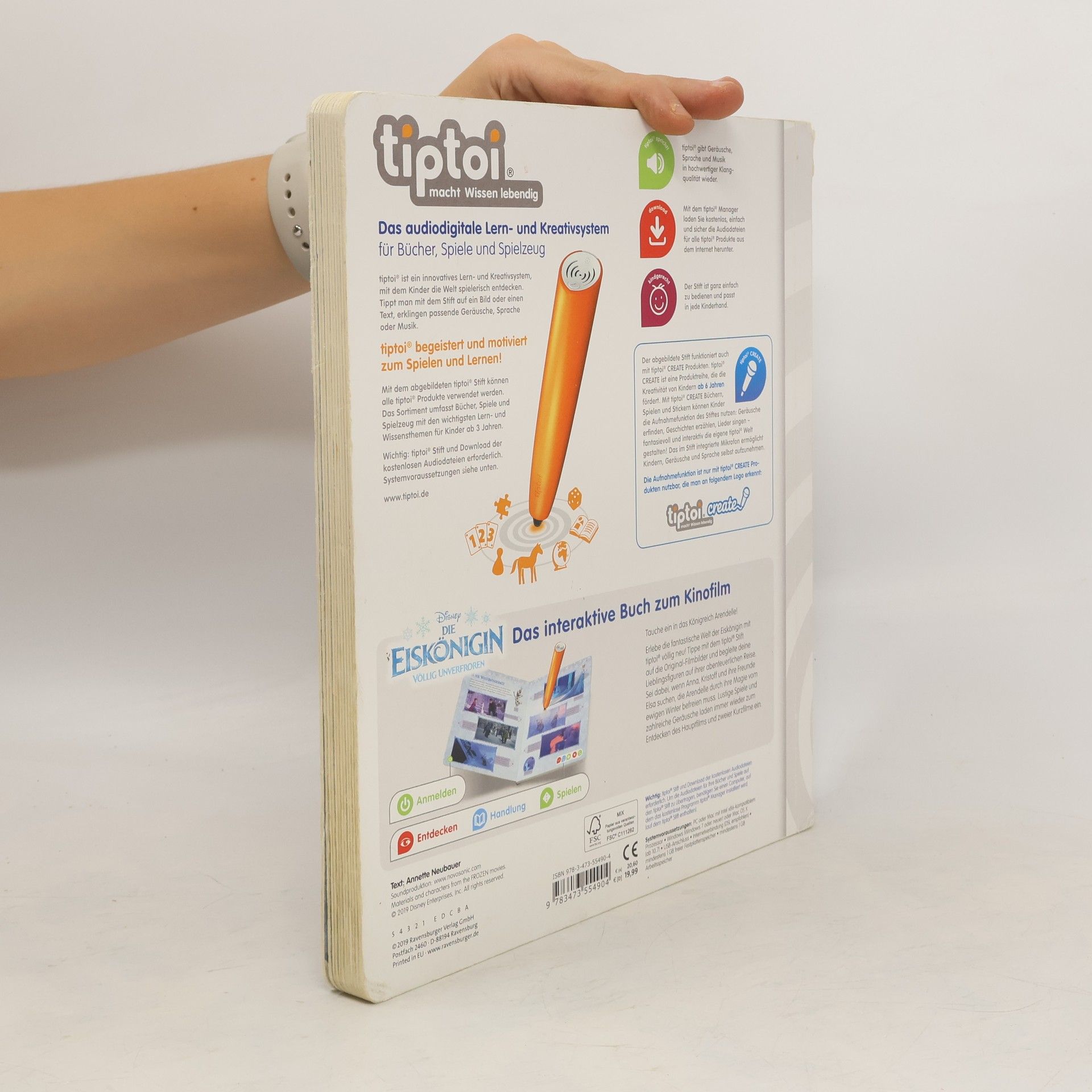 tiptoi® trifft auf die Eiskönigin! Mit dem tiptoi-Stift tauchen die Kinder in die beliebte Welt der Eiskönigin ein und erwecken so Anna, Elsa und ihre Freunde zum Leben. Das Buch beinhaltet die Handlung des Erfolgsfilms Die Eiskönigin – Völlig unverfroren und zweier Kurzfilme. Neben der packenden Geschichte begeistern spannende Informationen sowie lustige, interaktive Spiele die kleinen Fans von Anna und Elsa. Mit klirrenden Eiskristallen, sausenden Schlitten und den Stimmen der Lieblingscharaktere wird dieses Buch zu einem interaktiven Erlebnis. Mit dem tiptoi-Stift können die Leser die Filme neu erleben und viel Wissenswertes über Arendelle, Anna und Elsa und ihre Freunde erfahren. Dabei kämpfen sie sich durch die eisige Winterlandschaft, die Elsa mit ihren Zauberkräften erschaffen hat, und bringen den Sommer nach Arendelle zurück. Am Schluss lernen sie, wie stark das Band zwischen Geschwistern ist und was wahre Liebe wirklich bedeutet. Die Tonspuren aus dem Hauptfilm und den zwei Kurzfilmen Party-Fieber und Olaf taut auf machen die Live-Action-Bilder im Buch lebendig. In über 10 Spielen können die Kinder ihr Wissen testen, ihre Geschicklichkeit unter Beweis stellen und lustige Aufgaben lösen. tiptoi-Stift nicht enthalten. Muss separat erworben werden.