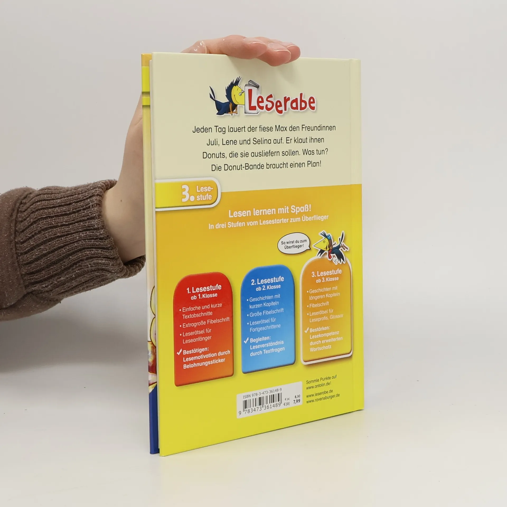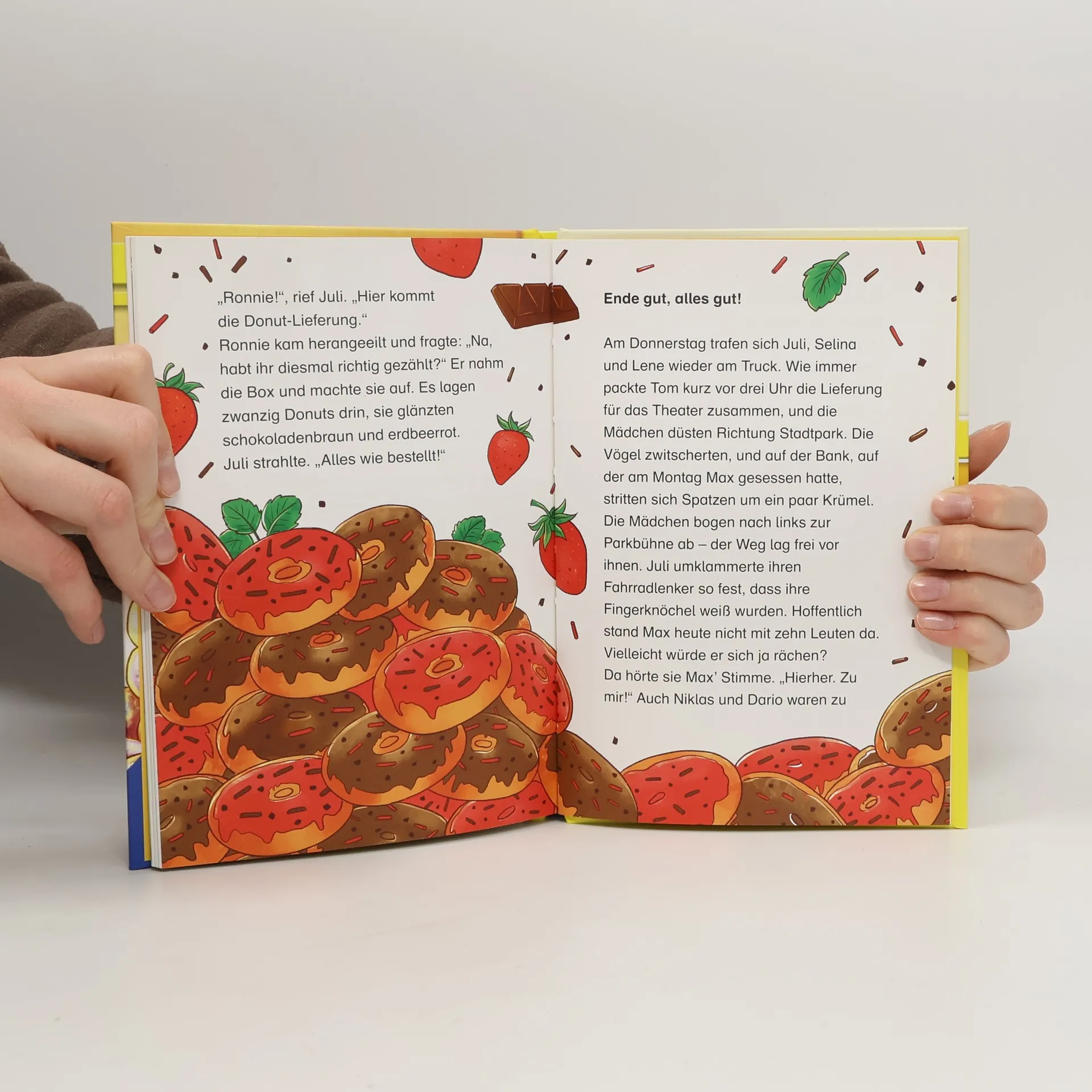 Verflixt und zugenäht! Max stiehlt den Freundinnen Juli, Lene und Selina Donuts, die sie für Julis Bruder Tom ausliefern sollen. Die Donut-Bande braucht einen Plan! Die Reihe Leserabe – 3. Lesestufe richtet sich an Leseprofis ab der 3. Klasse und fördert die Lesefähigkeit von Kindern ab 8 Jahren durch spannende Geschichten mit längeren Kapiteln und erweitertem Wortschatz. Schwierige Wörter werden in einem Glossar erklärt, und die Bücher sind von der Stiftung Lesen empfohlen sowie bei Antolin gelistet. Es ist Sommer und der erste Ferientag. Juli genießt ihren ersten Donut des Tages und trifft sich mit ihren Freundinnen Selina und Lene an Toms Donut-Truck. Tom, der die besten Donuts von Sonnenstein bäckt, steht unter Druck, um genug Gewinn zu erzielen und seinen Imbisswagen zu halten. Juli und ihre Freundinnen wollen ihm helfen, indem sie Donuts per Fahrrad ausliefern. Doch Max und seine Freunde machen ihnen einen Strich durch die Rechnung und stehlen Donuts. Tom erhält Kundenbeschwerden, und die Donut-Bande muss handeln. Sie kreieren die „Donuts der Hölle“ mit Pfeffer, Chili und Peperoni, um Max und seinen Freunden das Klauen zu vermiesen. Die Jungs haben die Lektion gelernt: Mit der Donut-Bande legt man sich besser nicht an!