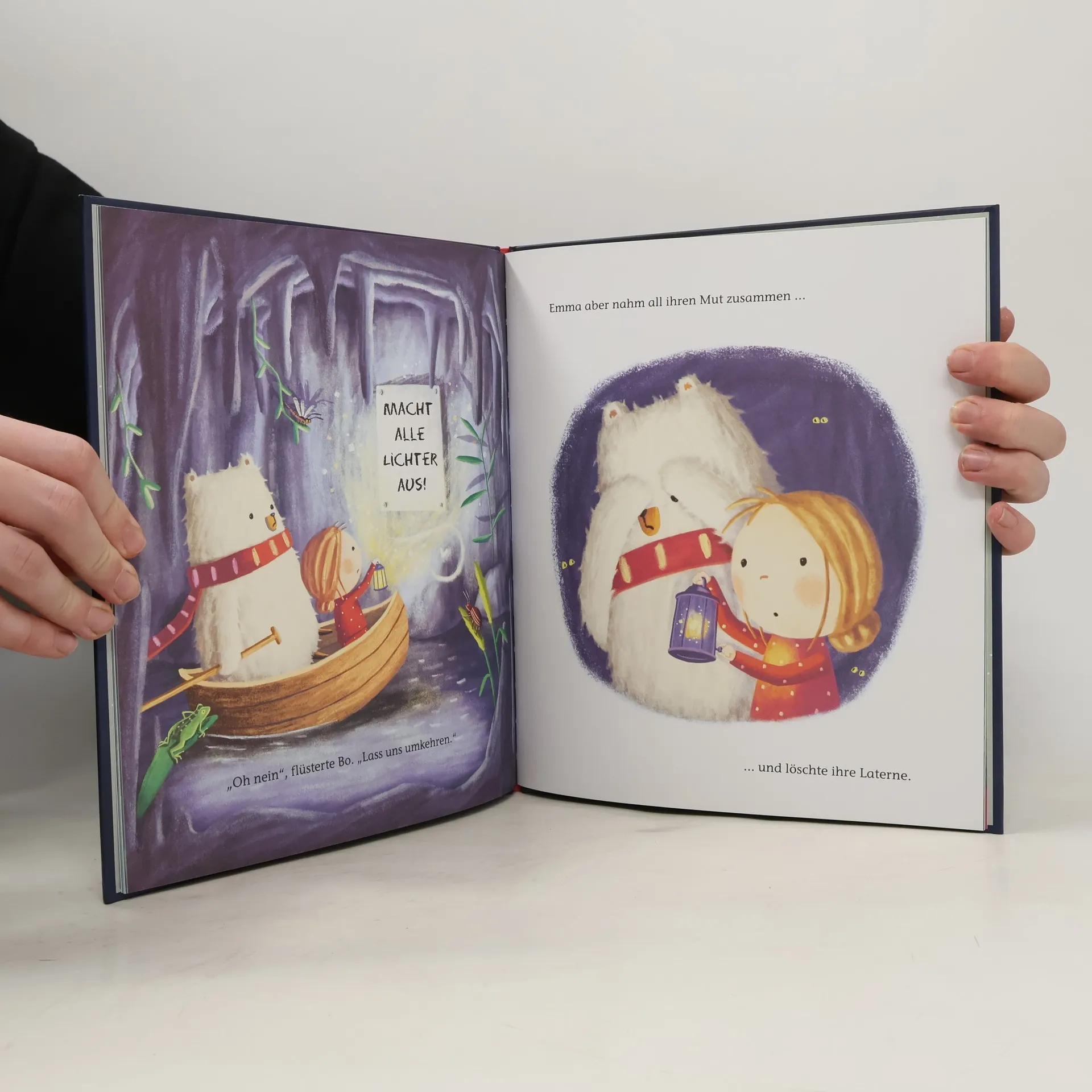 Bilderbuch ab 4 Jahren. Emma liebt ihre Gute-Nacht-Geschichten, besonders die über Bo, den Bären, der Angst vor der Dunkelheit hat. Als Bo plötzlich zum Leben erwacht, will Emma ihm helfen, seine Angst zu überwinden und ihm die Schönheit der Nacht zeigen. Mit einer Laterne in der einen Hand und Bos Pfote in der anderen betritt Emma eine finstere Höhle und plötzlich leuchtet über ihnen ein magisch funkelnder Sternenhimmel auf. Hier, wo Licht und Finsternis aufeinandertreffen, fühlen sich Emma Bo sicher und geborgen, und Bo erkennt, dass das Dunkel gar nicht so gefährlich ist, sondern wunderschön sein kann. Ausstattung: Mit fbg. Illustrationen