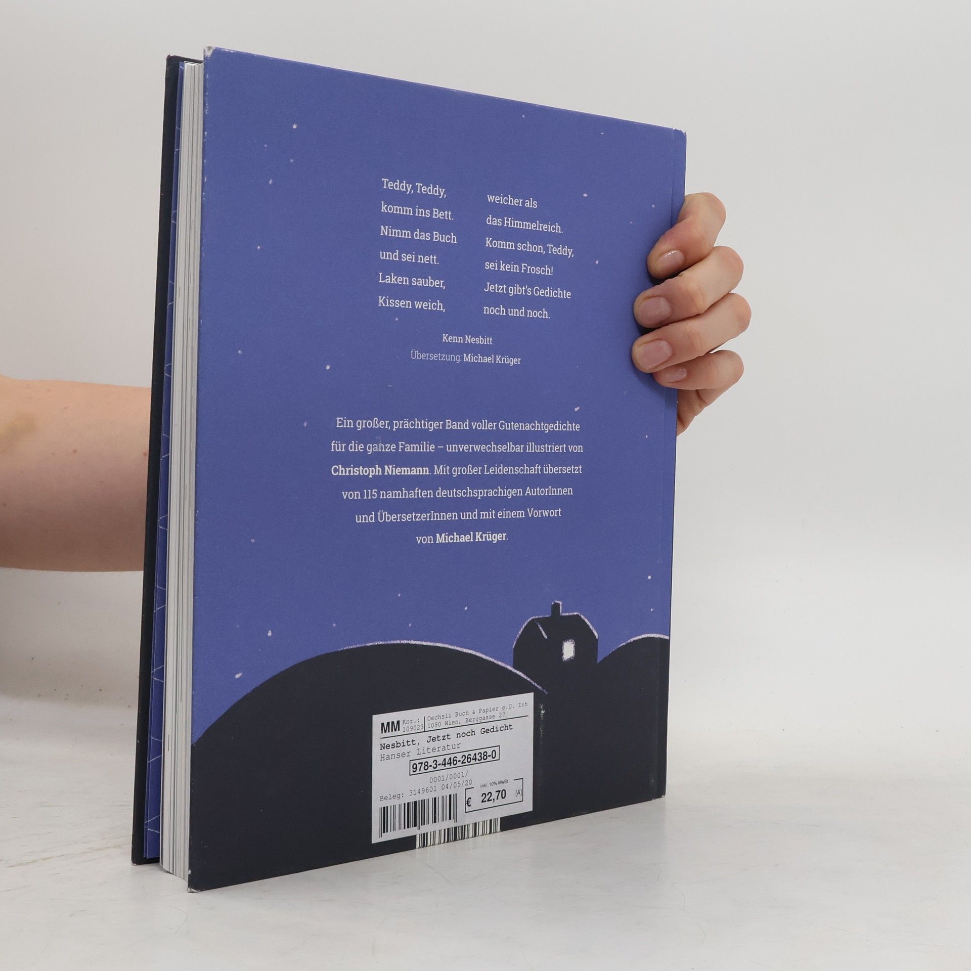 Ein Fest für Sprachverdreher und Reimkünstler. Von über 100 deutschsprachigen AutorInnen übersetzt - genial illustriert von Christoph Niemann Ein großer, prächtiger Band voller Gutenachtgedichte – ein ganz besonderes Betthupferl für Kinder und Eltern. Ob Wortspielerei, einfache Reime zum Auswendiglernen und immer wieder Aufsagen oder klassisches Kindergedicht rund um Mond, Sternenhimmel und Teddybär – diese Gedichte sind direkt in die Lebenswelt der Kinder hineingeschrieben von über 130 amerikanischen AutorInnen. Sie stecken voller Abenteuer und Lebensfreude, erzählen von Kinderbuchhelden, Märchenfiguren und Fantasiewesen und wecken die Lust an Sprache und Poesie. Ein Hausbuch für die ganze Familie mit unverwechselbaren Illustrationen von Christoph Niemann. Mit großer Leidenschaft übersetzt von namhaften deutschsprachigen AutorInnen und ÜbersetzerInnen.
