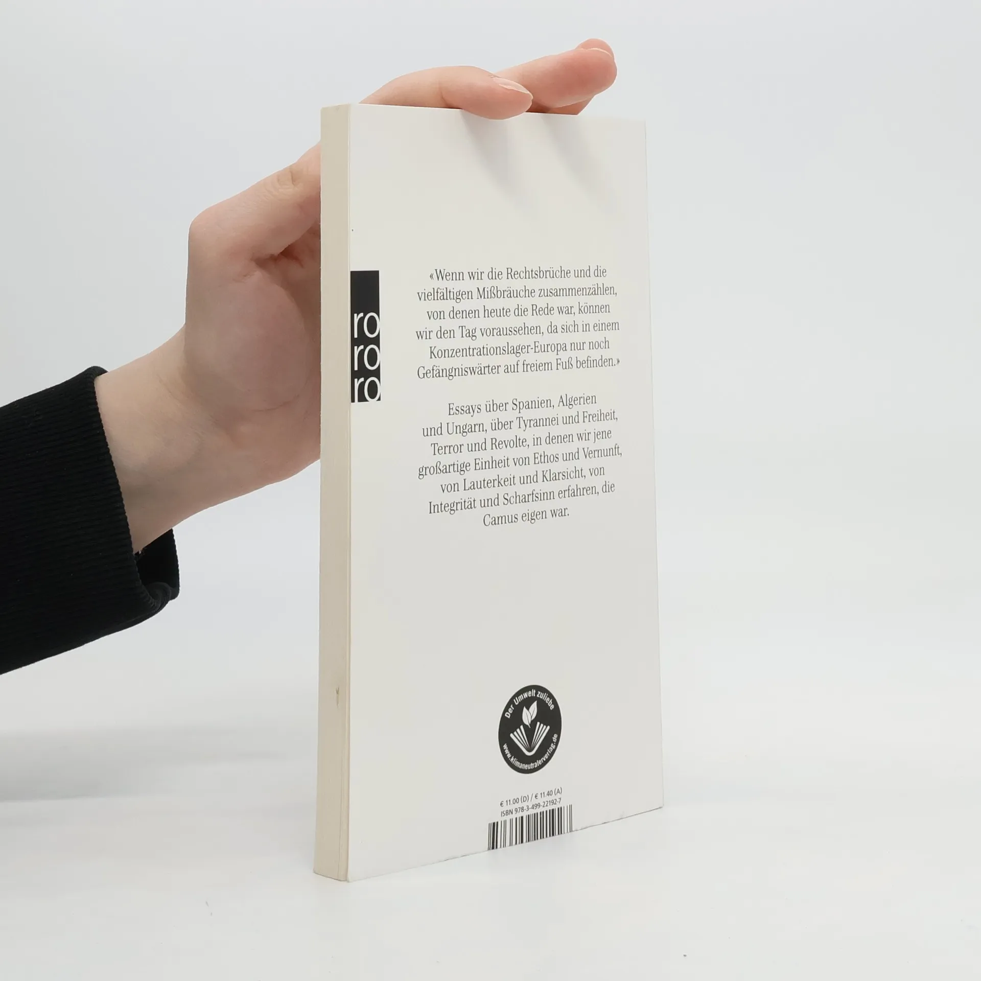 „Wenn wir die Rechtsbrüche und die vielfältigen Mißbräuche zusammenzählen, von denen heute die Rede war, können wir den Tag voraussehen, da sich in einem Konzentrationslager-Europa nur noch Gefängniswärter auf freiem Fuß befinden.“ Essays über Spanien, Algerien und Ungarn, über Tyrannei und Freiheit, Terror und Revolte, in denen wir jene großartige Einheit von Ethos und Vernunft, von Lauterkeit und Klarsicht, von Integrität und Scharfsinn erfahren, die Camus eigen war.