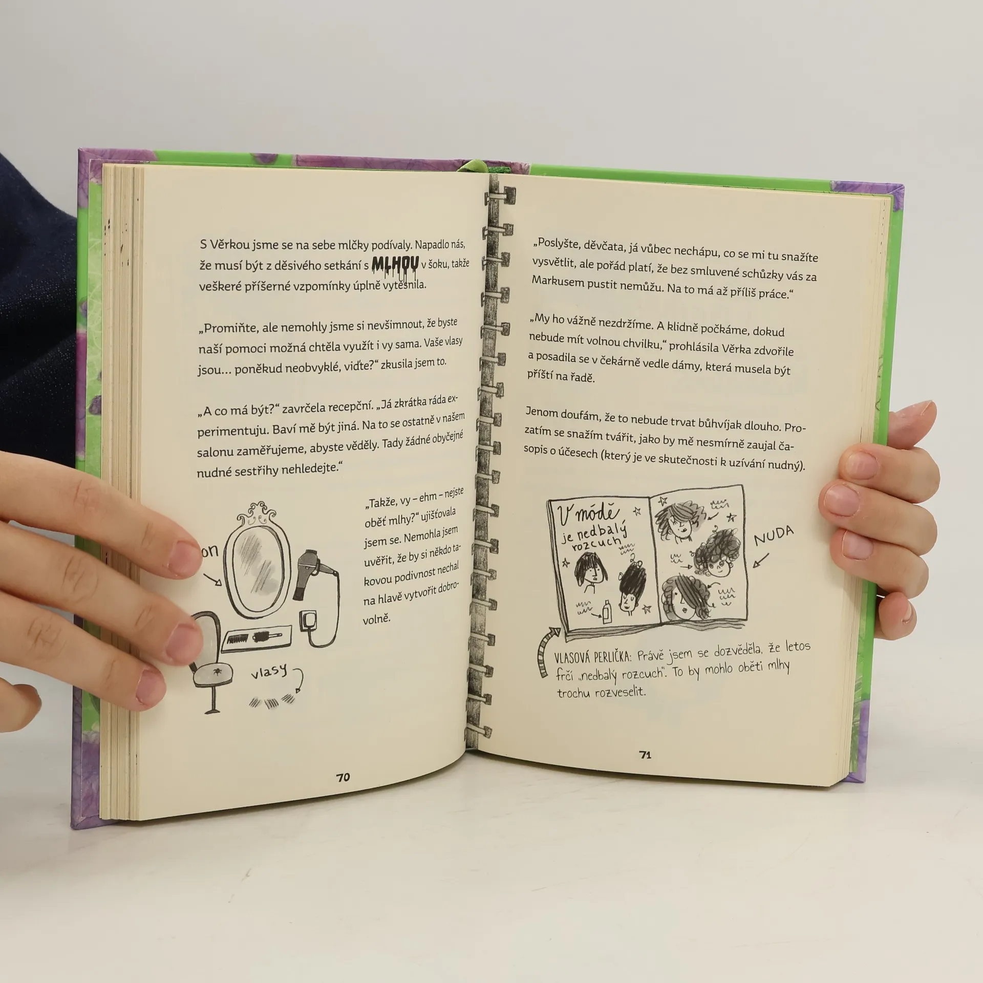 Devítiletá Majda Čmuchalová a její kolegyně z detektivní kanceláře Holky čmuchalky o sobě rády prohlašují, že pro ně není žádná záhada příliš záhadná a žádný problém příliš zapeklitý. Ale bude to platit i v případě děsivé fialové mlhy, která se ve městě zničehonic objevila a teď ve stínech číhá na ubohé obyvatele Kalužína, kterým na hlavách vytváří ty nejpodivnější a nejpraštěnější účesy? Jsou snad za strašidelný vlasový úkaz zodpovědní ufouni z vesmíru? A podaří se děvčatům případ rozřešit, dřív než celé město skončí s hlavou podobnou cukrové vatě?
