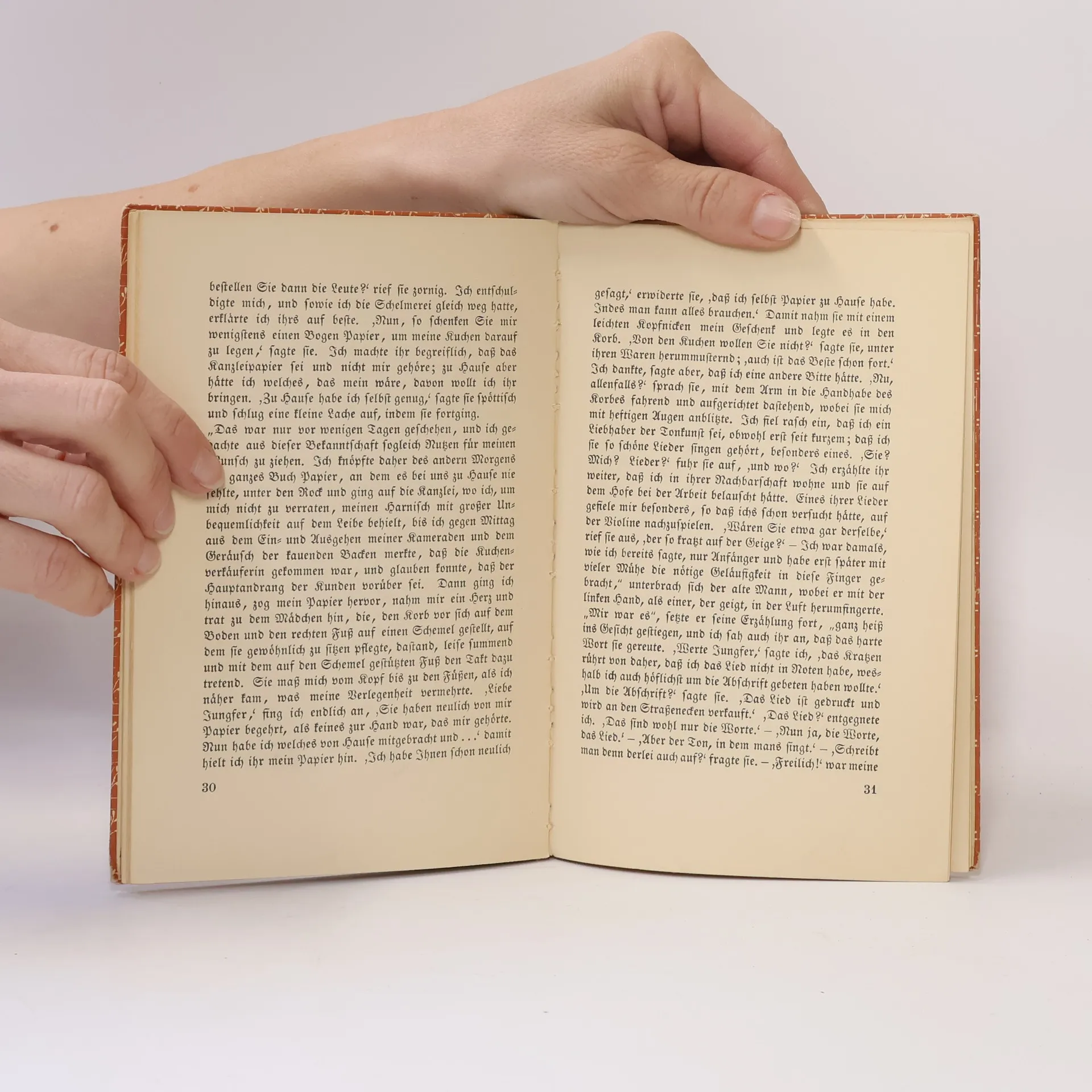 Der Erzähler hört den armen Spielmann spielen und gibt ihm eine Münze. Man unterhält sich ein wenig, lernt sich kennen und geht wieder auseinander. Später kann es kein Wiedersehen mehr geben. Der Spielmann wirkt anziehend durch Liebenswürdigkeit und Charakter, wird gleichsam gemieden wegen seiner Lebensuntüchtigkeit. Seit er ums Erbe betrogen wurde, zieht er als Spielmann umher.