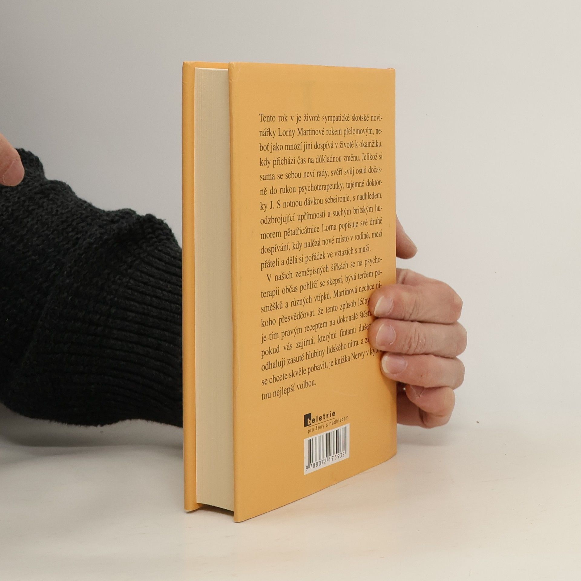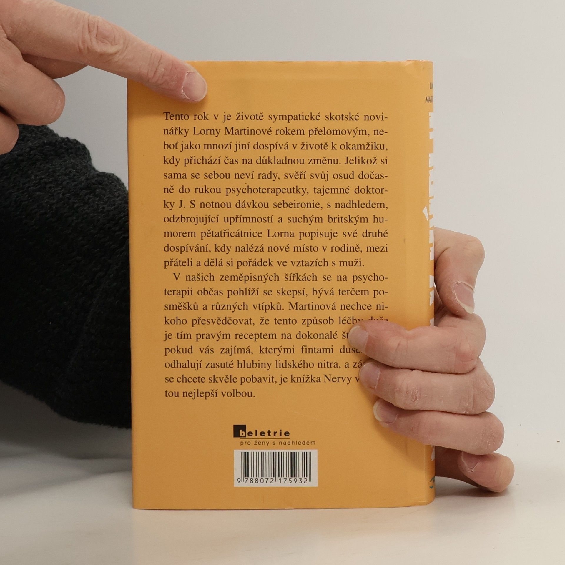 Tento rok v je životě sympatické skotské novinářky Lorny Martinové rokem přelomovým, neboť jako mnozí jiní dospívá v životě k okamžiku, kdy přichází čas na důkladnou změnu. Při poměrně dobrodužném výletu do Thajska zjišťuje, že si sama se sebou neví rady, a svěří svůj osud dočasně do rukou psychoterapeutky, tajemné doktorky J. S notnou dávkou sebeironie, s nadhledem, odzbrojující upřímností a suchým britským humorem pětatřicátnice Lorna popisuje své druhé dospívání, kdy nalézá nové místo v rodině, mezi přáteli a dělá si pořádek ve vztazích s muži. V našich zeměpisných šířkách se na psychoterapii občas pohlíží se skepsí, bývá terčem posměšků a různých vtípků. Martinová nechce nikoho přesvědčovat, že tento způsob léčby duše je tím pravým receptem na dokonalé štěstí. Ale pokud vás zajímá, kterými fintami dušezpytci odhalují zasuté hlubiny lidského nitra, a zároveň se chcete skvěle pobavit, je knížka Nervy v kýblu tou nejlepší volbou.