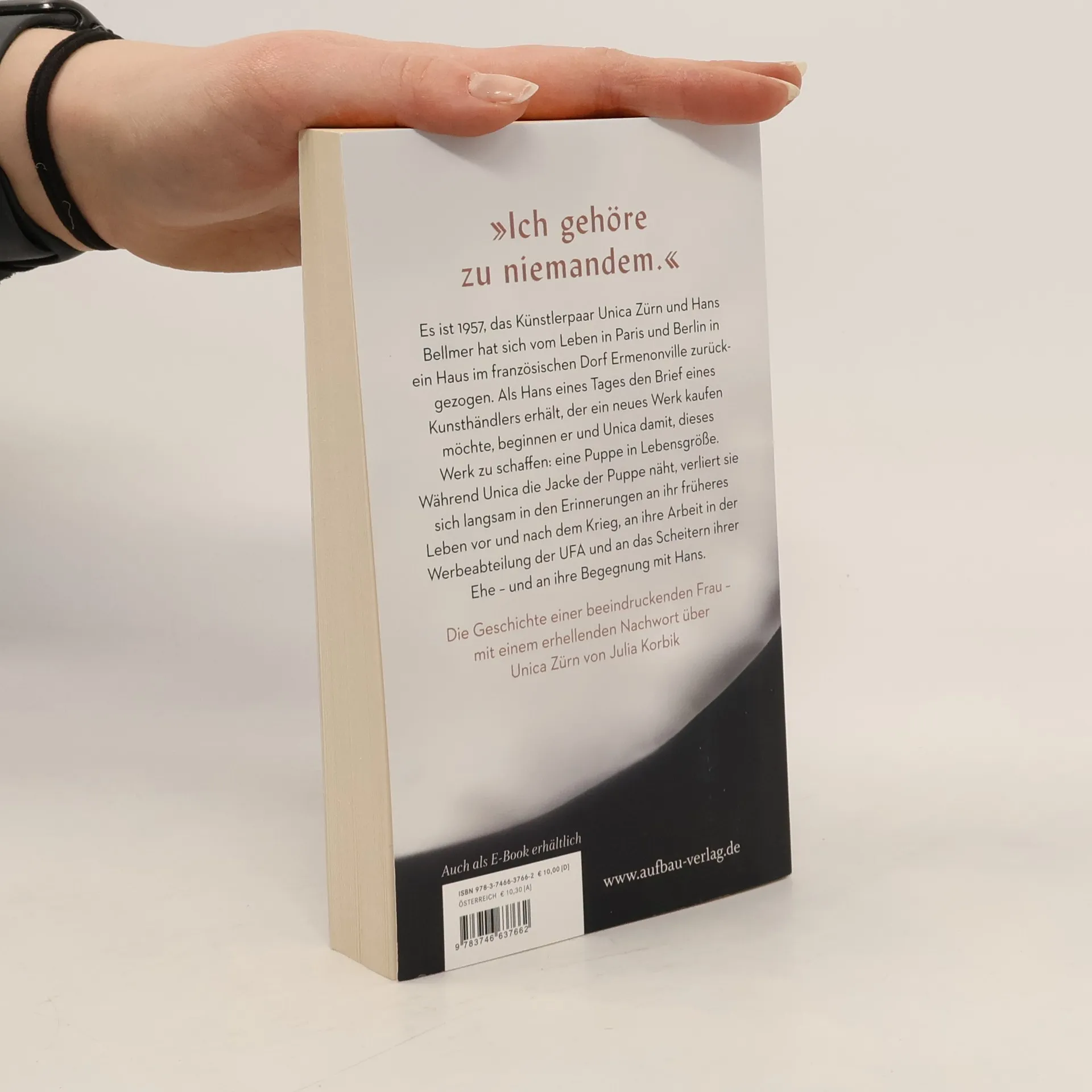 »Ich gehöre zu niemandem.« Es ist 1957, das Künstlerpaar Unica Zürn und Hans Bellmer hat sich vom Leben in Paris und Berlin in ein Haus im französischen Dorf Ermenonville zurückgezogen. Als Hans eines Tages den Brief eines Kunsthändlers erhält, der ein neues Werk kaufen möchte, beginnen er und Unica damit, dieses Werk zu schaffen: eine Puppe in Lebensgröße. Während Unica die Jacke der Puppe näht, verliert sie sich langsam in den Erinnerungen an ihr früheres Leben vor und nach dem Krieg, an ihre Arbeit in der Werbeabteilung der UFA und an das Scheitern ihrer Ehe – und an ihre Begegnung mit Hans. Die Geschichte einer beeindruckenden Frau – mit einem erhellenden Nachwort über Unica Zürn von Julia Korbik