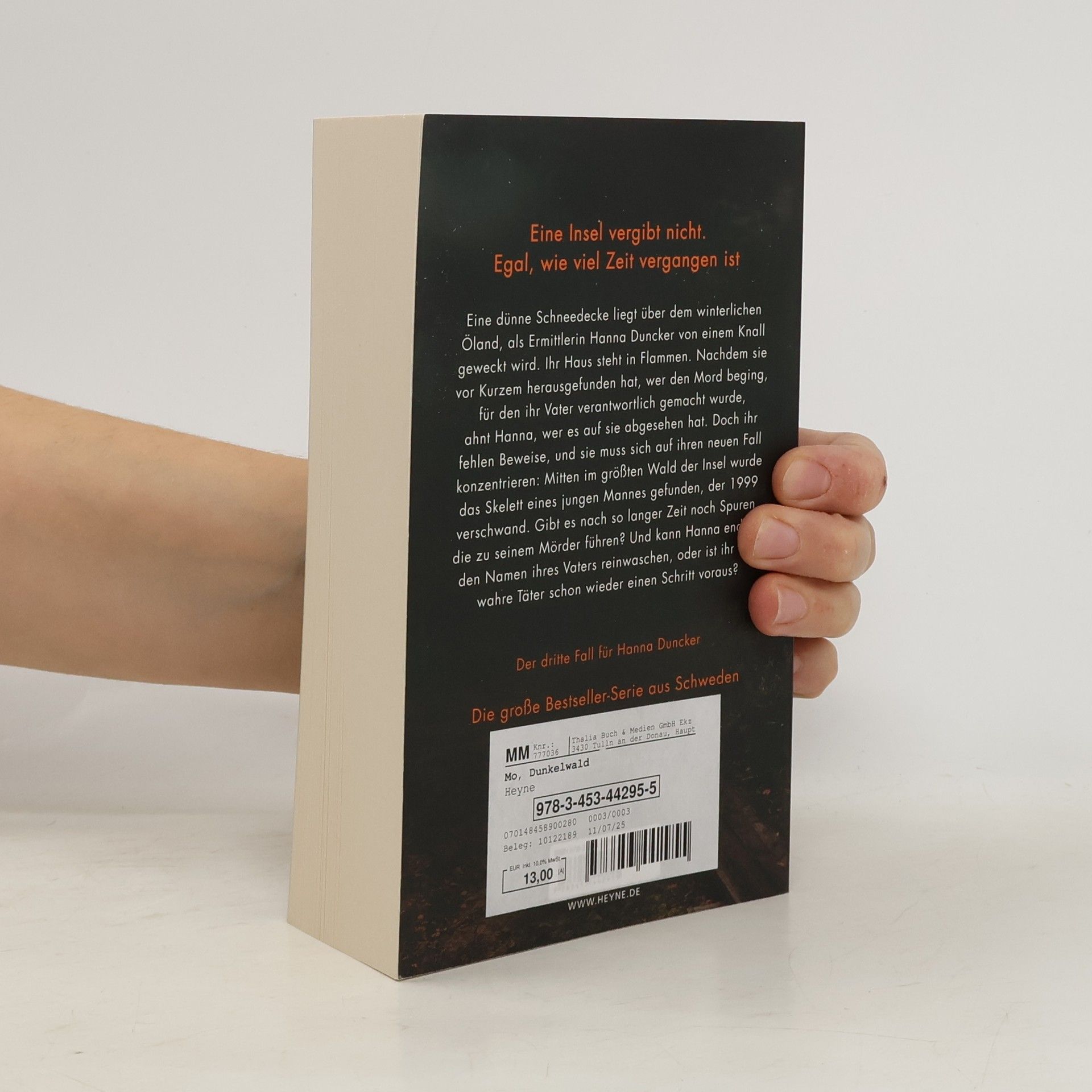 Eine Insel vergibt nicht. Egal, wie viel Zeit vergangen ist Eine Schneedecke liegt über dem winterlichen Öland, als Ermittlerin Hanna Duncker von einem Knall geweckt wird. Ihr Haus steht in Flammen. Nachdem sie vor Kurzem herausgefunden hat, wer den Mord beging, für den ihr Vater verantwortlich gemacht wurde, ahnt Hanna, wer es auf sie abgesehen hat. Doch ihr fehlen Beweise, und sie muss sich auf ihren neuen Fall konzentrieren: Mitten im größten Wald der Insel wurde das Skelett eines jungen Mannes gefunden, der 1999 verschwand. Gibt es nach so langer Zeit noch Spuren, die zu seinem Mörder führen? Und kann Hanna endlich den Namen ihres Vaters reinwaschen, oder ist ihr der wahre Täter schon wieder einen Schritt voraus? Die »Hanna Duncker«-Reihe: Band 1: Nachttod Band 2: Finsterhaus Band 3: Dunkelwald Band 4: Nebelstunde Band 5: Dämmersee Alle Bände können auch unabhängig voneinander gelesen werden.