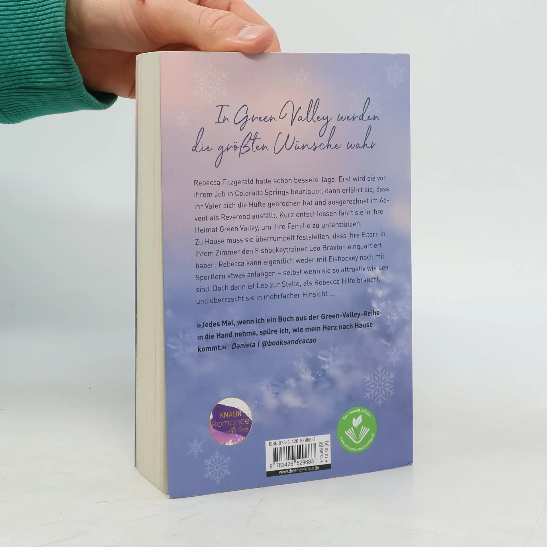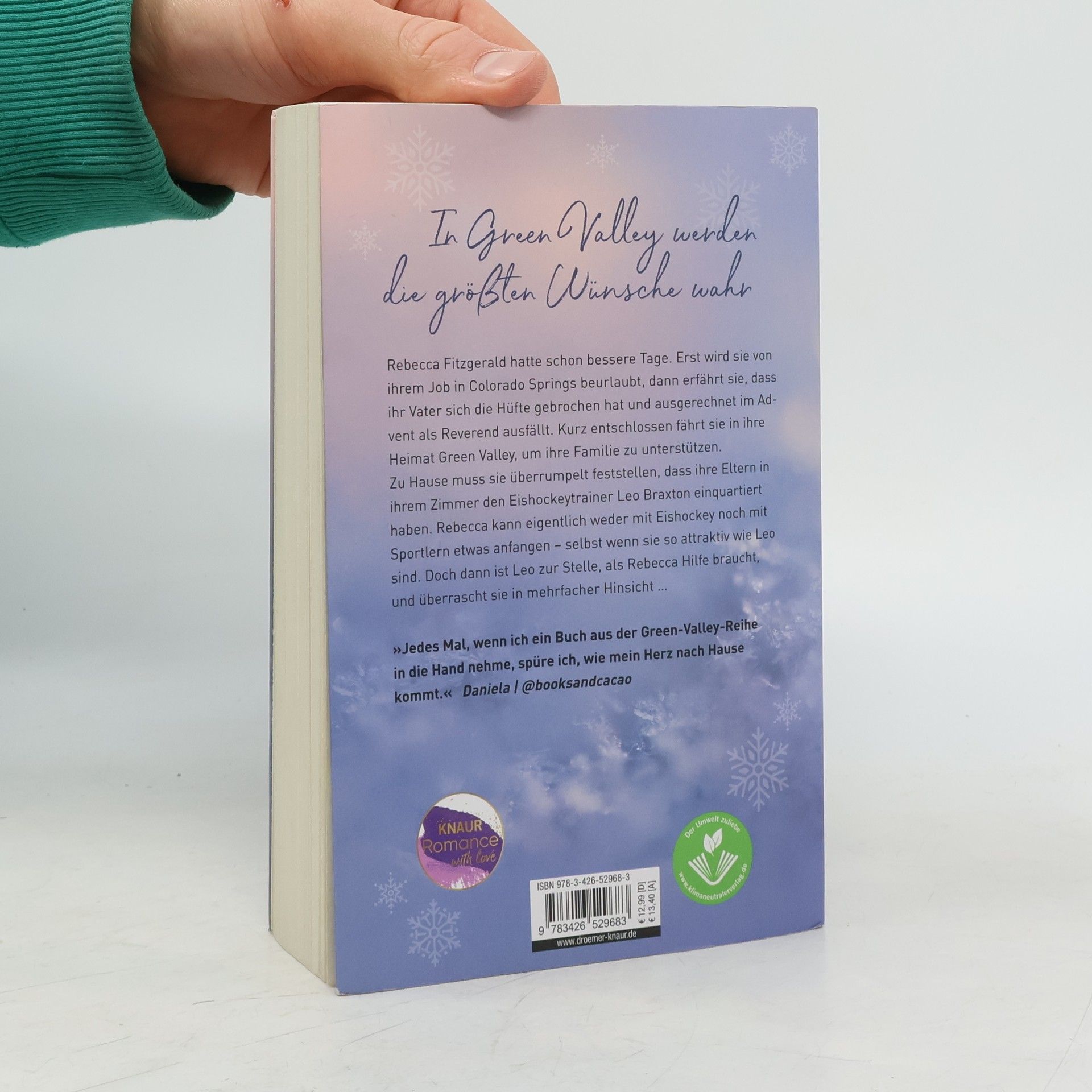 Cozy, romantisch und herzerwärmend: In ihrem neuen Liebesroman entführt Bestseller-Autorin Lilly Lucas erneut nach Green Valley, wo Rebecca Fitzgeralds Leben auf den Kopf gestellt wird. Nach einer Beurlaubung von ihrem Job in Colorado Springs und der Nachricht über die Verletzung ihres Vaters, der im Advent als Reverend ausfällt, kehrt sie in ihre Heimat zurück, um ihre Familie zu unterstützen. Dort trifft sie überraschend auf Leo Braxton, den Eishockeytrainer, der in ihrem Zimmer untergebracht ist. Obwohl Rebecca mit Eishockey und Sportlern wenig anfangen kann, wird Leo für sie zur unerwarteten Unterstützung in schwierigen Zeiten. Die idyllische Kleinstadt in den Rocky Mountains bietet in der Weihnachtszeit eine traumhafte Kulisse. Diese Geschichte ist ideal für Fans romantischer Liebesgeschichten und Winterromane, die eine herzerwärmende Erzählung suchen. Die Green-Valley-Reihe umfasst mehrere New-Adult-Liebesromane, die unabhängig voneinander gelesen werden können, darunter die Geschichten von Lena & Ryan, Izzy & Will, Elara & Noah, Annie & Cole, Leonie & Sam sowie ein Kurzroman über Sarah & Grayson.