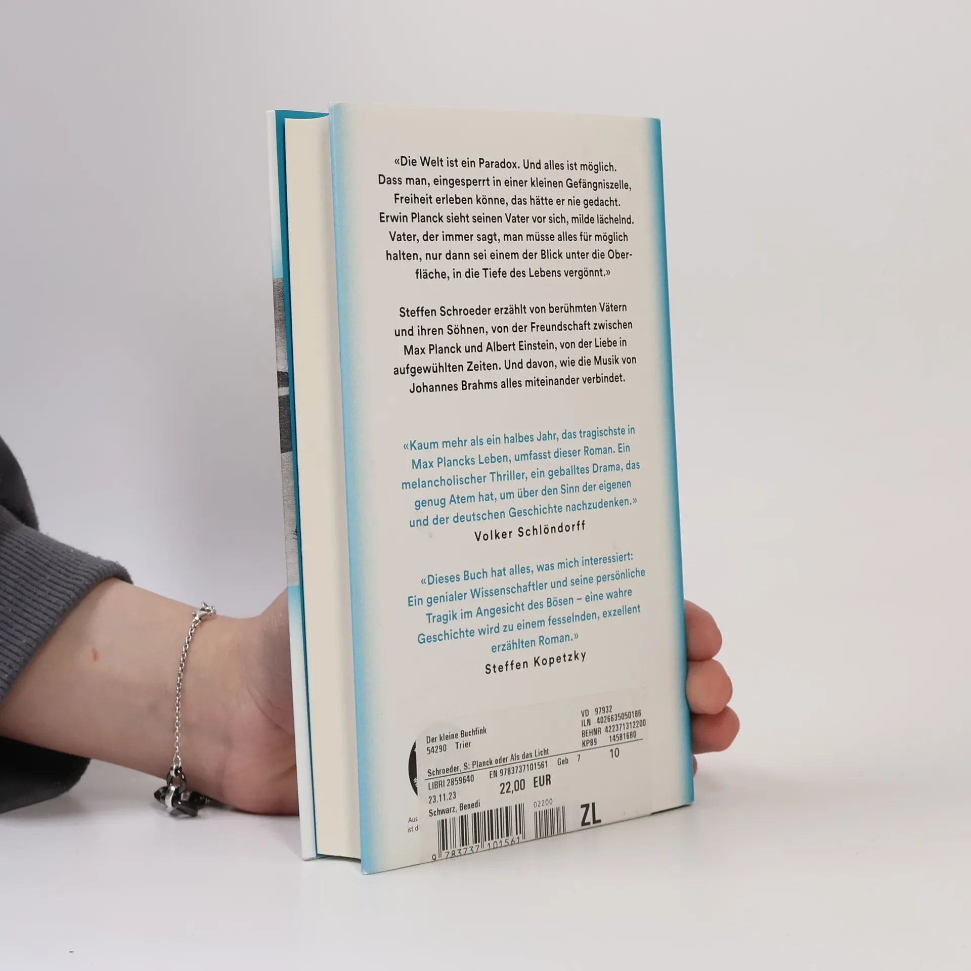 Oktober 1944. Mit sechsundachtzig Jahren steht Max Planck vor der schwersten Aufgabe seines Lebens. Der Nobelpreisträger soll ein «Bekenntnis zum Führer» verfassen. Viel hängt daran, denn Plancks geliebter Sohn Erwin, der am Hitler-Attentat vom 20. Juli beteiligt war, sitzt im Todestrakt von Tegel. Planck denkt zurück an frohe Tage und die dunkle Zeitenwende. Gefährten sind im Exil, vor allem vermisst er Albert Einstein. Der forscht in Amerika und widmet sich vielem, besonders den Frauen, allerdings gar nicht seinem Sohn Eduard, der in der Zürcher Heilanstalt Burghölzli mit seinen inneren Dämonen und dem fernen Vater ringt. Max Planck schreibt mit der Schwiegertochter Nelly Gnadengesuche für Erwin; dieser entdeckt die Weite des Daseins in einer Gefängniszelle. In der Berliner Reichskanzlei träumt Adolf Hitler vor einem Gemälde. Und Eduard Einstein erkennt, was die Welt im Innersten zusammenhält, während sein genialer Vater das Doppelspiel seiner russischen Geliebten nicht einmal ahnt. Steffen Schroeder erzählt von der Freundschaft zwischen Max Planck und Albert Einstein, vom Verhältnis berühmter Väter zu ihren Söhnen, von der Liebe in aufgewühlten Zeiten. Und davon, wie die Musik von Johannes Brahms alles miteinander verbindet.