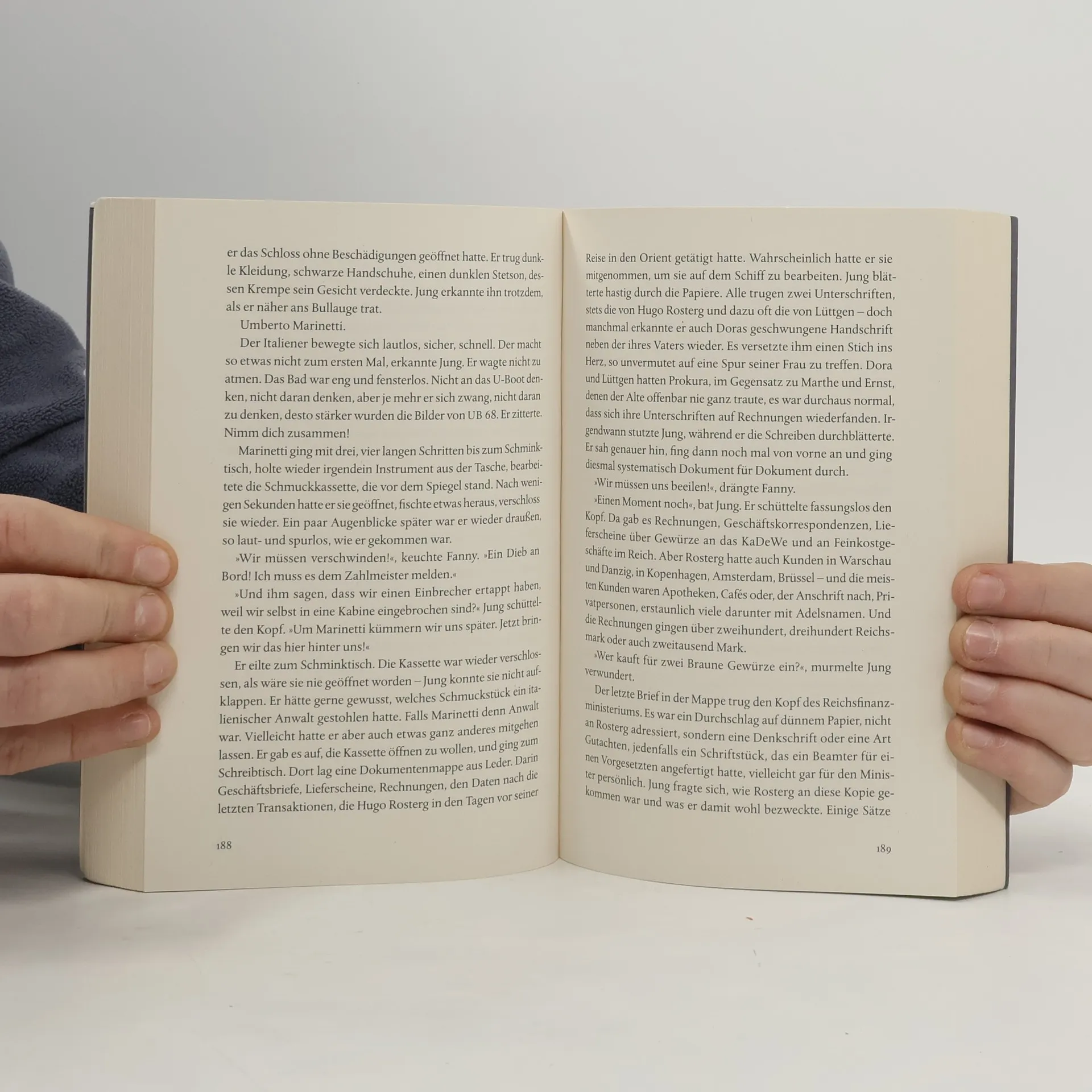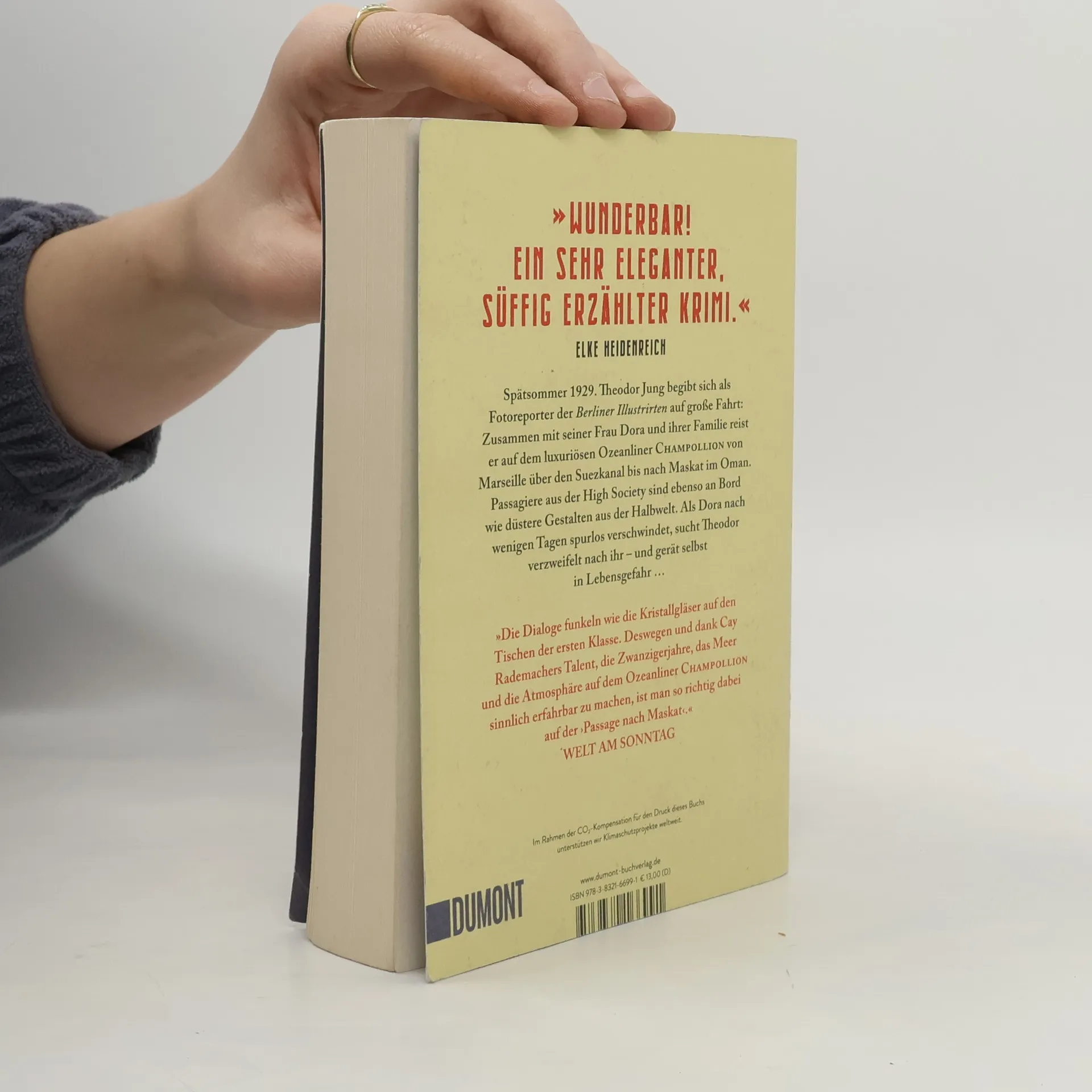 Spätsommer 1929, der letzte Sommer der Goldenen Zwanziger, ist geprägt von Luxus und Frivolität, während die Weltwirtschaftskrise naht. An Bord des Ozeanliners Champollion, der von Marseille in den Orient fährt, befinden sich illustre Passagiere: eine skandalumwitterte Nackttänzerin, ein mysteriöser römischer Anwalt, eine adelige englische Lady und ein Schläger aus der Unterwelt. Theodor Jung, ein Kriegsveteran und Fotoreporter der Berliner Illustrirten, soll eine Reportage über die Reise verfassen. Begleitet wird er von seiner Frau Dora, die aus einer Hamburger Kaufmannsfamilie stammt und nach Maskat reist, um mit den Gewürzen Arabiens zu handeln. Theodor hofft, dass die Reise ihre Ehe neu beleben kann, doch Doras Familie verachtet ihn, und der intrigante Prokurist Bertold Lüttgen hat eigene Interessen an Dora. Als sie nach wenigen Tagen spurlos verschwindet, wird die Reise für Theodor zum Albtraum. Nicht nur die Rostergs, sondern auch andere Passagiere und Besatzungsmitglieder behaupten, Dora nie an Bord gesehen zu haben. Die Dialoge funkeln wie Kristallgläser, und dank der Fähigkeit des Autors, die Atmosphäre der Zwanzigerjahre und das Leben auf dem Champollion lebendig darzustellen, wird der Leser tief in die Geschichte hineingezogen.