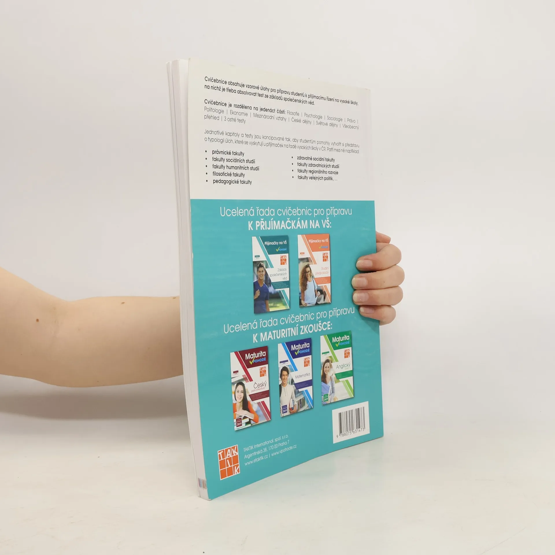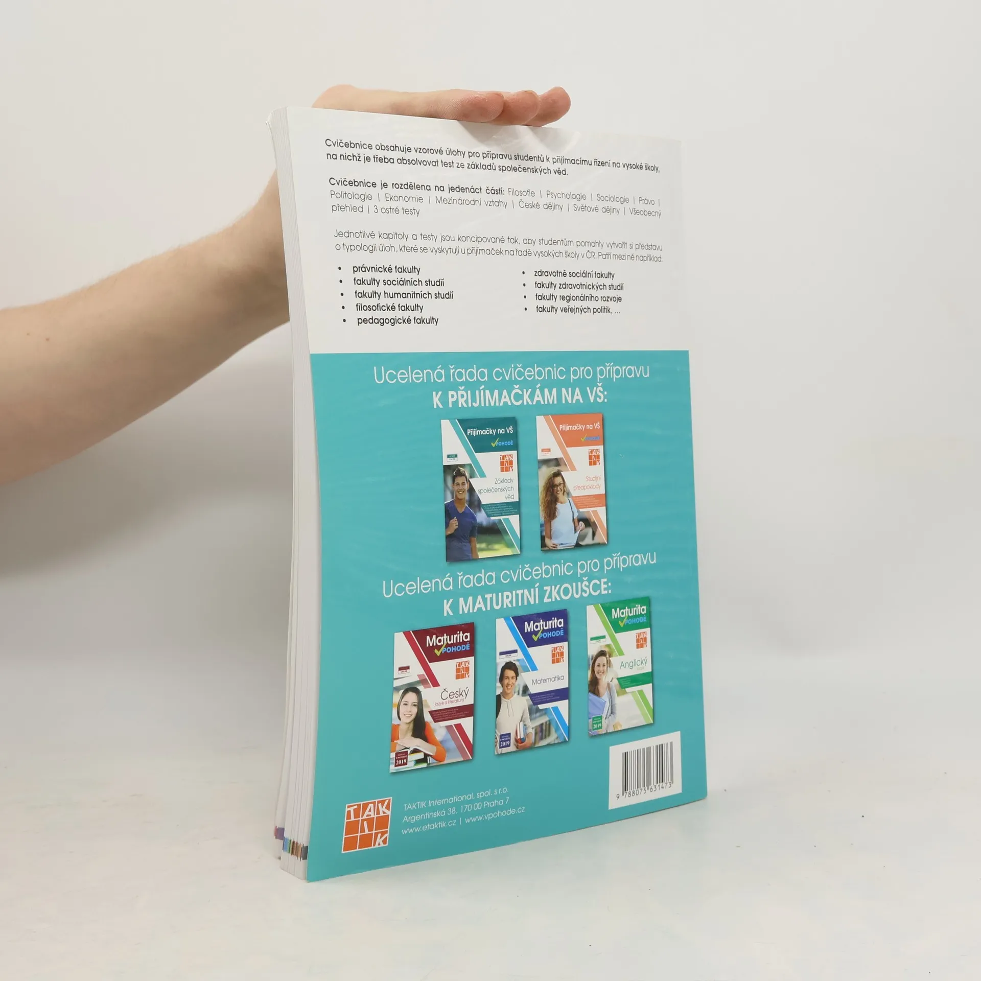 Cílem cvičebnic je poskytnout komplexní přípravu k přijímacímu řízení na vysoké školy, na nichž je třeba absolvovat test ze studijních předpokladů a základů společenských věd. Zpracováním různorodých typologií testových otázek a nejfrekventovanějších témat a oblastí z přijímacích řízení v ČR se podařilo žákům poskytnout kompletní podklady pro přípravu na testy ze studijních předpokladů a základů společenských věd na libovolnou vysokou školu v České republice. Cvičebnice obsahují vzorové úlohy pro přípravu studentů k přijímacímu řízení na vysoké školy, na nichž je třeba absolvovat test ze studijních předpokladů a základů společenských věd.