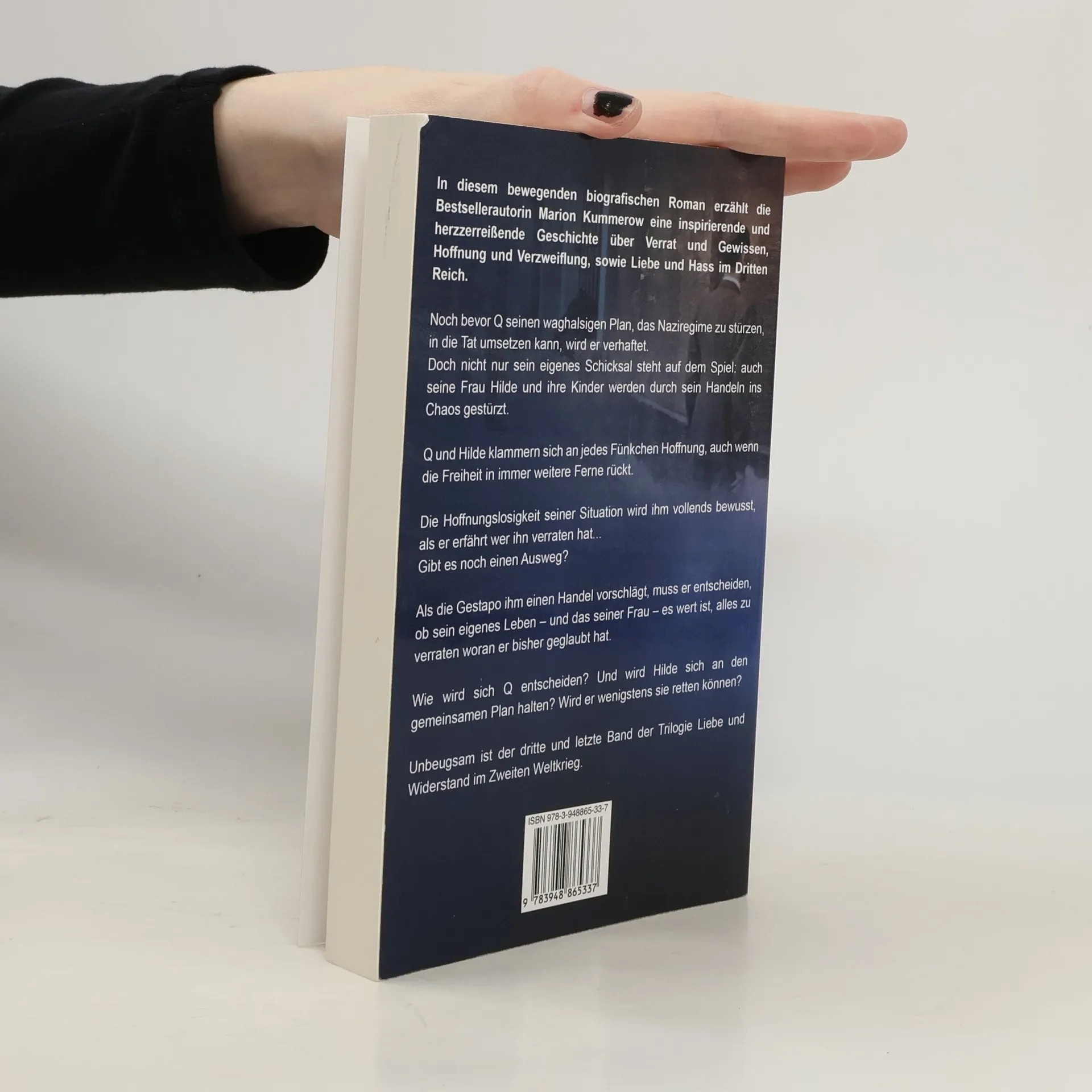 In diesem bewegenden biografischen Roman erzählt die Bestsellerautorin Marion Kummerow eine inspirierende und herzzerreißende Geschichte über Verrat und Gewissen, Hoffnung und Verzweiflung, sowie Liebe und Hass im Dritten Reich. Noch bevor Q seinen waghalsigen Plan, das Naziregime zu stürzen, in die Tat umsetzen kann, wird er verhaftet. Doch nicht nur sein eigenes Schicksal steht auf dem Spiel: auch seine Frau Hilde und ihre Kinder werden durch sein Handeln ins Chaos gestürzt. Q und Hilde klammern sich an jedes Fünkchen Hoffnung, auch wenn die Freiheit in immer weitere Ferne rückt. Die Hoffnungslosigkeit seiner Situation wird ihm vollends bewusst, als er erfährt wer ihn verraten hat... Gibt es noch einen Ausweg? Als die Gestapo ihm einen Handel vorschlägt, muss er entscheiden, ob sein eigenes Leben - und das seiner Frau - es wert ist, alles zu verraten woran er bisher geglaubt hat. Wie wird sich Q entscheiden? Und wird Hilde sich an den gemeinsamen Plan halten? Wird er wenigstens sie retten können? Unbeugsam ist der dritte und letzte Band der Trilogie Liebe und Widerstand im Zweiten Weltkrieg.