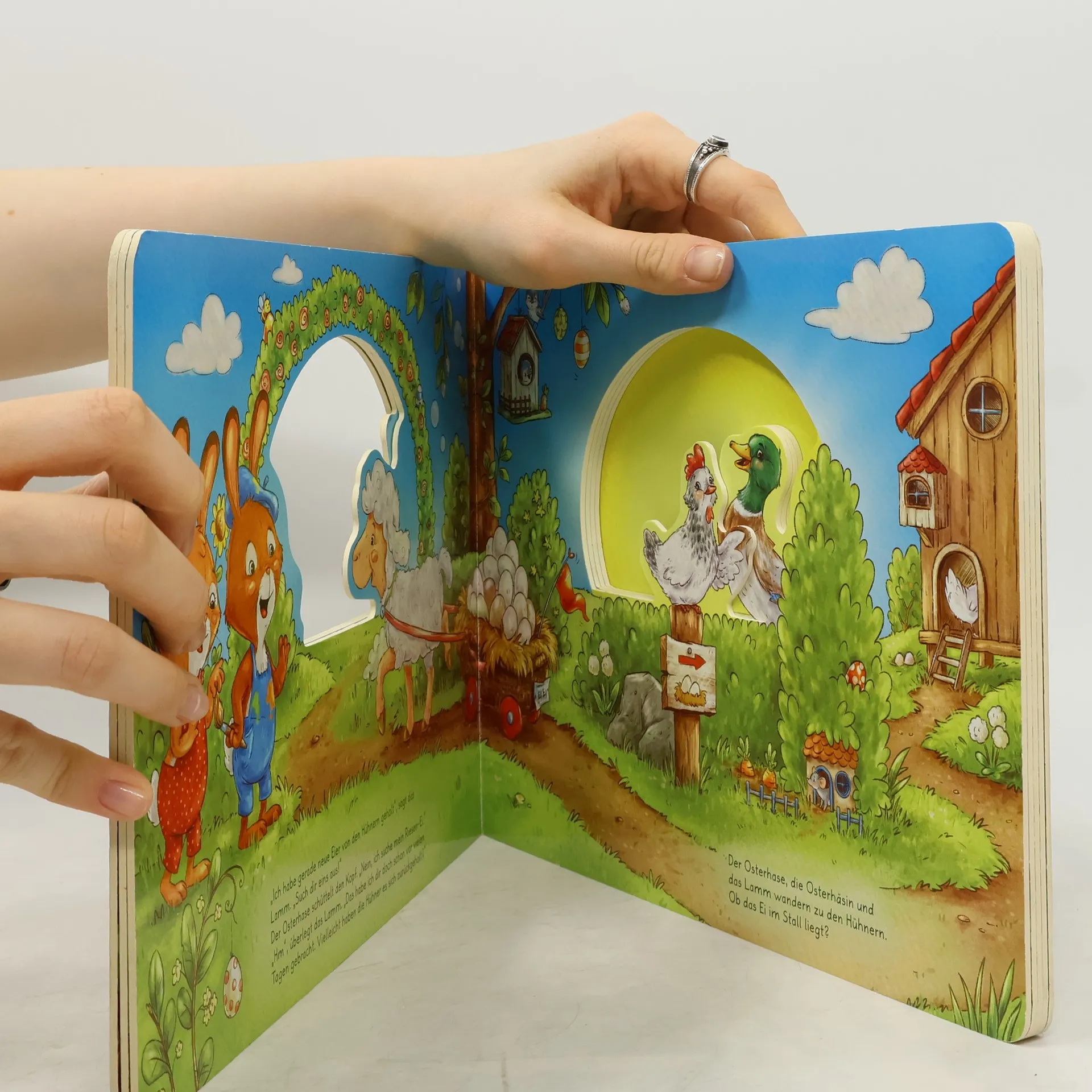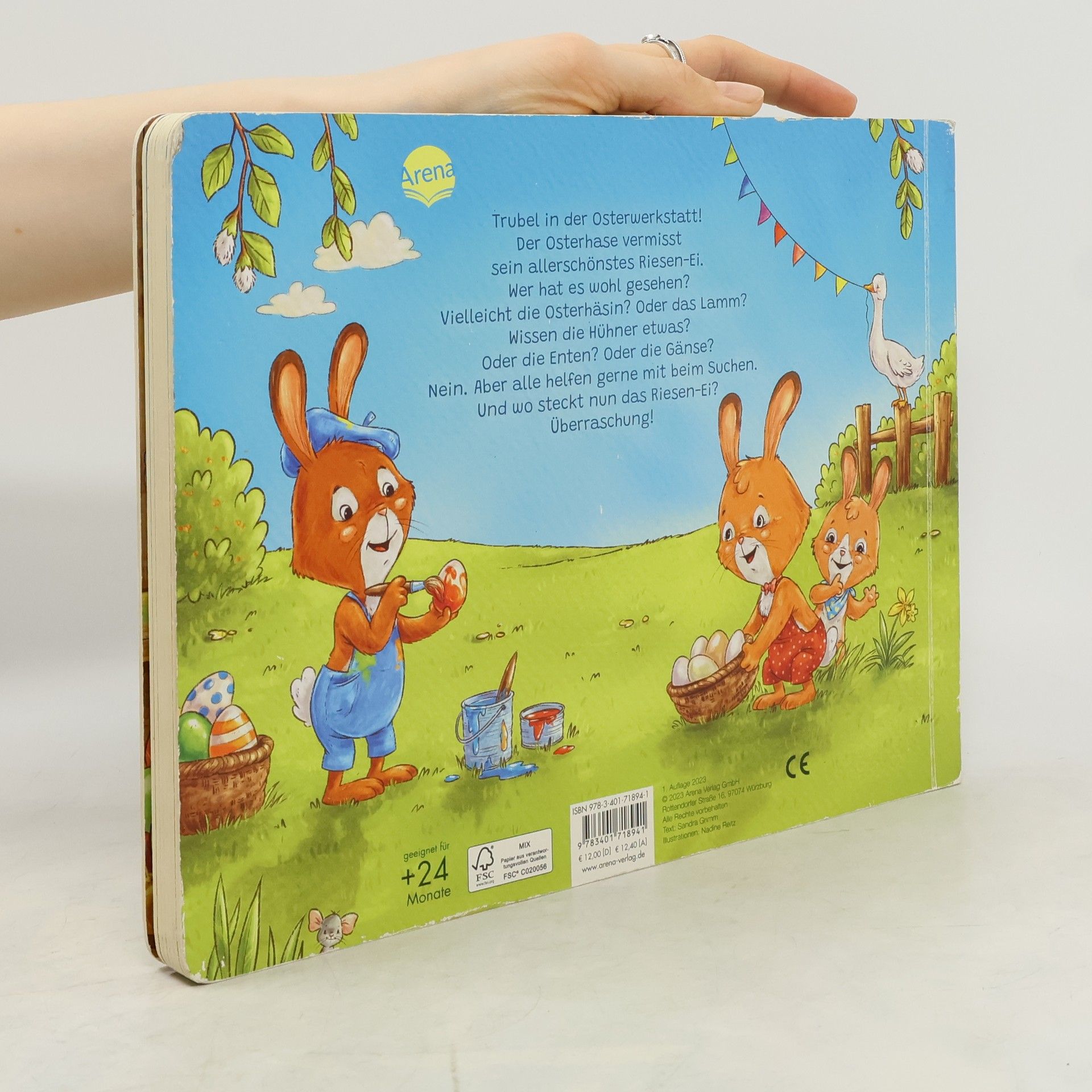 Das große Pappbilderbuch für die Osterzeit mit Figuren-Register erzählt die kleine Geschichte von einer turbulenten Eiersuche mit Osterhase , Osterhäsin und allen Lieblingstieren des Frühlings . Der Osterhase vermisst sein allerschönstes Riesen-Ei . Wer hat es wohl gesehen? Vielleicht die Osterhäsin ? Oder das Lamm ? Wissen die Hühner etwas? Oder die Enten ? Oder die Gänse ? Alle suchen gerne mit. Und wo steckt nun das Riesen-Ei ? Wird nicht verraten: Überraschung !