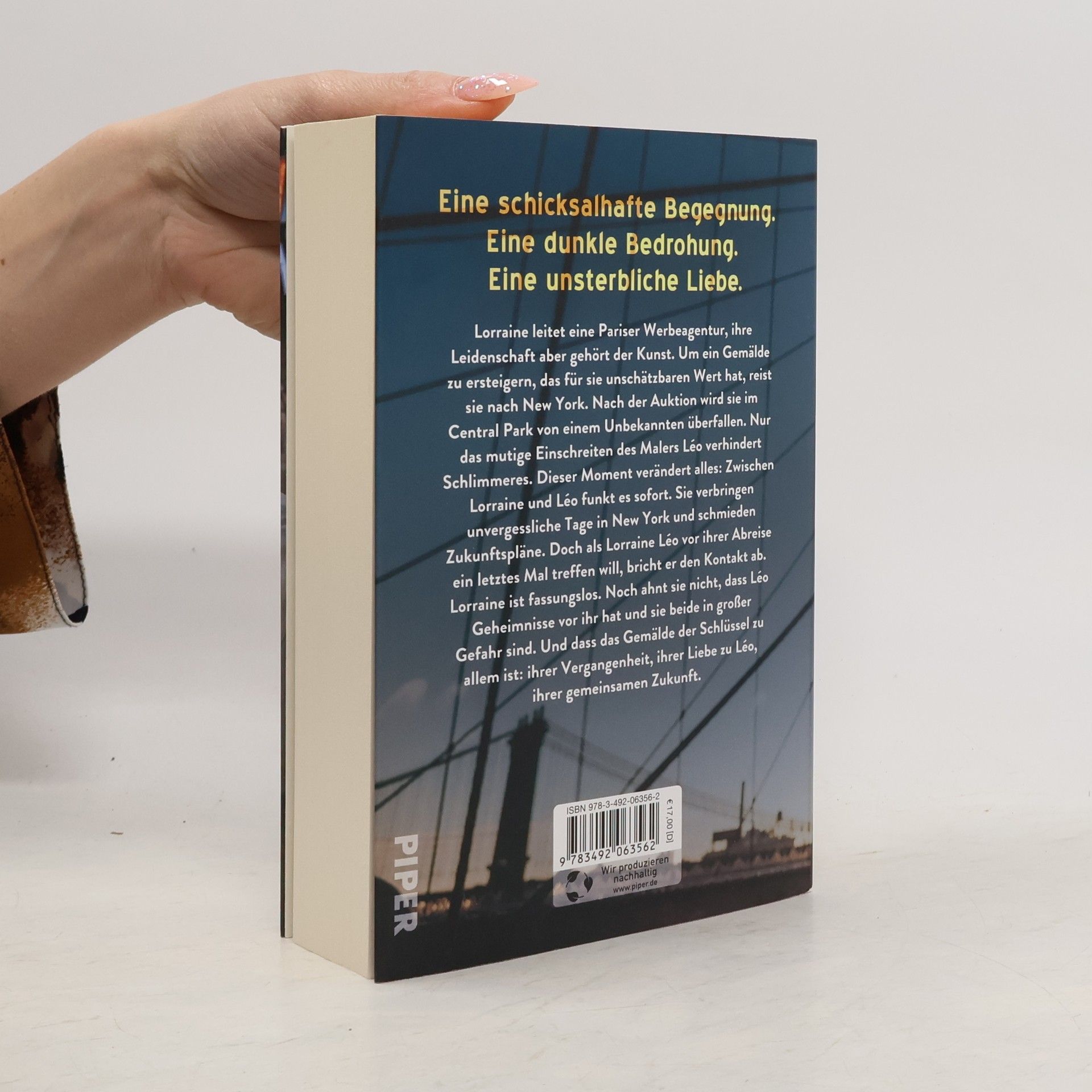 Eine Kunstsammlerin in Paris und ein Kunstfälscher in New York erleben eine schicksalhafte Begegnung und unsterbliche Liebe. Lorraine, die eine renommierte Pariser Werbeagentur leitet, hat eine Leidenschaft für Kunst. Bei der Versteigerung eines berühmten Gemäldes in New York wird sie im Central Park überfallen, doch der Maler Leo rettet sie. Zwischen den beiden entsteht sofort eine Verbindung, doch sie sind in Gefahr: Lorraine wird von einem Stalker verfolgt, der sie mit anonymen Nachrichten bedroht. Leo, der kürzlich aus dem Gefängnis entlassen wurde, kämpft mit seiner Vergangenheit und entdeckt etwas Schreckliches, das ihre Liebe gefährden könnte. Die Geschichte bietet eine einzigartige Liebesgeschichte und spannende Wendungen, ideal für Leser, die Guillaume Mussos Werke schätzen. Der Autor Mark Miller bleibt geheimnisvoll, und die Verlagswelt rätselt über seine Identität. Die Begeisterung für sein Debütroman ist groß: „Spannung, Action und Emotionen machen aus diesem Roman das Buch des Sommers!“ (Gala). Leser sind fasziniert von der Mischung aus Intrigen, Familiengeheimnissen und einer fesselnden Handlung, die mit einem unvorhersehbaren Ende überrascht. Mark Millers Meisterschaft in Sachen Spannung sorgt dafür, dass dieser Roman das Potenzial hat, ein Bestseller zu werden.