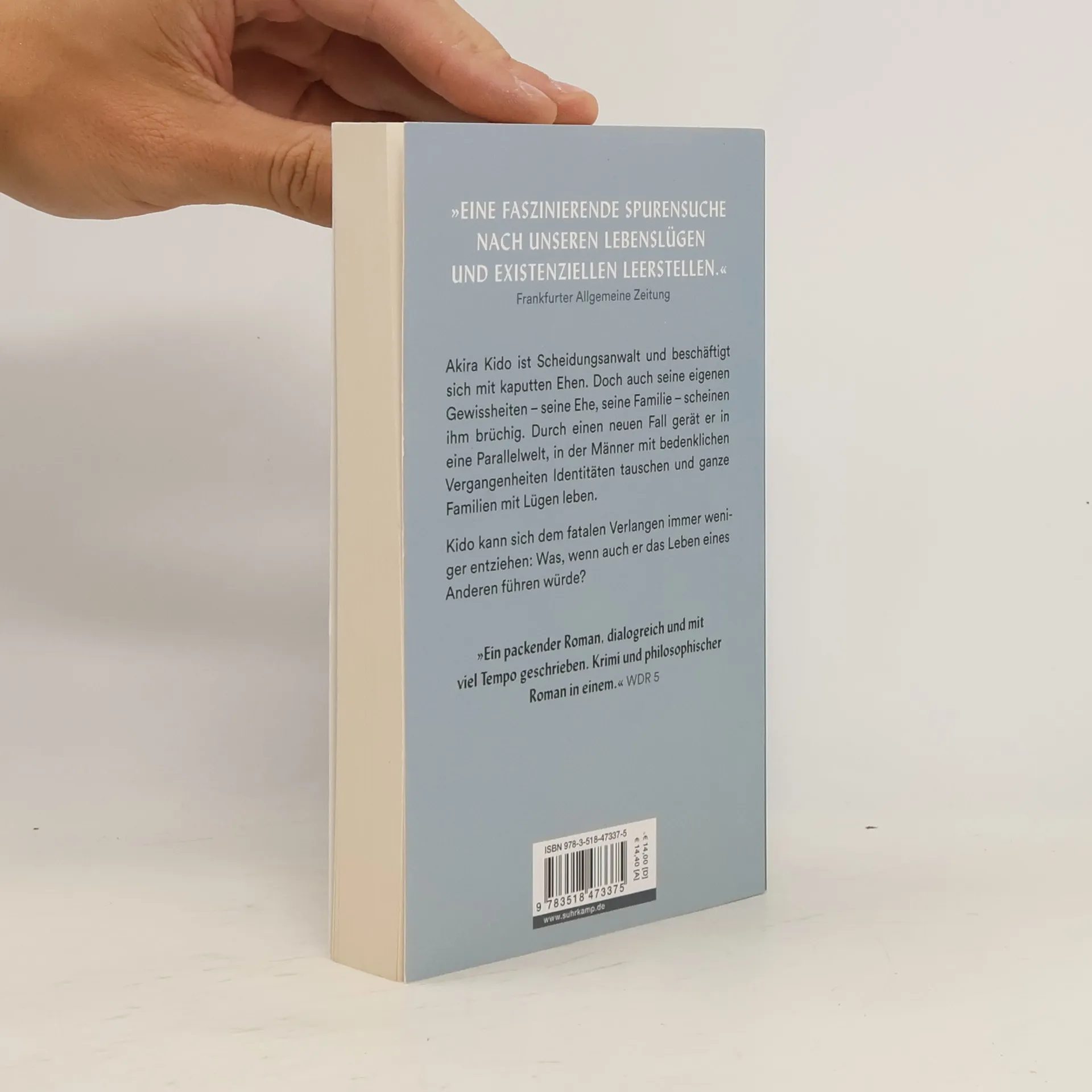 Akira Kido ist Scheidungsanwalt und beschäftigt sich mit kaputten Ehen. Doch auch seine eigenen Gewissheiten – seine Ehe, seine Familie – scheinen ihm brüchig. Durch einen neuen Fall gerät er in eine Parallelwelt, in der Männer mit bedenklichen Vergangenheiten Identitäten tauschen und ganze Familien mit Lügen leben. Kido kann sich dem fatalen Verlangen immer weniger entziehen: Was, wenn auch er das Leben eines Anderen führen würde? Was geschieht, wenn wir mit einer anderen Person die Identität tauschen? Wie liebt man, wie lebt man in der Lüge? Keiichirō Hirano, der große, bisher noch nicht ins Deutsche übersetzte Gegenwartsautor Japans, schreibt in einem raffinierten literarischen Spiel über eine scheinbar ganz normale japanische Familie – und über das fatale Verlangen, das Leben eines Anderen zu führen.