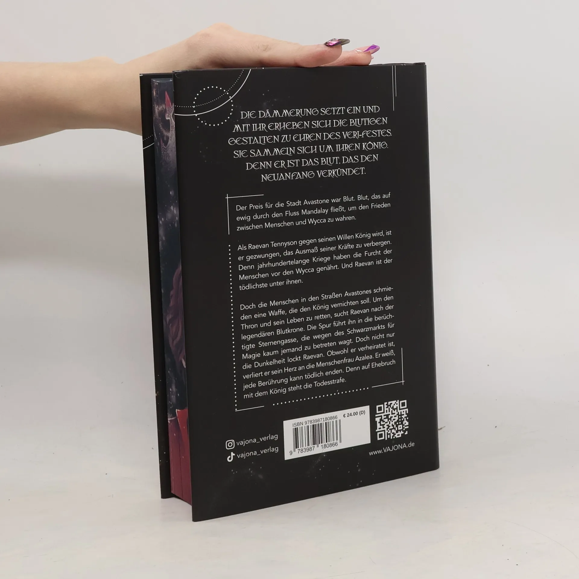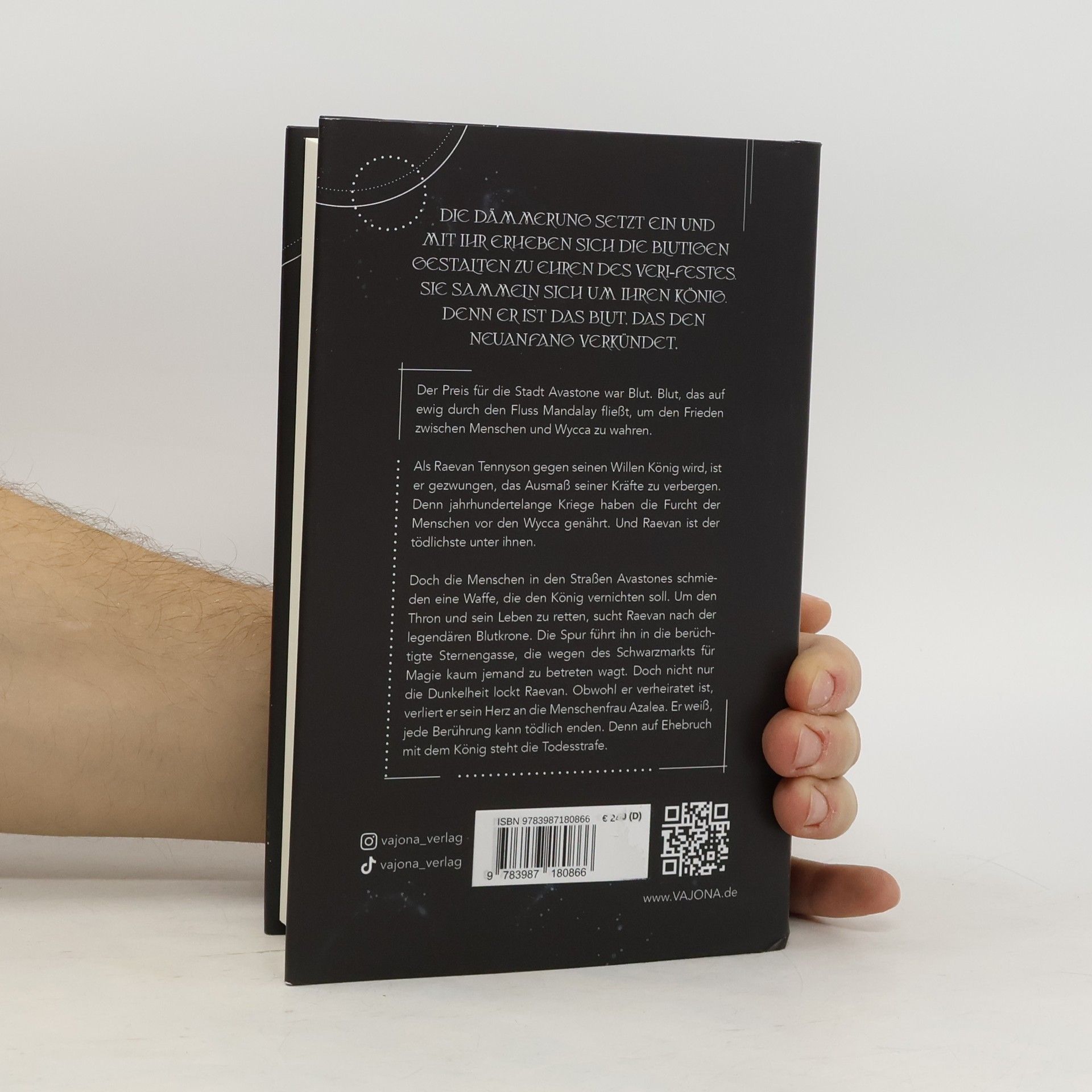 *DIE DÄMMERUNG SETZT EIN UND MIT IHR ERHEBEN SICH DIE BLUTIGEN GESTALTEN ZU EHREN DES VERI-FESTES. SIE SAMMELN SICH UM IHREN KÖNIG. DENN ER IST DAS BLUT, DAS DEN NEUANFANG VERKÜNDET.* Der Preis für die Stadt Avastone war Blut. Blut, das auf ewig durch den Fluss Mandalay fließt, um den Frieden zwischen Menschen und Wycca zu wahren. Als Raevan Tennyson gegen seinen Willen König wird, ist er gezwungen, das Ausmaß seiner Kräfte zu verbergen. Denn jahrhundertelange Kriege haben die Furcht der Menschen vor den Wycca genährt. Und Raevan ist der tödlichste unter ihnen. Doch die Menschen in den Straßen Avastones schmieden eine Waffe, die den König vernichten soll. Um den Thron und sein Leben zu retten, sucht Raevan nach der legendären Blutkrone. Die Spur führt ihn in die berüchtigte Sternengasse, die wegen des Schwarzmarkts für Magie kaum jemand zu betreten wagt. Doch nicht nur die Dunkelheit lockt Raevan. Obwohl er verheiratet ist, verliert er sein Herz an die Menschenfrau Azalea. Er weiß, jede Berührung kann tödlich enden. Denn auf Ehebruch mit dem König steht die Todesstrafe. DER DUNKLE SCHREI EINES DÜSTEREN AUFTAKTES, EINER ERGREIFENDEN REIHE. THE TALE OF WYCCA!