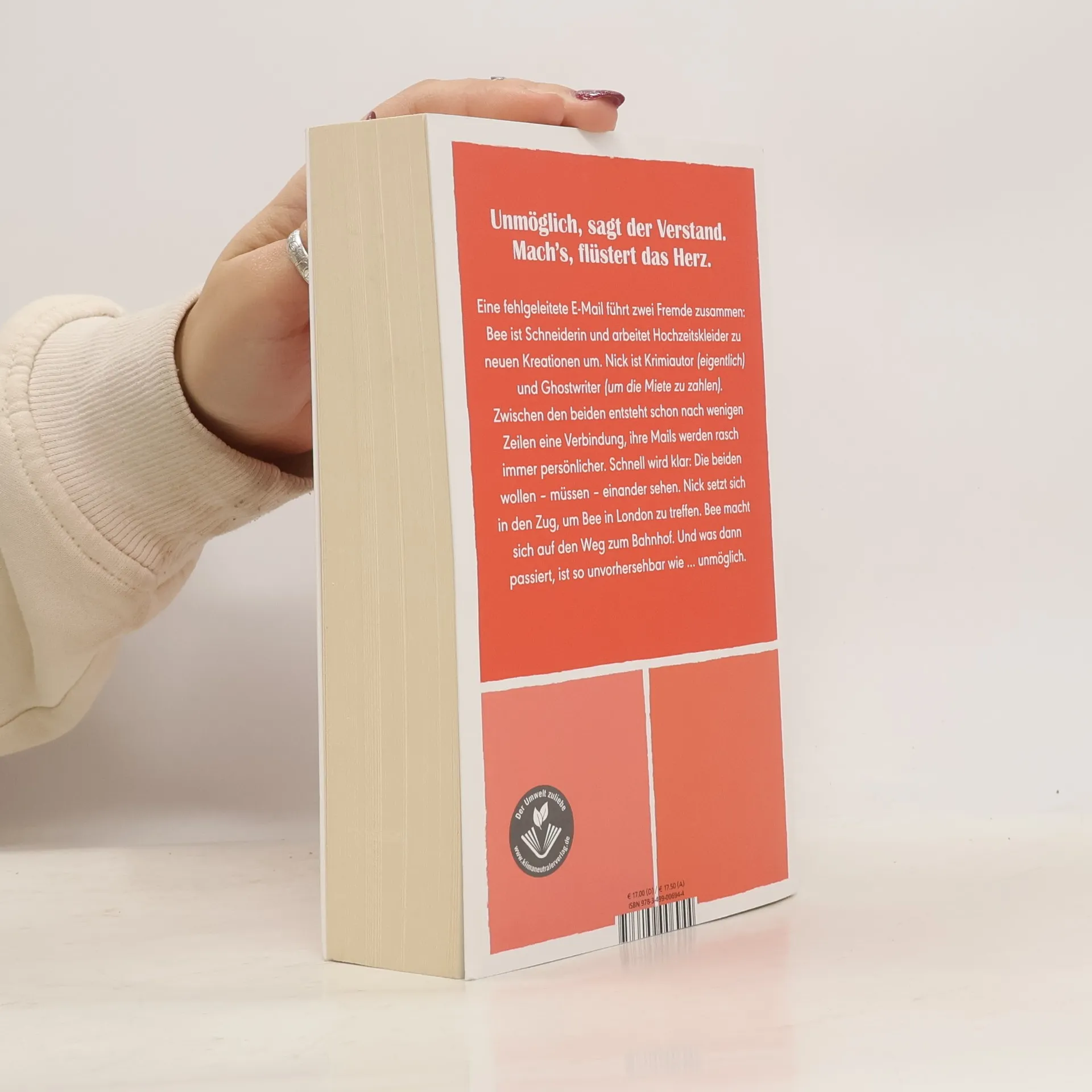 Was wäre, wenn alles stimmt zwischen zwei Menschen – und die Liebe trotzdem unmöglich ist? Eine fehlgeleitete E-Mail führt zwei Fremde zusammen: Bee ist Schneiderin und arbeitet Hochzeitskleider zu neuen Kreationen um. Nick ist Krimiautor (eigentlich) und Ghostwriter (um die Miete zu zahlen). Zwischen den beiden entsteht schon nach wenigen Zeilen eine Verbindung, ihre Mails werden rasch immer persönlicher. Schnell wird klar: Die beiden wollen – müssen – einander sehen. Nick setzt sich in den Zug, um Bee in London zu treffen. Bee macht sich auf den Weg zum Bahnhof. Und was dann passiert, ist so unvorhersehbar wie ... unmöglich. Eine Liebesgeschichte für unsere Zeit: Wenn das Leben zu kompliziert ist. Wenn die Welt aus den Fugen geraten ist. Und wenn wir trotzdem daran glauben, dass die Liebe alles überwinden kann.