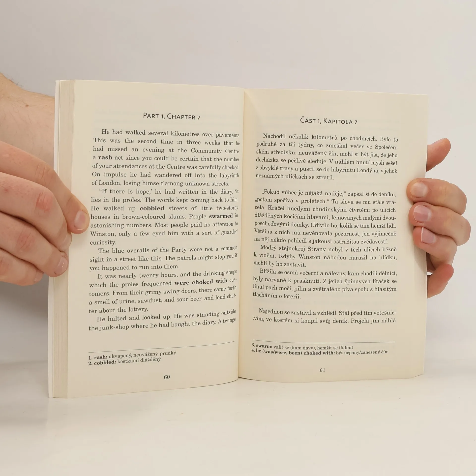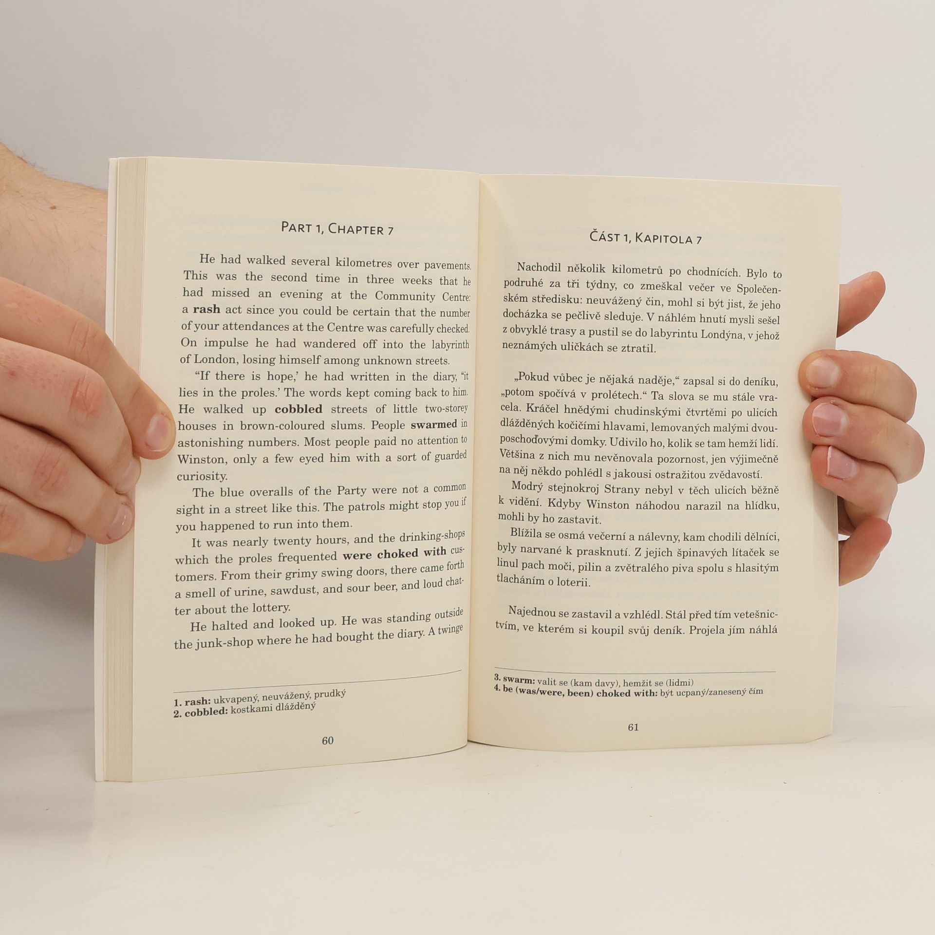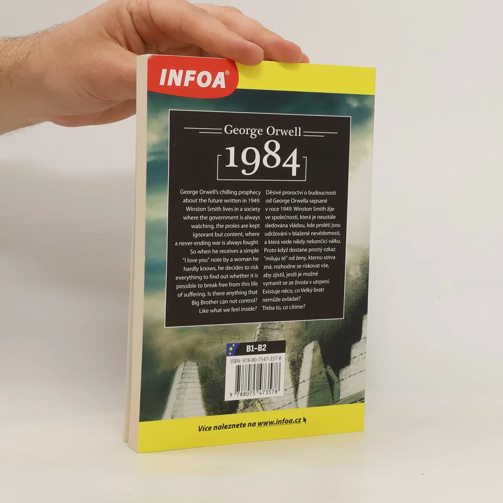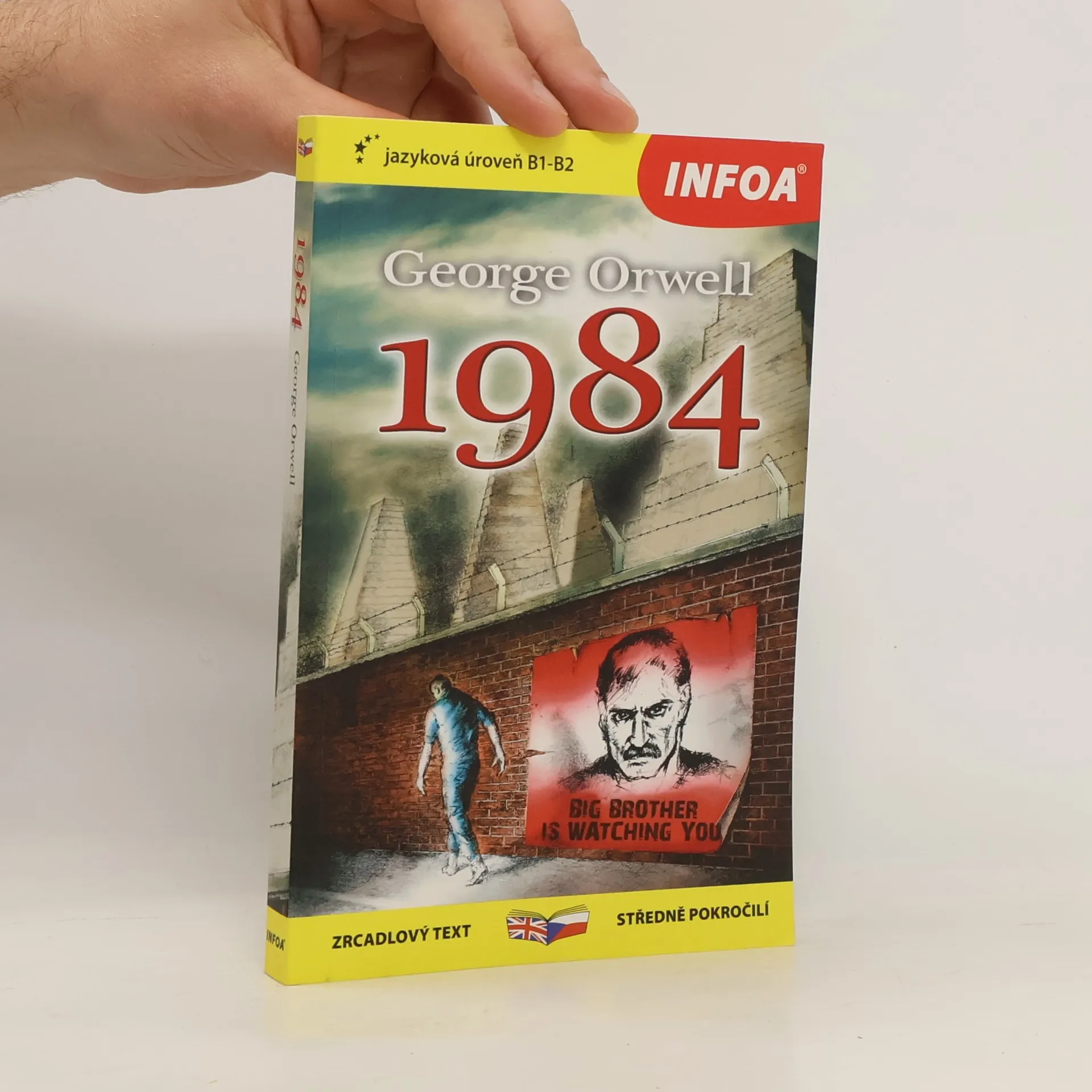 Zrcadlová edice kultovní knihy 1984 – na sudých stranách anglický originál, na stranách lichých český překlad. Zjednodušené, ilustrované převyprávění Nicka Gerrarda vhodné pro studenty anglického jazyka s jazykovou úrovní B1–B2 (středně pokročilí). Děsivé proroctví o budoucnosti od George Orwella sepsané v roce 1984. Winston Smith žije ve společnosti, která je neustále sledována vládou, kde proléti jsou udržováni v blažené nevědomosti, a která vede nikdy nekončící válku. Proto když dostane prostý vzkaz miluju tě od ženy, kterou sotva zná, rozhodne se riskovat vše, aby zjistil, jestli je možné vymanit se ze života v utrpení. Existuje něco, co Velký bratr nemůže ovládat? Třeba to, co cítíme?