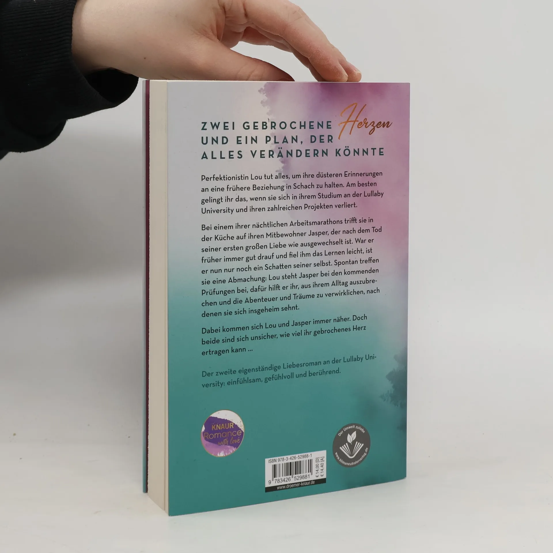 Zwei gebrochene Herzen – ein Plan, der alles verändern könnte … In Jennifer Wileys neuem New-Adult-Roman an der Lullaby University müssen Lou Simson und Jasper Branson sich ihrer Vergangenheit stellen und treffen eine besondere Abmachung. Perfektionistin Lou kämpft, ihre düsteren Erinnerungen an eine frühere Beziehung zu bewältigen. Am besten gelingt ihr das, wenn sie beschäftigt ist, etwa beim nächtlichen Lernen für ihr Umweltmanagement-Studium. Bei einem dieser nächtlichen Marathonarbeiten trifft sie in der Wohnheimküche auf Jasper, der nach dem Verlust seiner ersten großen Liebe verändert ist. War er einst lebensfroh, ist er nun ein Schatten seiner selbst. Aus einigen Albernheiten, die beiden guttun, entsteht ein Plan: Lou hilft Jasper bei seinen Prüfungen, während er ihr zeigt, wie man das Leben genießt. Durch Aktivitäten wie Tanzen im Regen, Hang Gliding und Camping im Modoc National Forest kommen sie sich näher. Doch beide sind unsicher, wie viel ihr gebrochenes Herz ertragen kann. Die Geschichte spielt an einem kleinen, renommierten College in der Nähe eines wunderschönen Nationalparks in Kalifornien und bietet eine emotionale Liebesgeschichte, die von atemberaubender Naturschönheit umgeben ist.