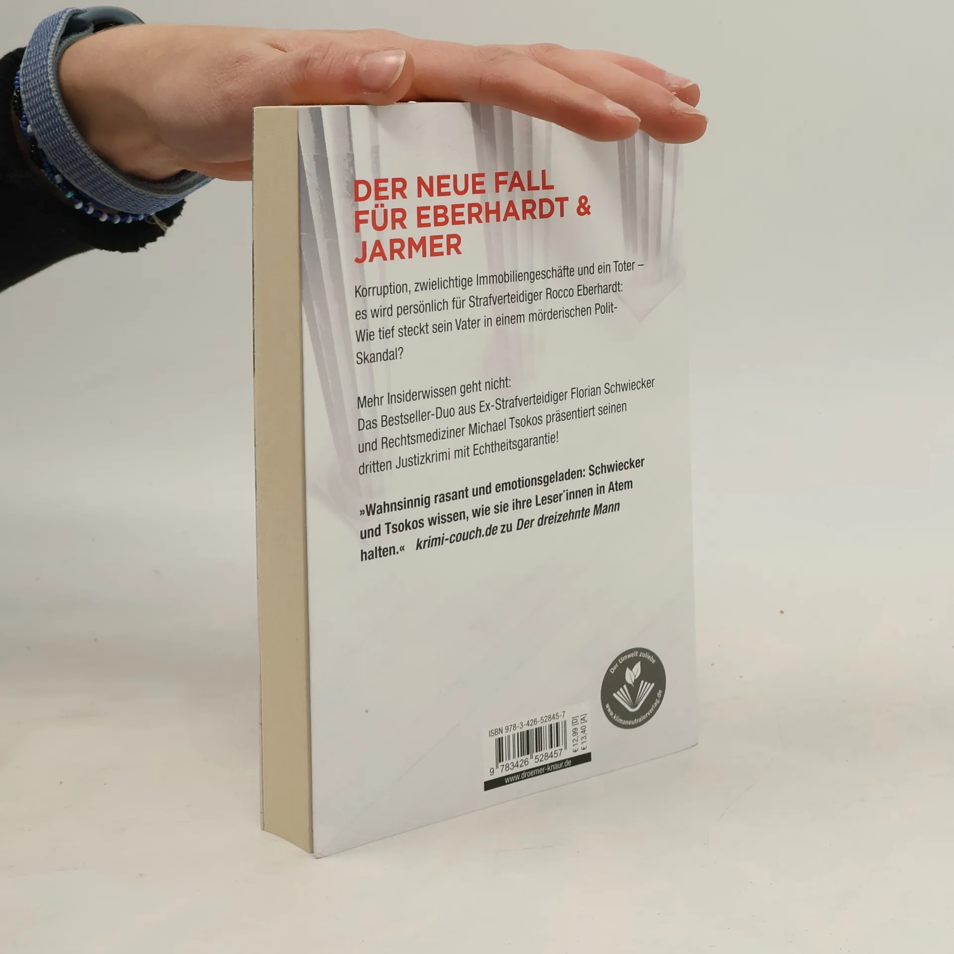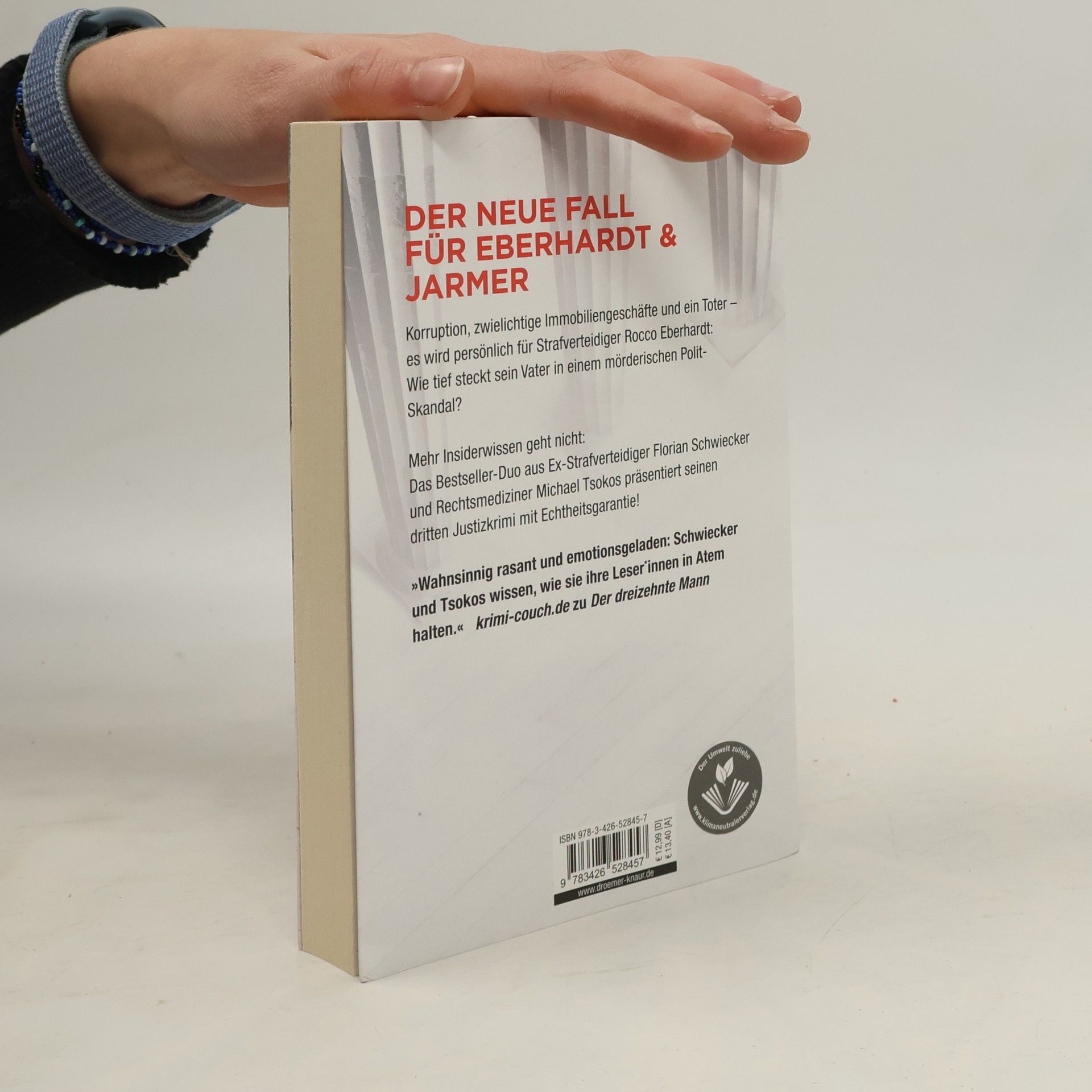 Es wird persönlich für Strafverteidiger Rocco Eberhardt, als sein Vater in einen mörderischen Polit-Skandal verwickelt wird. Im dritten Justiz-Krimi der Bestseller-Autoren Michael Tsokos und Florian Schwiecker geht es um Korruption, fragwürdige Immobiliengeschäfte und einen Mord. Ein geleaktes Video erschüttert Berlin: Bausenator Dieter Möller verhandelt darin schmutzige Immobiliendeals mit einem russischen Oligarchen, und Rocco Eberhardts Vater scheint ebenfalls beteiligt zu sein. Als der Tontechniker, der das Video aufgenommen hat, tot aufgefunden wird, wird Möller plötzlich des Mordes beschuldigt. In seiner Verzweiflung bittet er Rocco um Unterstützung und beteuert seine Unschuld. Doch die ermittelnde Kommissarin findet immer mehr belastende Beweise gegen den Bausenator, und Rocco steht vor der schwierigen Frage, ob sein Vater einen Mörder schützt. Die Justiz-Krimis um Rocco Eberhardt und Rechtsmediziner Justus Jarmer sind packende Hochgeschwindigkeitskrimis, die den Leser fesseln. Die Reihe „Eberhardt & Jarmer ermitteln“ umfasst bereits mehrere Bestseller, darunter „Die siebte Zeugin“ und „Der dreizehnte Mann“.
