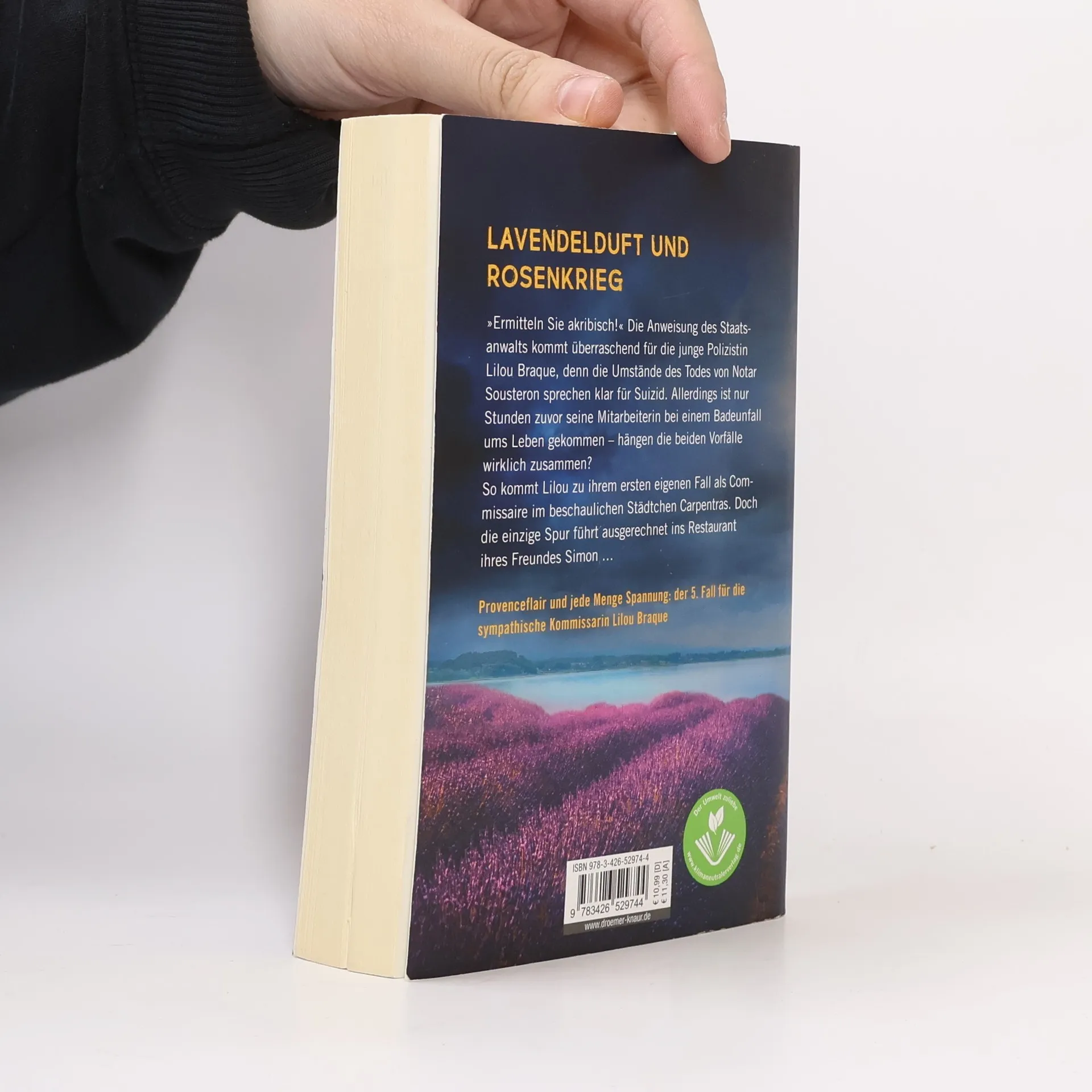 Lavendel-Duft und ein mörderischer Rosenkrieg: Mit einer Leiche in einem Badesee beginnt der 5. Provence-Krimi um die sympathische junge Kommissarin Lilou Braque. Die junge Kommissarin Lilou Braque und ihr Freund Simon wollen einen wunderbar warmen Herbsttag im beschaulichen Carpentras für einen Badeausflug nutzen – und machen eine furchtbare Entdeckung: Im Wasser des Lac du Péty treibt der leblose Körper einer Frau. Alles deutet auf einen tragischen Unfall hin. Kurz darauf wird Lilou zu einem weiteren Todesfall gerufen, offenbar hat sich der Notar Jean-Claude Sousteron mit seiner eigenen Waffe erschossen. Als Lilou jedoch herausfindet, dass die Tote vom See eine Mitarbeiterin des Notars war, kommen ihr erste Zweifel. Und die einzige Spur führt ausgerechnet in Simons Restaurant … Carine Bernards Krimi-Reihe »Die Lavendel-Morde« verströmt den Duft von Lavendel und provenzalischen Köstlichkeiten und bietet spannende Unterhaltung zum Wohlfühlen – ob im Frankreich-Urlaub oder auf dem heimischen Balkon. Die Provence-Krimis um Lilou Braque sind in folgender Reihenfolge erschienen: Lavendel-Tod Lavendel-Gift Lavendel-Fluch Lavendel-Grab Lavendel-Zorn