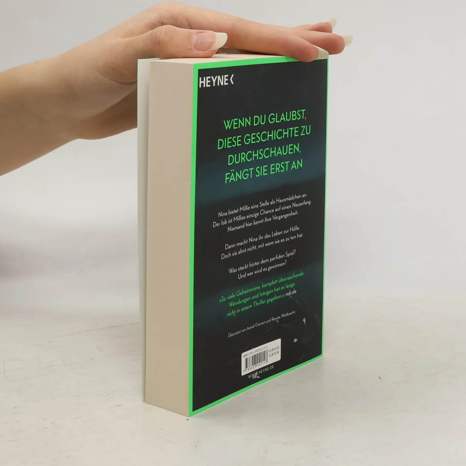 Wenn du glaubst, diese Geschichte zu durchschauen, fängt sie erst an Millie kann ihr Glück kaum fassen, als die elegante Nina ihr die Stelle als Haushaltshilfe inklusive Kost und Logis bei ihrer Familie auf Long Island anbietet. Schließlich hat sie eine Vergangenheit, von der niemand etwas wissen soll. Doch kaum ist Millie eingezogen, zeigt Nina ihr wahres Gesicht: Sie verwüstet das Haus und unterstellt ihr Dinge, die sie nicht getan hat. Ihre verwöhnte Tochter behandelt Millie ohne jeden Respekt. Nur Ninas attraktiver Mann Andrew ist nett zu ihr. Wäre da nur nicht Ninas wachsende Eifersucht. Hat sie Millie nur eingestellt, um ihr das Leben zur Hölle zu machen? Oder hat auch sie ein dunkles Geheimnis, von dem niemand etwas erfahren darf?