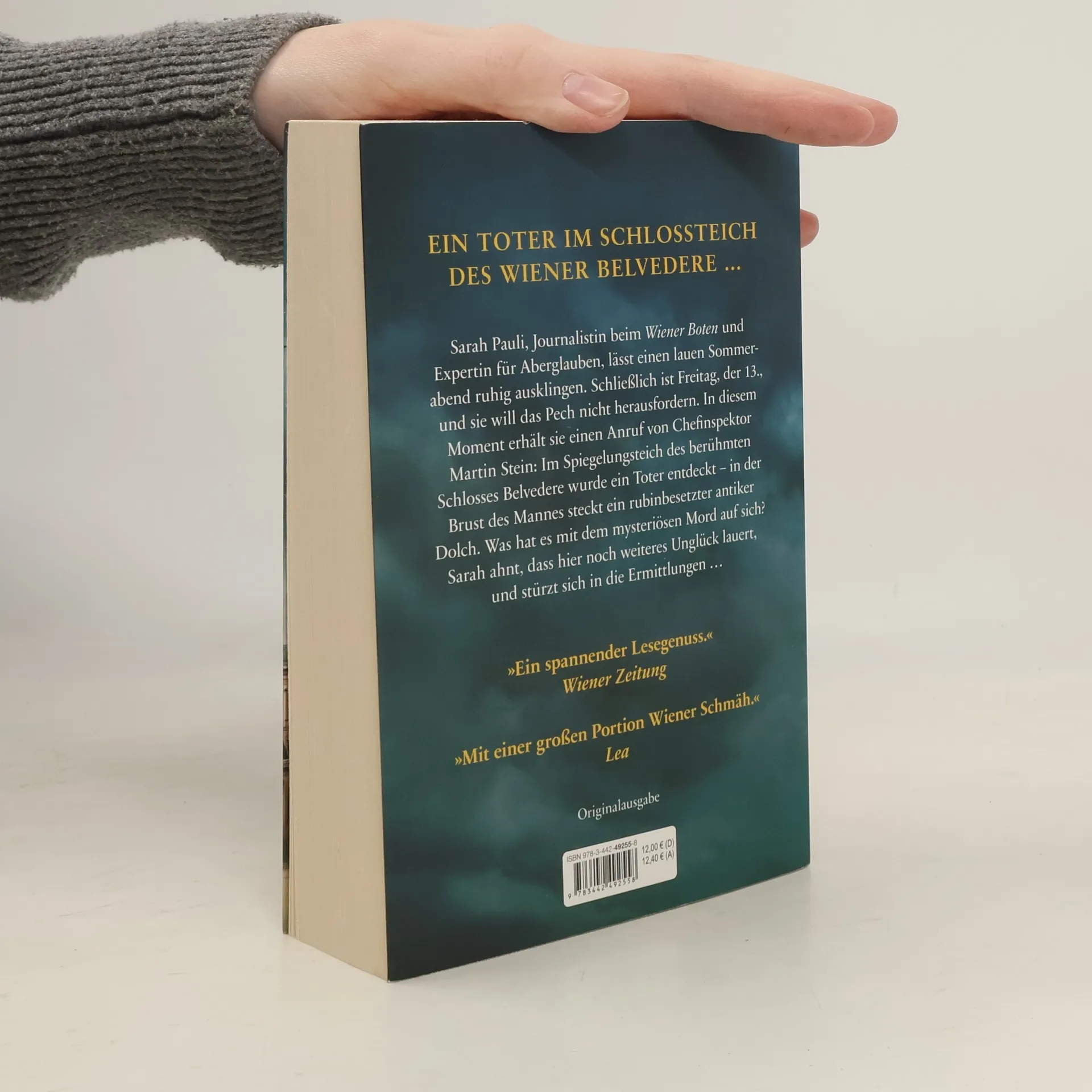 Ein Toter im Schlossteich des Wiener Belvedere – der dreizehnte Fall für die Journalistin Sarah Pauli. Sarah Pauli, Journalistin beim Wiener Boten und Expertin für Aberglauben, lässt einen lauen Sommerabend ruhig ausklingen. Schließlich ist Freitag, der 13., und sie will das Pech nicht herausfordern. In diesem Moment erhält sie einen Anruf von Chefinspektor Martin Stein: Im Spiegelungsteich des berühmten Schlosses Belvedere wurde ein Toter entdeckt – in der Brust des Mannes steckt ein rubinbesetzter antiker Dolch. Was hat es mit dem mysteriösen Mord auf sich? Sarah ahnt, dass hier noch weiteres Unglück lauert, und stürzt sich in die Ermittlungen …