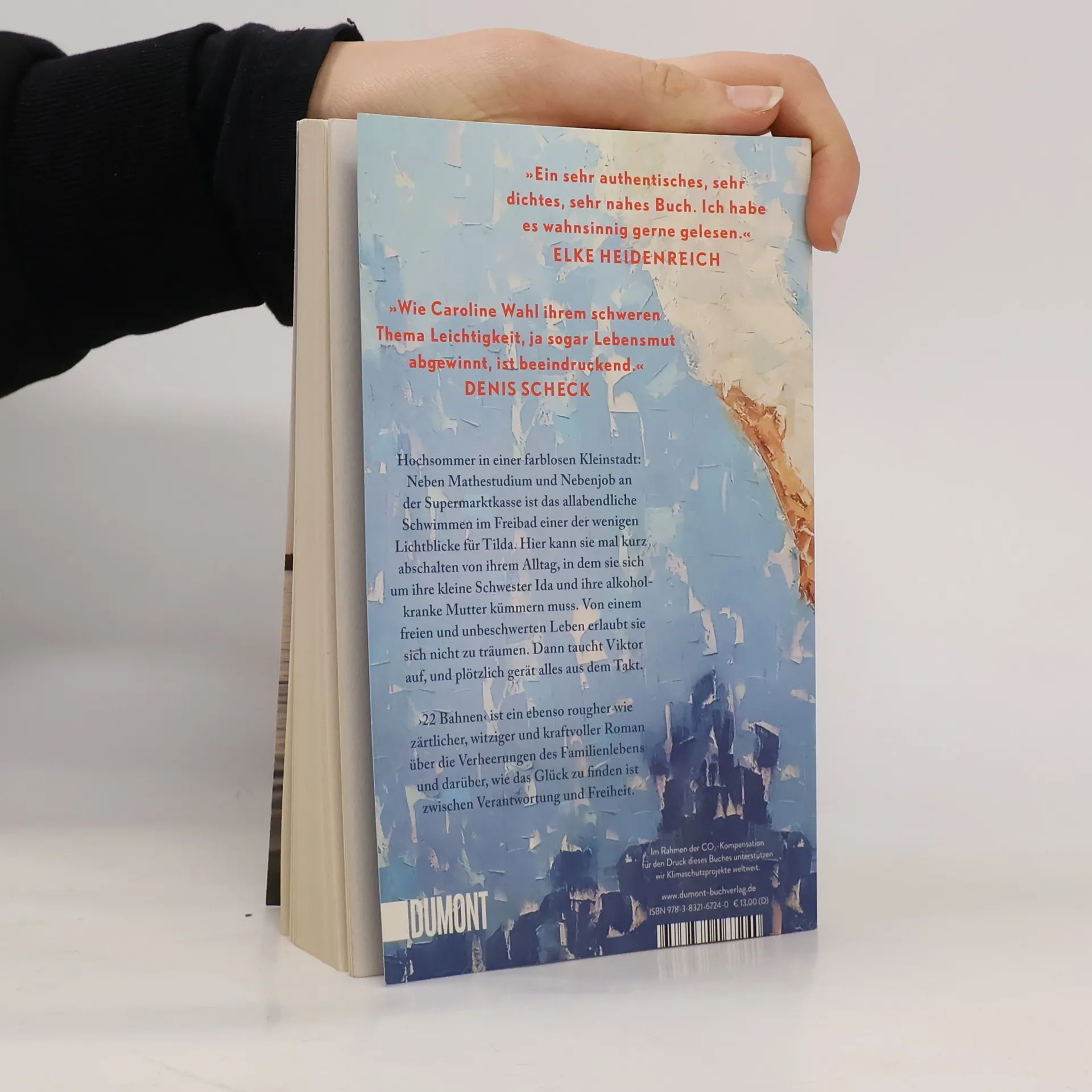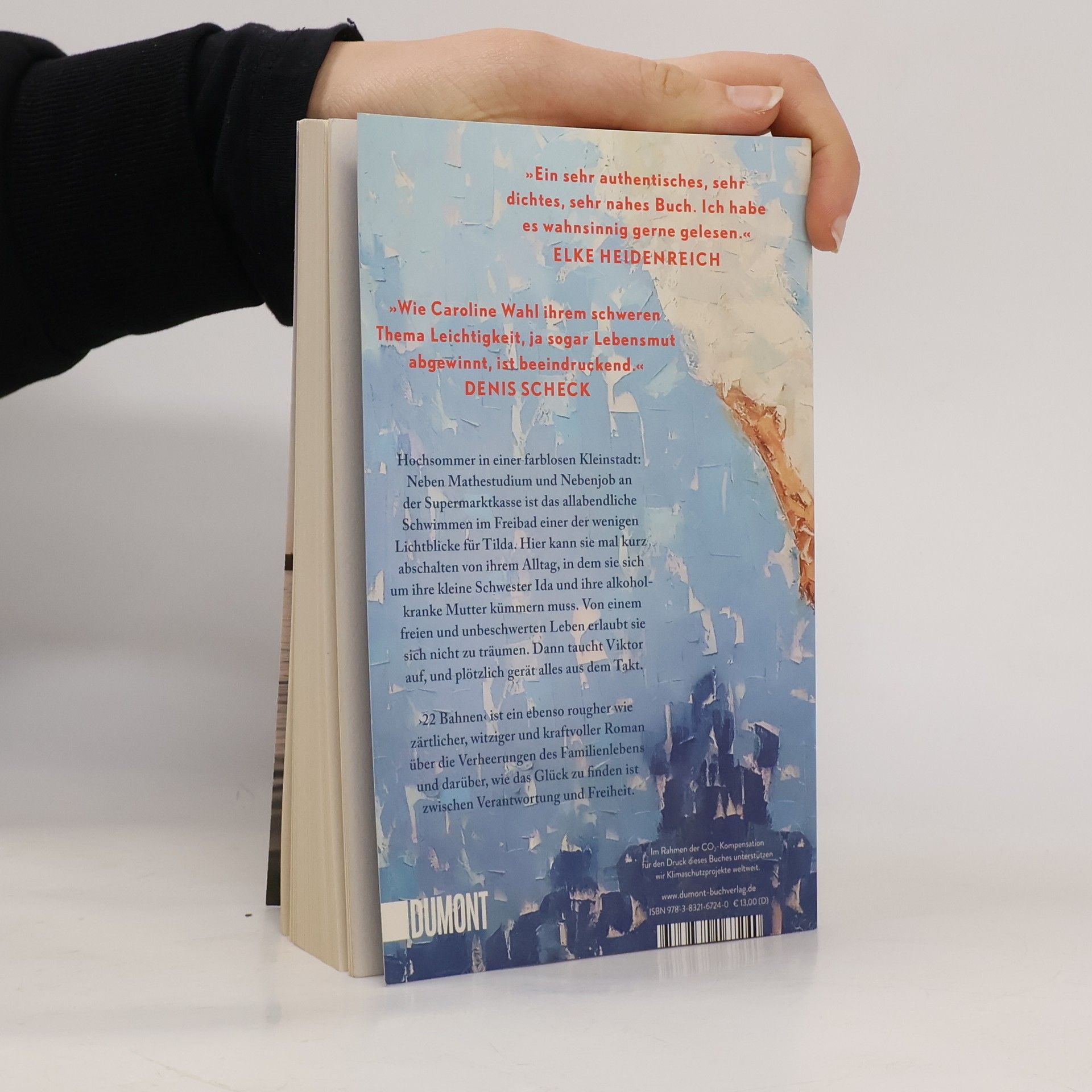 Tildas Tage sind strikt durchgetaktet: studieren, an der Supermarktkasse sitzen, sich um ihre kleine Schwester Ida kümmern und an schlechten Tagen auch um die Mutter. Zu dritt wohnen sie im traurigsten Haus der Fröhlichstraße in einer Kleinstadt, die Tilda hasst. Ihre Freunde sind längst weg, leben in Amsterdam oder Berlin, nur Tilda ist geblieben. Denn irgendjemand muss für Ida da sein, Geld verdienen, die Verantwortung tragen. Nennenswerte Väter gibt es keine, die Mutter ist alkoholabhängig. Eines Tages aber geraten die Dinge in Bewegung: Tilda bekommt eine Promotion in Berlin in Aussicht gestellt, und es blitzt eine Zukunft auf, die Freiheit verspricht. Und Viktor taucht auf, der große Bruder von Ivan, mit dem Tilda früher befreundet war. Viktor, der genau wie sie immer 22 Bahnen schwimmt. Doch als Tilda schon beinahe glaubt, es könnte alles gut werden, gerät die Situation zu Hause vollends außer Kontrolle. ›22 Bahnen‹ ist eine raue und gleichzeitig zärtliche Geschichte über die Verheerungen des Familienlebens und darüber, wie das Glück zu finden ist zwischen Verantwortung und Freiheit. »Caroline Wahl findet das Besondere im Alltäglichen und das Tröstliche im Schmerzvollen. Ein berührendes und feinsinniges Buch, mit dem man gern befreundet wäre.« BENEDICT WELLS »Ich bin durch ›22 Bahnen‹ gerauscht und hellauf begeistert. Herzerwärmend, fein, gnadenlos und richtig schön zugleich.« ALINA BRONSKY
