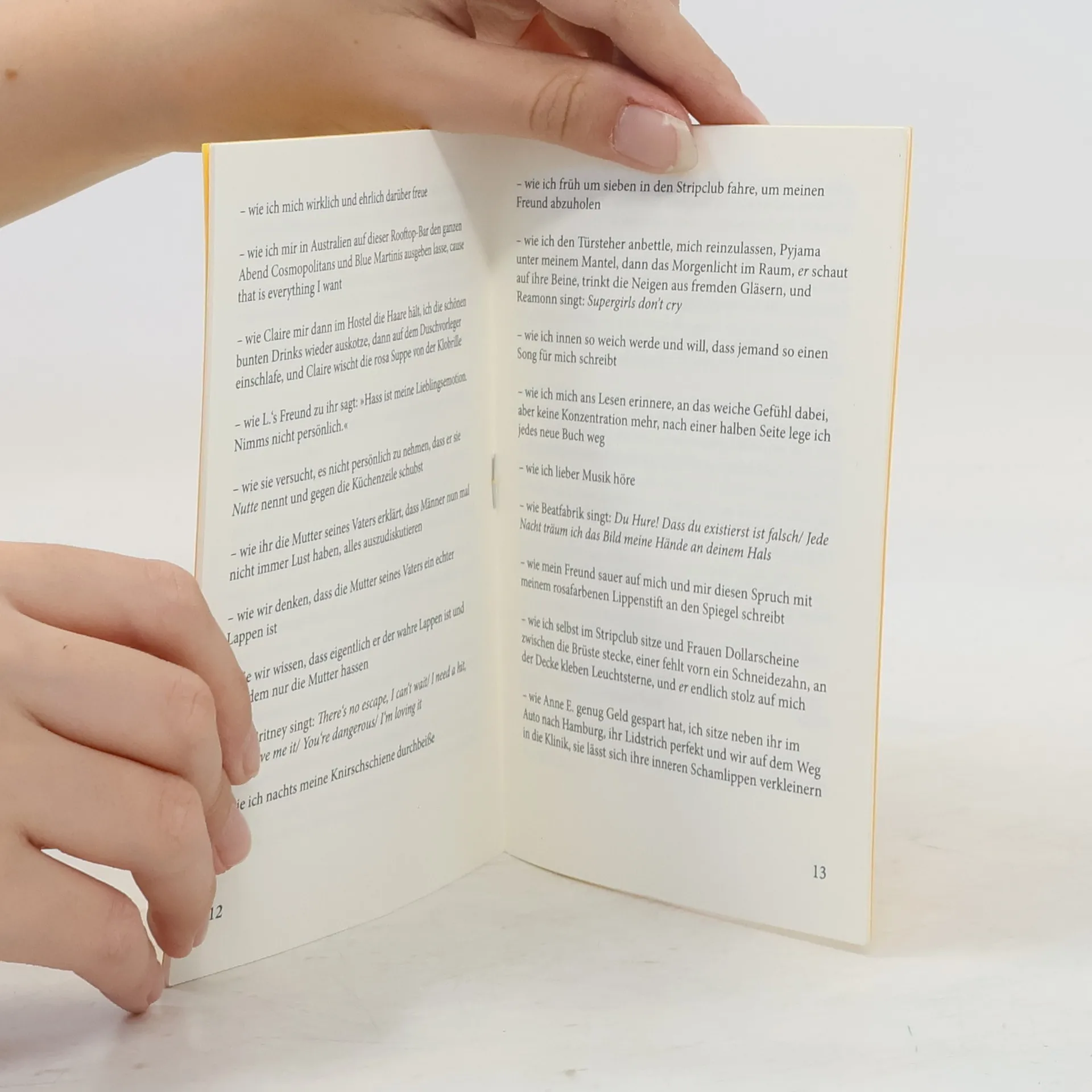 wie ich frau bin und immer eine meine Hand hält, meine Schulter streicht, meine Geschichten hört, an Küchentischen, an Schreibtischen, am Telefon, auf Sofakissen, Duschvorlegern und Parkbänken, immer eine, die mir Mut macht, der ich mein Herz ausschütte, an Sandstränden, in Badewannen, Betten, Zelten, auf Picknickdecken, immer eine, die da ist