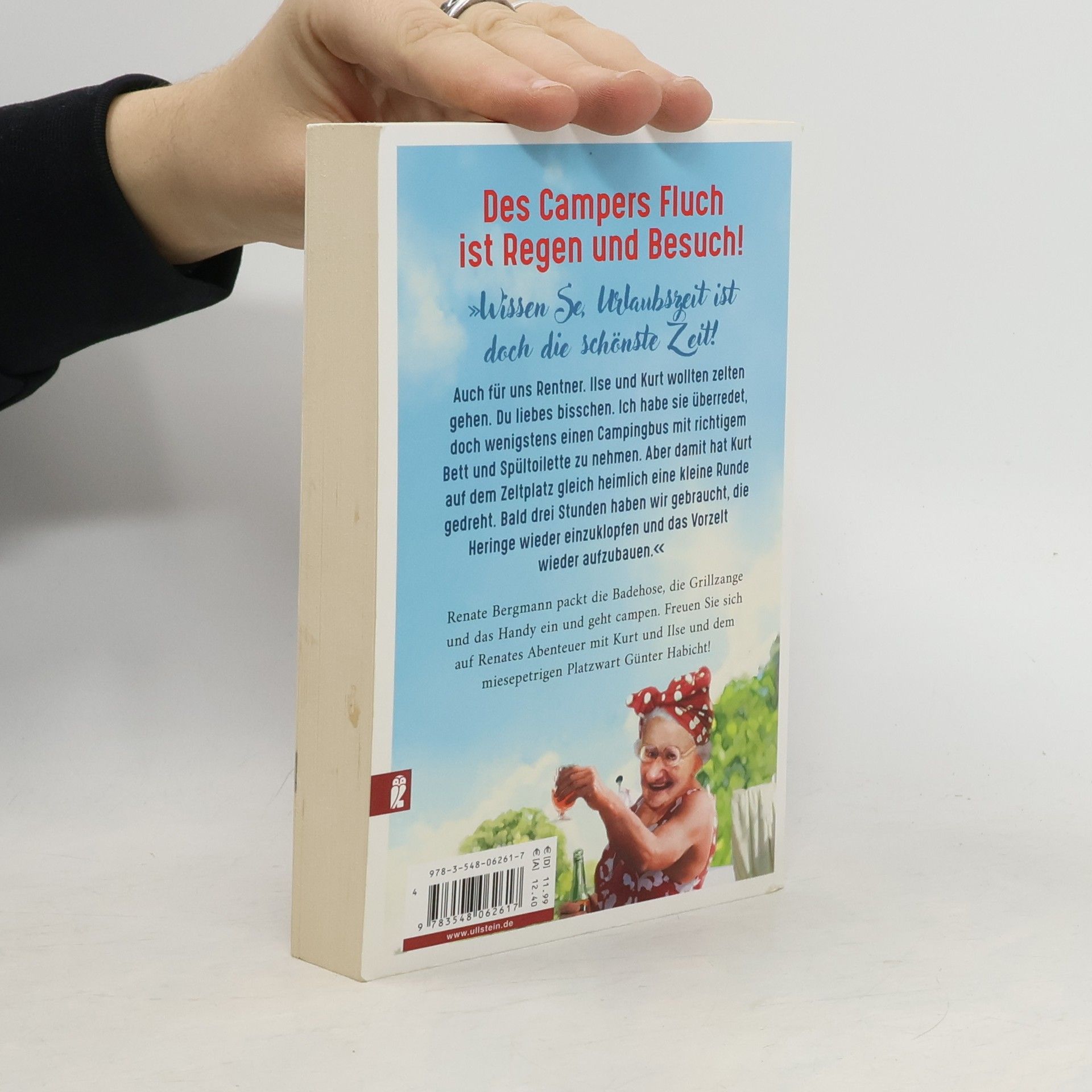 Des Campers Fluch ist Regen und Besuch! „Wissen Se, Urlaubszeit ist doch die schönste Zeit! Ich hör Sie schon sagen: Frau Bergmann, Sie als Rentnerin haben doch immer Urlaub!, aber das ist Unsinn: Wenn man sich wirklich erholen will, muss man mal raus. Ilse und Kurt wollten mit in die Sommerfrische, aber das war gar nicht so einfach, die wollten nämlich zelten. Du liebes bisschen. Ich habe sie überredet, doch wenigstens einen Campingbus mit richtigem Bett und Spültoilette zu nehmen. Aber damit hat Kurt auf dem Zeltplatz gleich heimlich eine kleine Runde gedreht. Bald drei Stunden haben wir gebraucht, die Heringe wieder einzuklopfen und das Vorzelt wieder aufzubauen.“ Renate Bergmann packt die Badehose, die Grillzange und das Handy ein und geht campen. Freuen Sie sich auf Renates Abenteuer mit Kurt und Ilse und dem miesepetrigen Platzwart Günter Habicht!