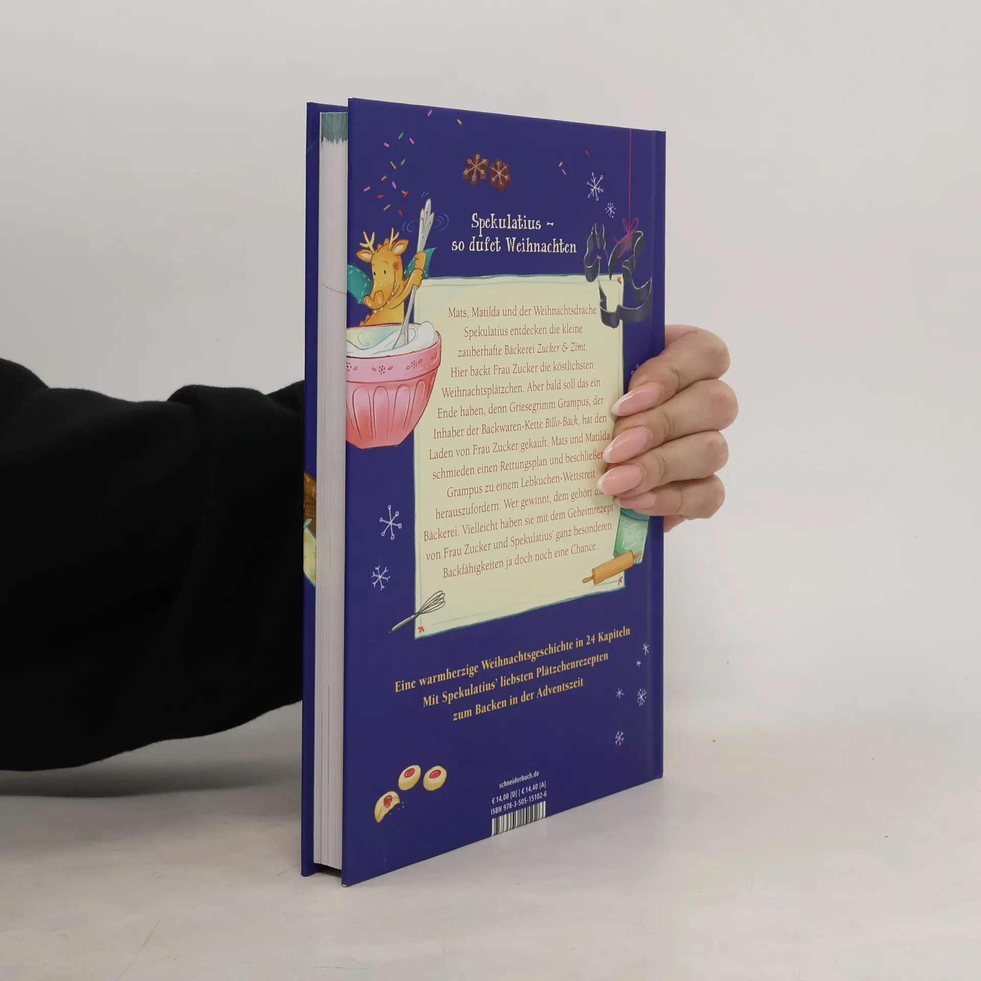 Plätzchen backen und Weihnachtsabenteuer mit Spekulatius In der Vorweihnachtszeit entdecken Mats, Matilda und Spekulatius die kleine zauberhafte Bäckerei „Zimt und Zucker“. Hier backt Frau Zimt die köstlichsten Weihnachtsplätzchen. Aber bald soll das alles ein Ende haben, denn der Inhaber der Backwaren-Kette „Billo-Back“ Griesegrimm Grampus hat den Laden von Frau Zimt gekauft. Mats und Matilda schmieden einen Rettungsplan und beschließen, Grampus zu einem Lebkuchen-Wettstreit herauszufordern. Wer gewinnt, dem gehört die Bäckerei. Vielleicht haben sie mit dem Geheimrezept von Frau Zimt und Spekulatius' ganz besonderen Backfähigkeiten ja doch noch eine Chance. Das perfekte Geschenk zur Adventszeit: Ein fröhlich buntes Weihnachtsabenteuer in 24 Kapiteln Ideal zum Vorlesen, reichhaltig bebildert Mit 11 besonderen Plätzchenrezepten Weitere Abenteuer mit Spekulatius (alle Bücher sind unabhängig voneinander lesbar) : Spekulatius, der Weihnachtsdrache: Ein Adventsbuch in 24 Kapiteln (ab 6 Jahren) Spekulatius, der Weihnachtsdrache, rettet das Fest in 24 Kapiteln (ab 6 Jahren) Spekulatius, der Weihnachtsdrache. Abenteuer auf der Weihnachtsinsel: Das erste Bilderbuch mit dem beliebten Weihnachtsdrachen (ab 4 Jahren) Spekulatius und Bammelchen, der Osterhase: Osterbilderbuch (ab 4 Jahren)