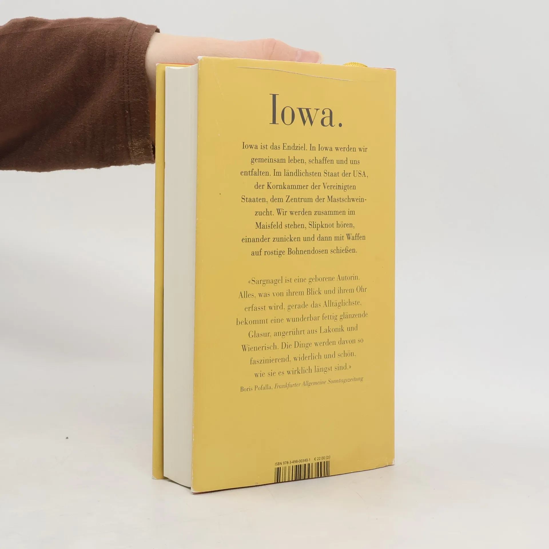 Das neue Buch der österreichischen Bestsellerautorin („Dicht“). Stefanie Sargnagels Blick auf die USA ist so unverwechselbar wie ihr Schreiben: Sarkastisch, schonungslos ehrlich und doch voll Sympathie bringt sie uns das ländliche Amerika nahe und berichtet nebenbei herzerwärmend über die Lebensnotwendigkeit von Frauenfreundschaften. 2022 tauscht Stefanie Sargnagel widerstrebend das bequeme Wiener Sofa gegen ein Flugticket in die USA ein. In Iowa soll sie an einem College mitten im Nirgendwo Creative Writing unterrichten. In der Kleinstadt Grinnell mit ihren 8000 Einwohnern gibt es außer endlosen Maisfeldern: nichts. Mit von der Partie ist Musiklegende Christiane Rösinger, und gemeinsam machen die beiden sich auf, das Nichts zu erkunden. Sie finden übergewichtige freundliche Einheimische, traditionelle Geschlechterrollen, Riesensupermärkte, unglaubliche Würstchen und ein Glas voller eingelegter Truthahnmägen. Mit korrigierenden Fußnoten von Christiane Rösinger.