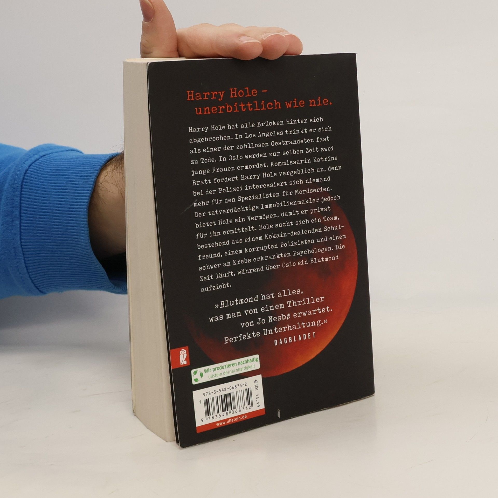 Harry Hole – unerbittlich wie nie. Harry Hole hat alle Brücken hinter sich abgebrochen. In Los Angeles trinkt er sich als einer der zahllosen Gestrandeten fast zu Tode. In Oslo werden zur selben Zeit zwei junge Frauen ermordet. Kommissarin Katrine Bratt fordert Harry Hole vergeblich an, denn bei der Polizei interessiert sich niemand mehr für den Spezialisten für Mordserien. Der tatverdächtige Immobilienmakler jedoch bietet Hole ein Vermögen, damit er privat für ihn ermittelt. Hole sucht sich ein Team, bestehend aus einem Kokain-dealenden Schulfreund, einem korrupten Polizisten und einem schwer an Krebs erkrankten Psychologen. Die Zeit läuft, während über Oslo ein Blutmond aufzieht. Der Bestseller aus Skandinavien, der Sie zum Schaudern bringt.