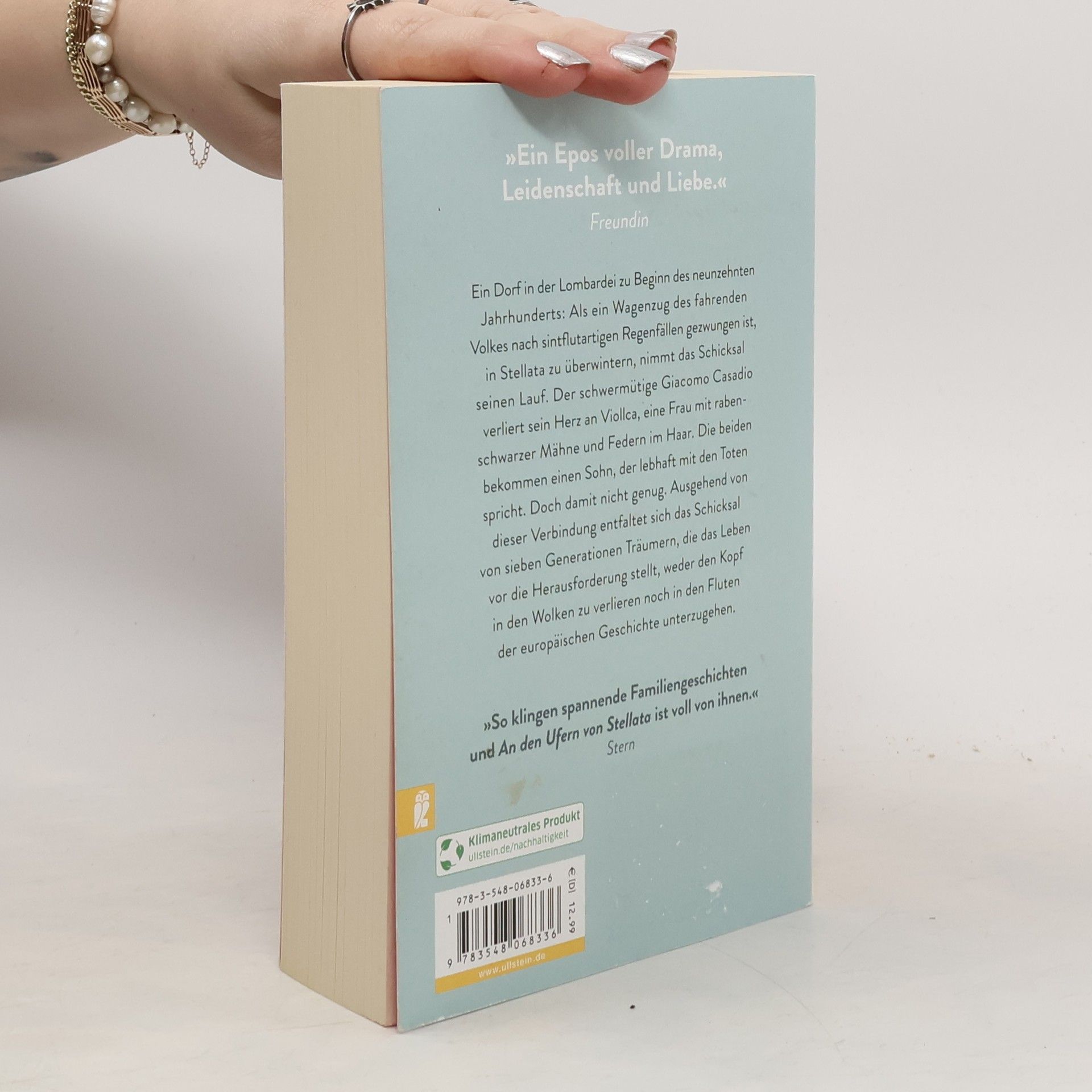 »Ein Epos voller Drama, Leidenschaft und Liebe.« Freundin Ein Dorf in der Lombardei zu Beginn des neunzehnten Jahrhunderts: Als ein Wagenzug des fahrenden Volkes nach sintflutartigen Regenfällen gezwungen ist, in Stellata zu überwintern, nimmt das Schicksal seinen Lauf. Der schwermütige Giacomo Casadio verliert sein Herz an Viollca, eine Frau mit rabenschwarzer Mähne und Federn im Haar. Die beiden bekommen einen Sohn, der sich am Grab seines Vaters weiter lebhaft mit ihm – und mit anderen Toten – unterhält. Doch damit nicht genug. Für ihren Enkel Achill, der das Gewicht eines Atemzugs messen will, und Neve, die mitten im Sommer in einem Schneesturm zur Welt kommt, und auch für die kühne Donata, die über ihren Idealen sich selbst vergisst, hält das Leben die Herausforderung bereit, weder den Kopf in den Wolken zu verlieren noch in den Fluten unterzugehen. »So klingen spannende Familiengeschichten und An den Ufern von Stellata ist voll von ihnen.« Stern