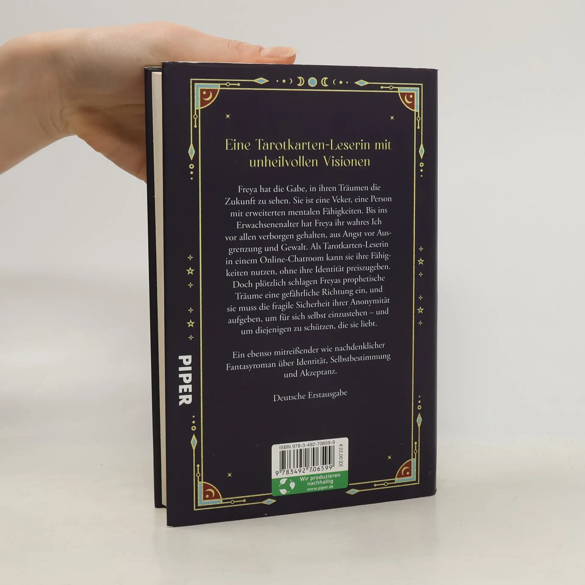 Eine Tarotkarten-Leserin mit unheilvollen Visionen! Freya hat die Gabe, in ihren Träumen die Zukunft zu sehen. Sie ist eine Veker, eine Person mit erweiterten mentalen Fähigkeiten. Bis ins Erwachsenenalter hat Freya ihr wahres Ich vor allen verborgen gehalten, aus Angst vor Ausgrenzung und Gewalt. Als Tarotkarten-Leserin in einem Online-Chatroom kann sie ihre Fähigkeiten nutzen, ohne ihre Identität preiszugeben. Doch plötzlich schlagen Freyas prophetische Träume eine gefährliche Richtung ein, und sie muss die fragile Sicherheit ihrer Anonymität aufgeben, um für sich selbst einzustehen – und um diejenigen zu schützen, die sie liebt. Ein ebenso mitreißender wie nachdenklicher Fantasyroman über Identität, Selbstbestimmung und Akzeptanz.