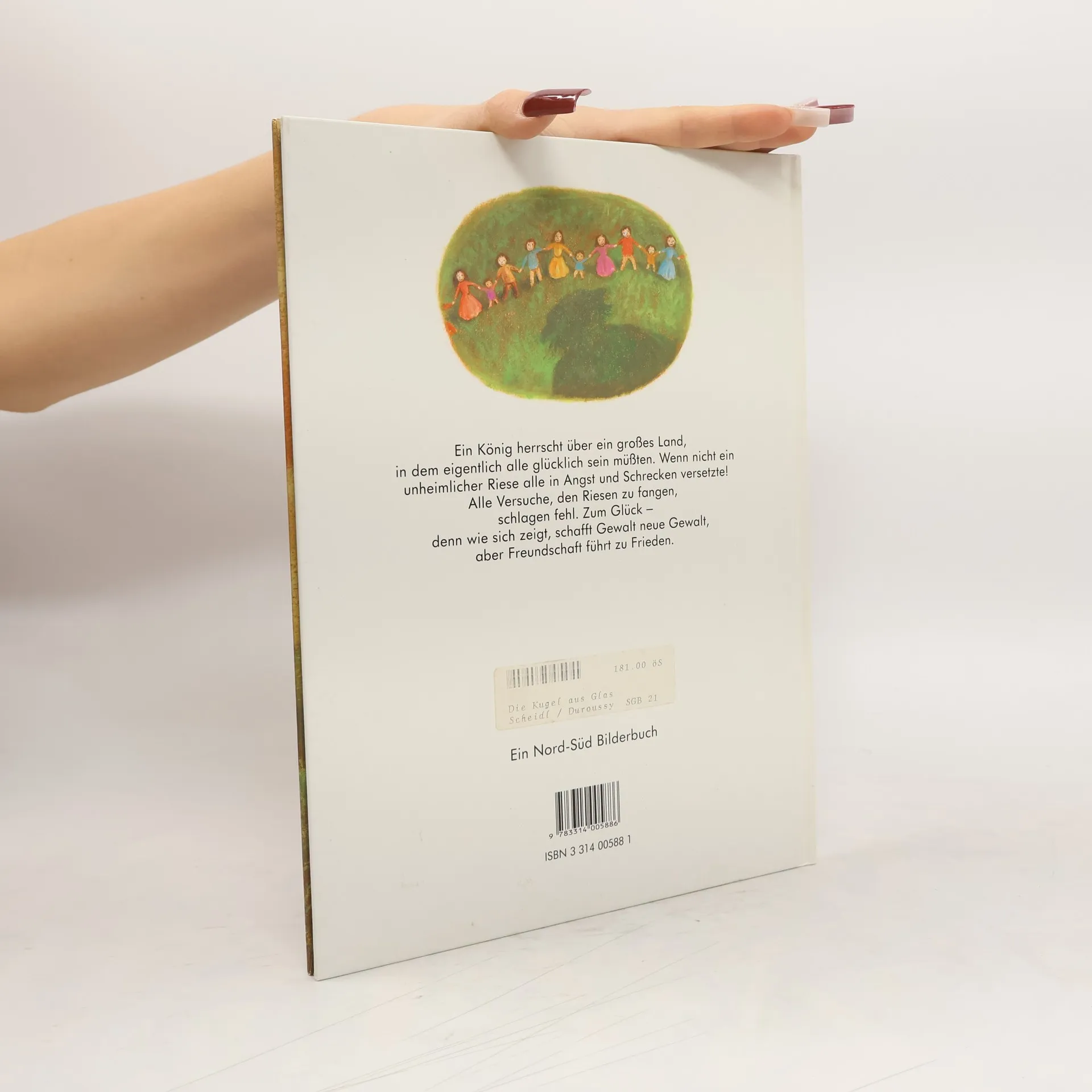 Der König und sein Volk könnten glücklich sein, wäre da nicht der unheimliche Riese, der hinter den 13 Hügeln wohnt. Die Furcht wächst, obwohl der Riese noch niemals jemandem etwas getan hat. So schickt der König Freiwillige aus, den Unhold zu vernichten. Weder der Schmied mit seinem Schwert noch der Seiler mit seinen Fesseln haben Erfolg. Im Gegenteil, sie machen den Riesen erst zornig. Der Glasbläser bringt dem Riesen ein Geschenk und sichert so den Frieden. Man lernt sich kennen und braucht sich nicht mehr voreinander zu fürchten. Entsprechend seinem Motto "Nicht Feind ist der Nächste, er ist Freund" zeigt die märchenhafte Geschichte, wie dumm und gefährlich Vorurteile sein können. Die Kreidezeichnungen mit den grossäugigen, etwas plumpen Figuren können nicht ganz überzeugen. - Überall möglich